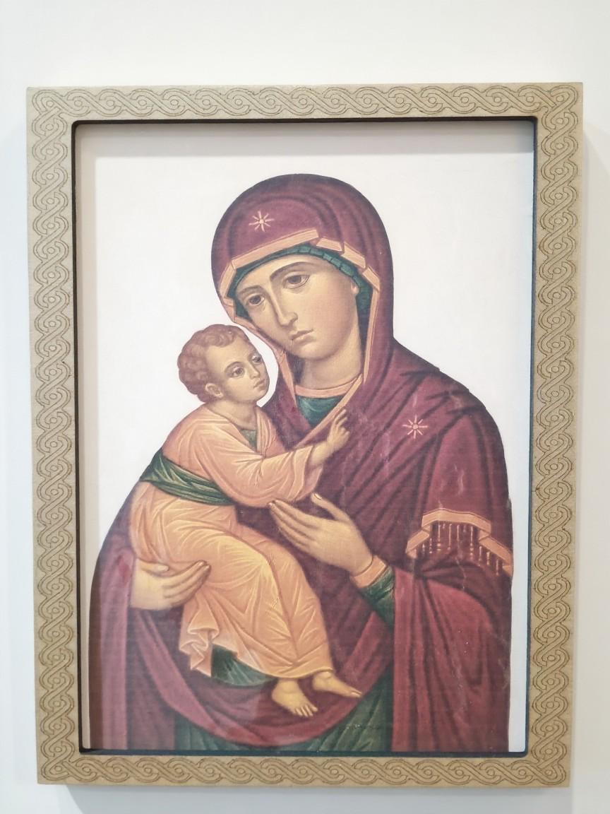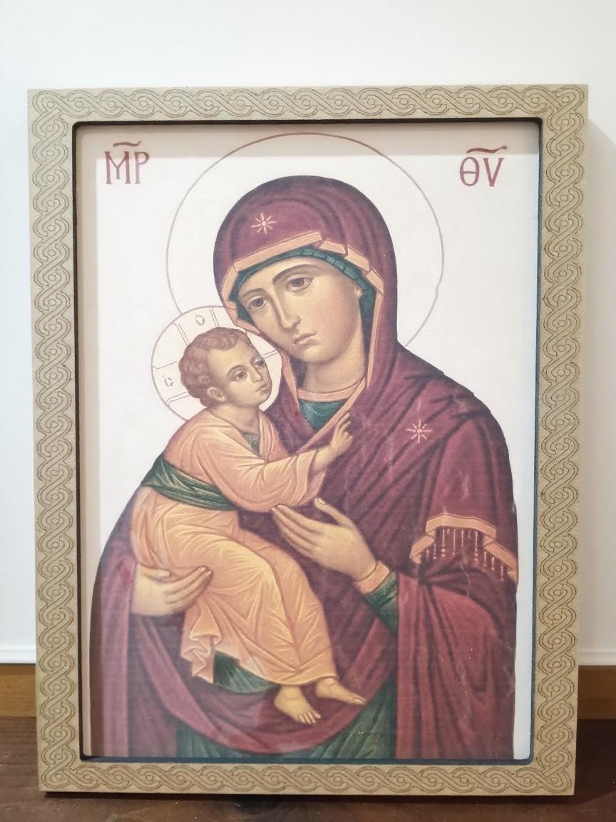 Handmade Orthodox Icon of the Virgin Mary with Christ Child – a unique piece of sacred art that combines tradition and craftsmanship. Printed on high-quality vinyl with heat press and mounted on durable plywood, framed with a detailed MDF border made with precision laser cutting.