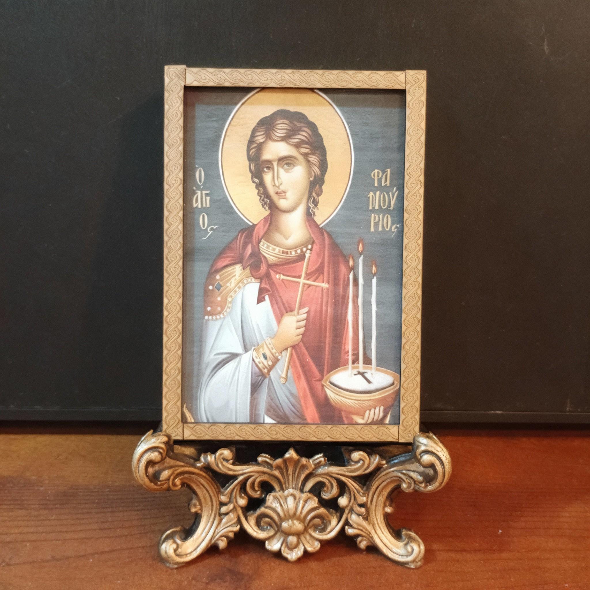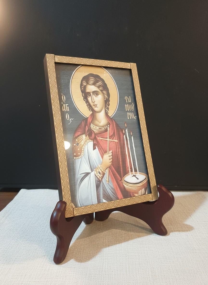 This beautiful Orthodox icon of Saint Phanourios is crafted from high-quality plywood with a laser cut wooden frame. The image is heat-pressed on vinyl, ensuring durability and vibrant colors. Available in two sizes (14x20 cm and 21x27 cm), it’s a meaningful piece of faith, perfect for home décor, spiritual gifts, or church use.