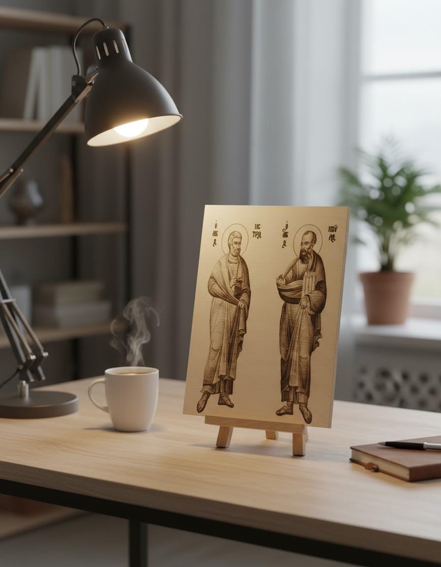 Handmade wooden icon of Saint Peter and Saint Paul crafted with the art of pyrography. This Orthodox Christian icon is made on quality natural wood, combining tradition with craftsmanship. Perfect for a religious gift, home altar, or as a spiritual decoration. Available in 2 sizes: 14x20 cm & 21x27 cm.