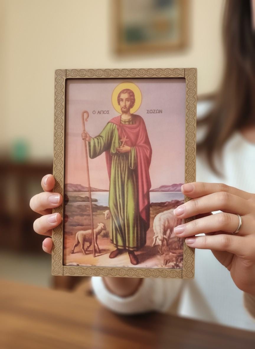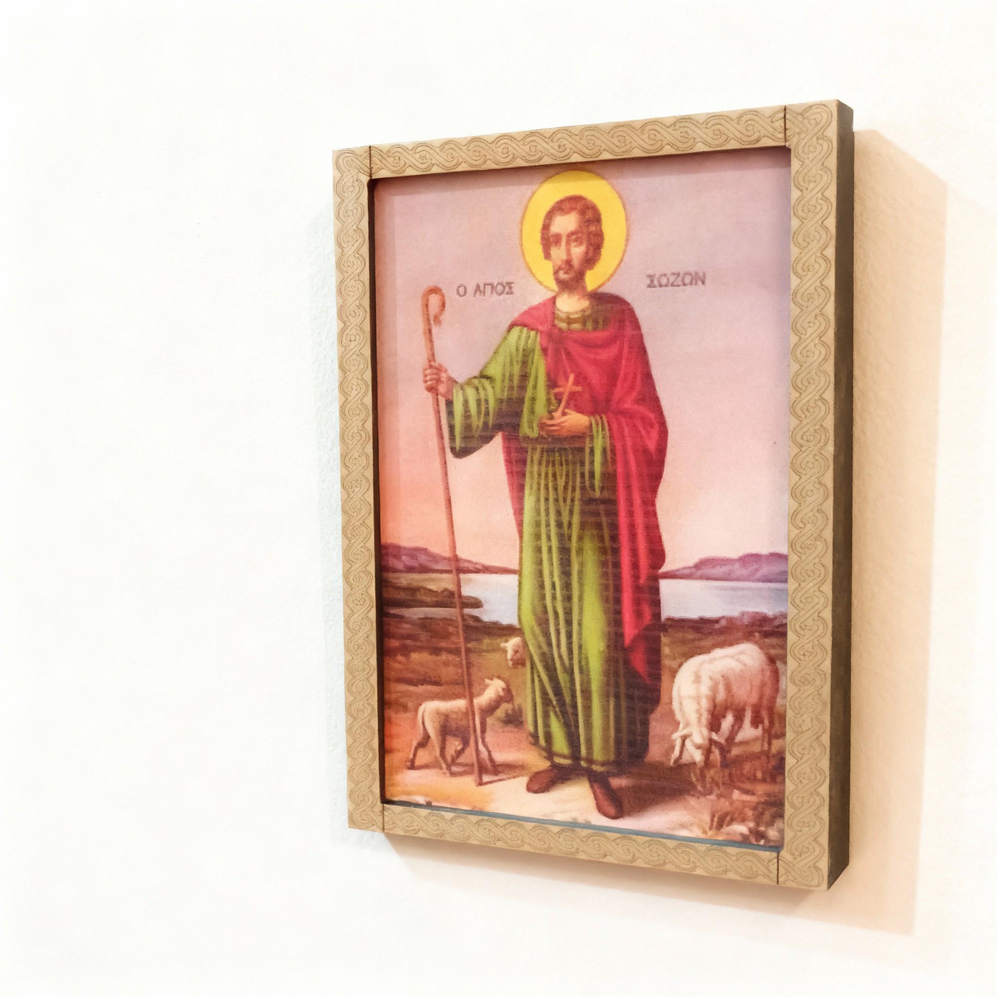 This beautiful handmade wooden icon depicts Saint Sozon, crafted from plywood, MDF, and thermal vinyl. Each piece is carefully made with precision laser cutting and high-quality finishing.