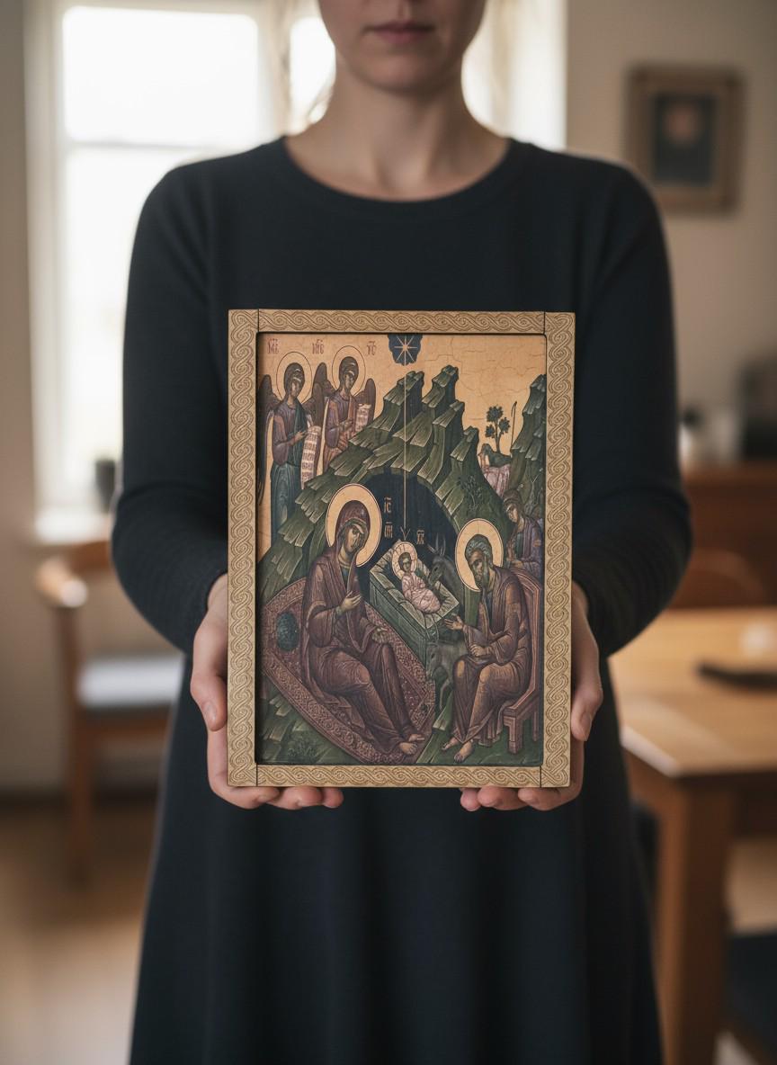 Celebrate the true meaning of Christmas with this beautiful wooden icon of the Nativity of Jesus.