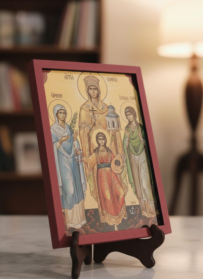 Discover the beauty and deep spirituality of this unique, handmade wooden icon of Hagia Sophia (Sophia) and her three daughters: Pistis (Faith), Elpidas (Hope) and Agapi (Love).