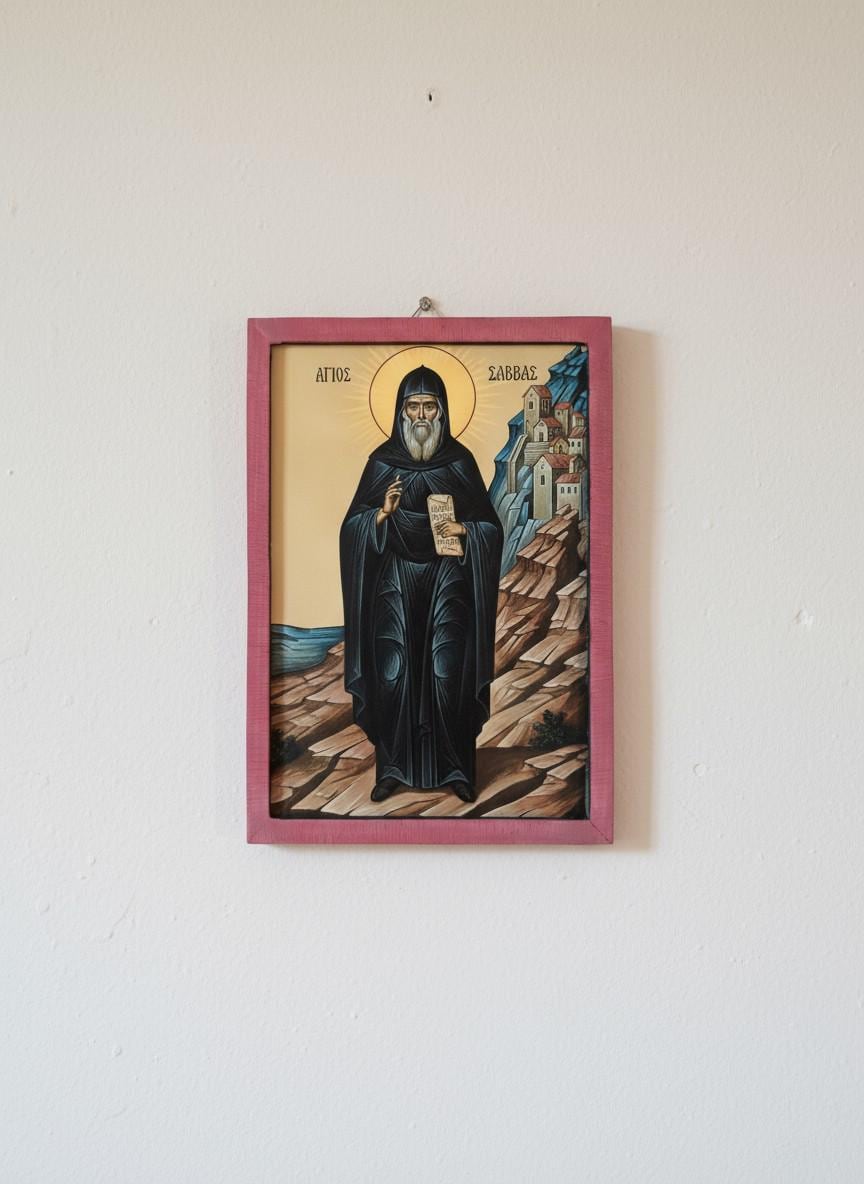 Saint Savvas, protector of monks and miracle worker, brings peace, faith, and divine strength to your space through this beautiful wooden icon.