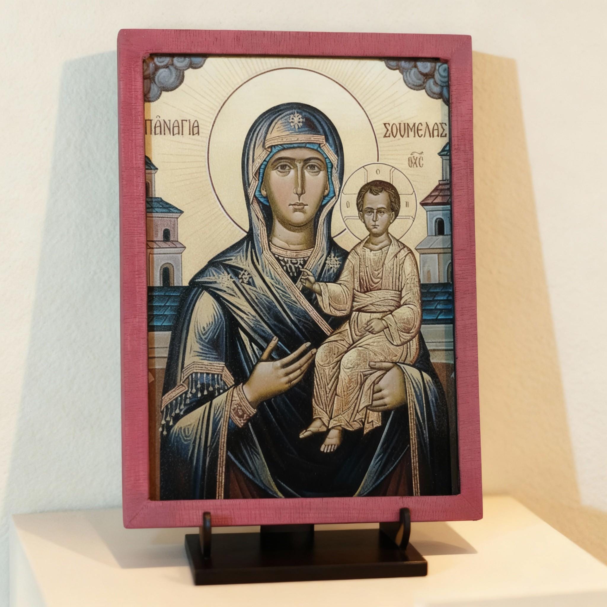 Handmade wooden icon of Virgin Mary Soumela, protector of Pontus and a symbol of faith, hope, and divine protection.