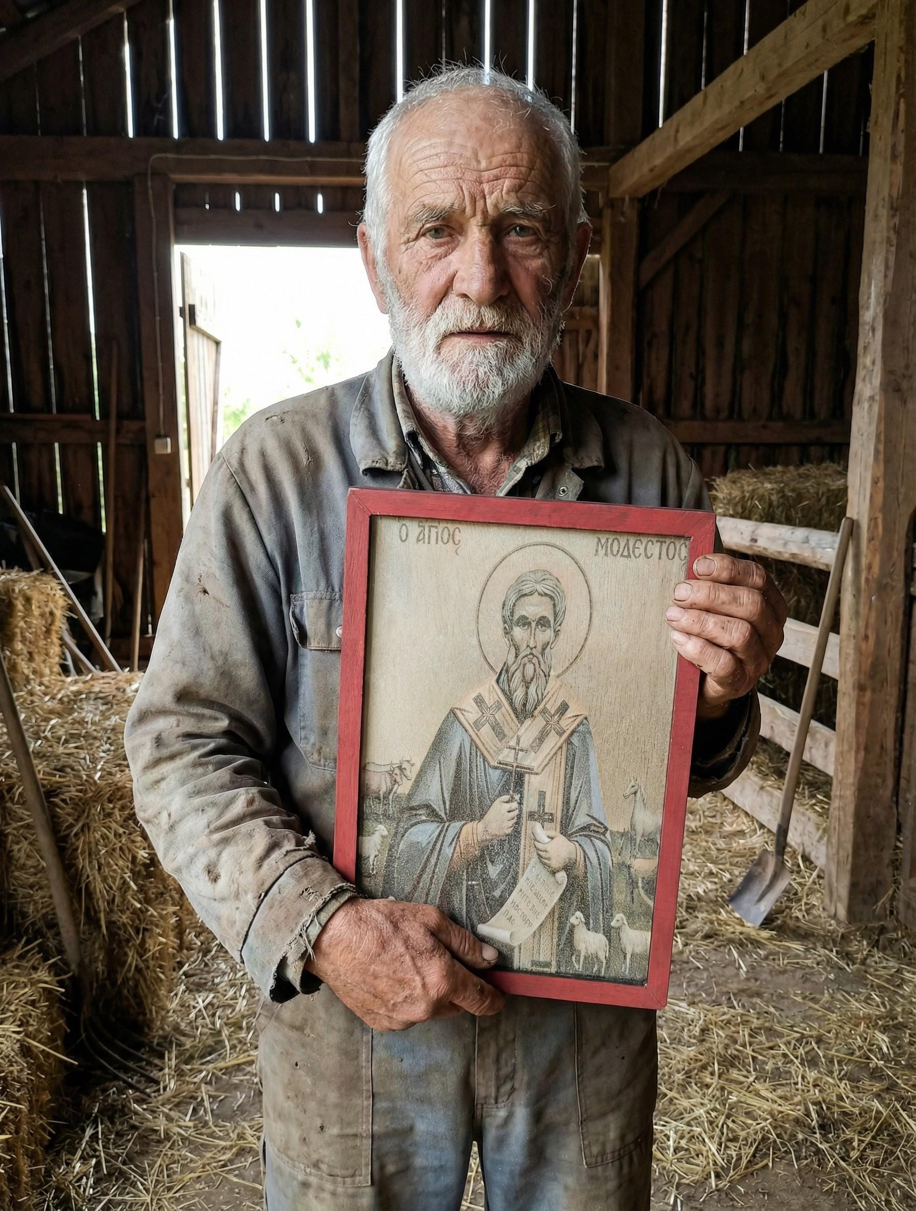 Handmade wooden icon of Saint Modestos, the protector of animals and livestock. Saint Modestos served as Patriarch of Jerusalem and is known for his miracles and blessings over animals, farmers, and all who work close to nature.