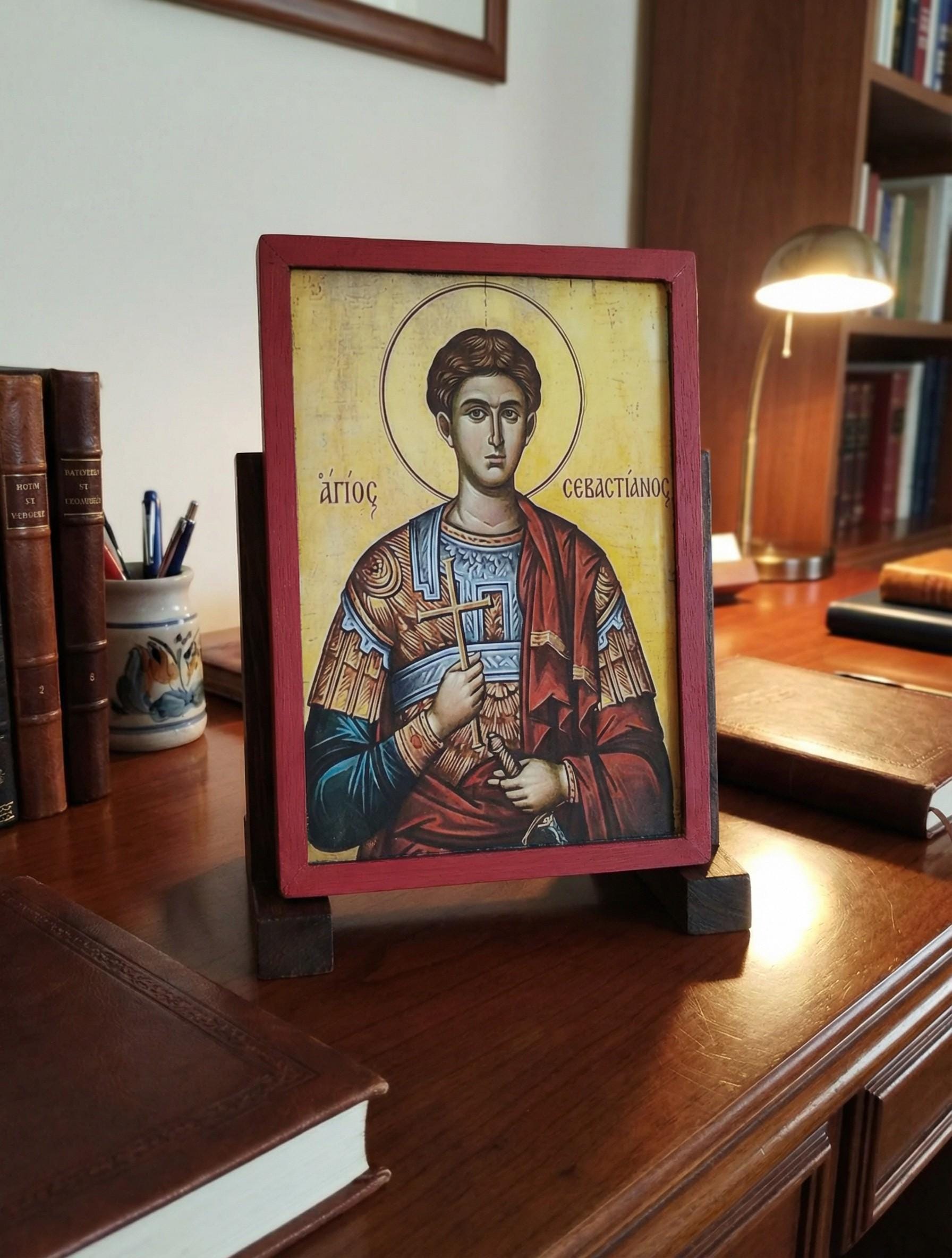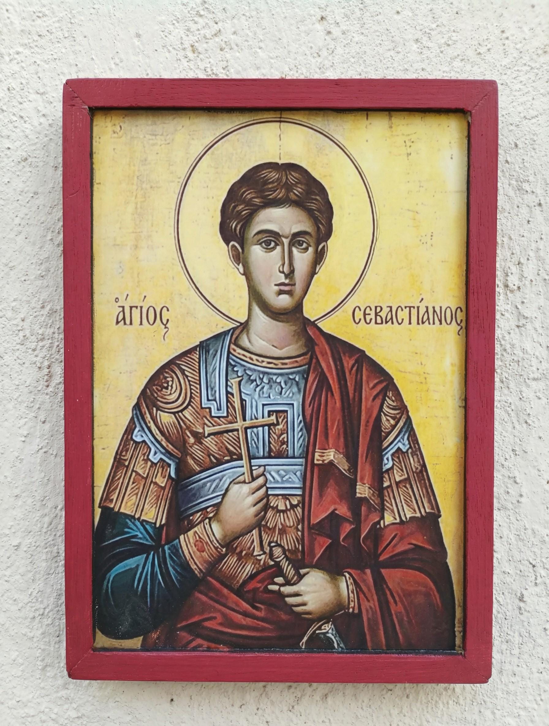 Handmade wooden icon of Saint Sebastian, crafted with high-quality heat-transfer printing on wood and a beautifully finished red wooden frame.