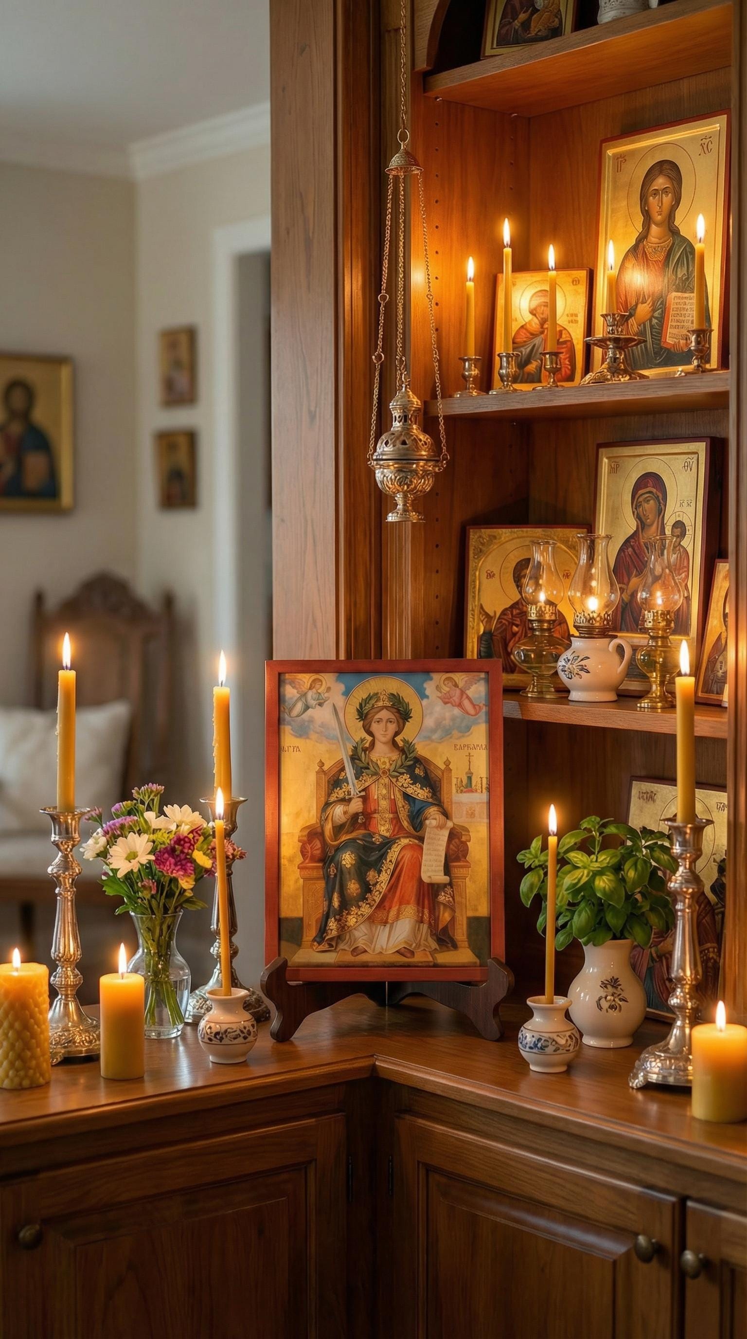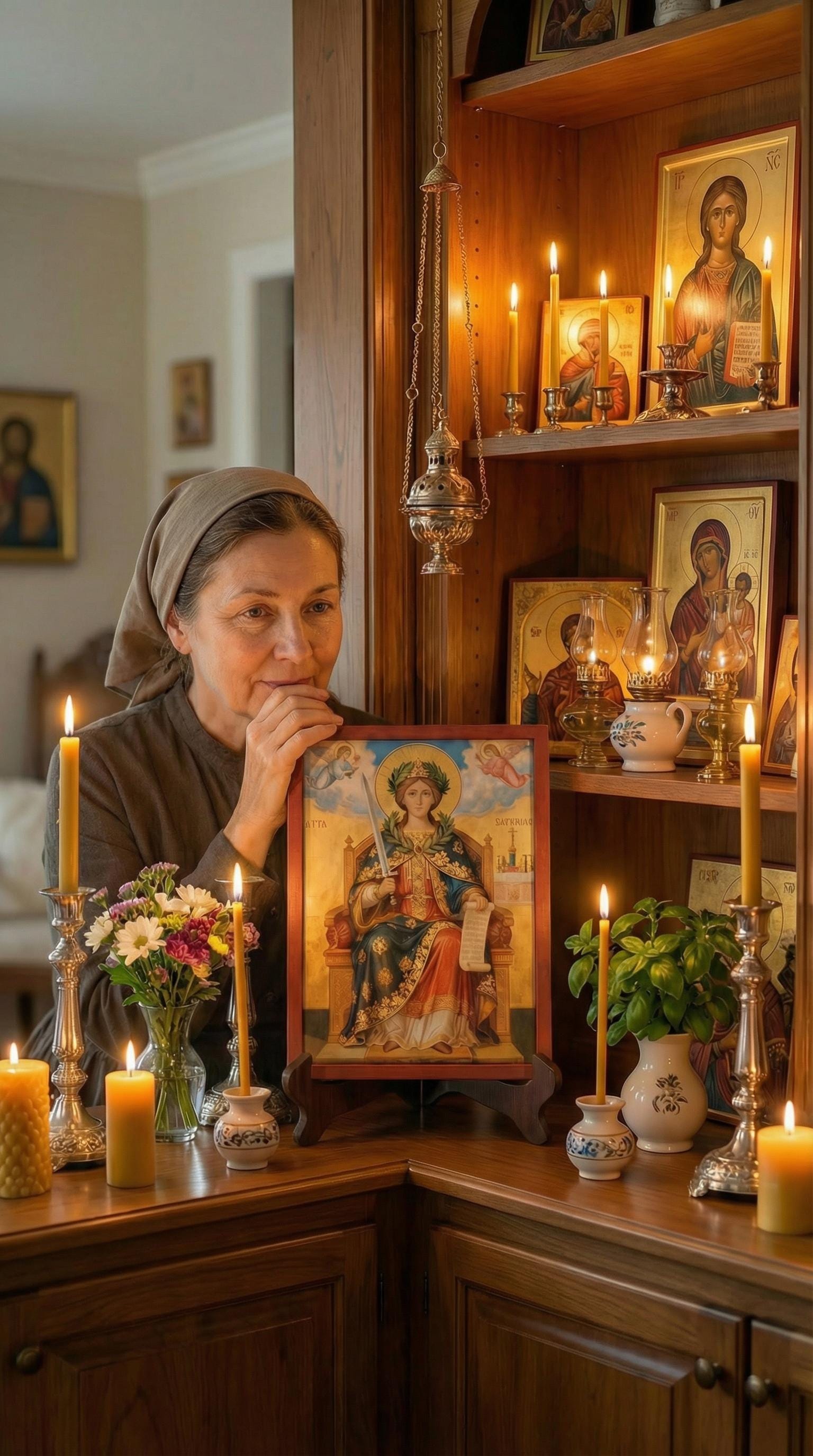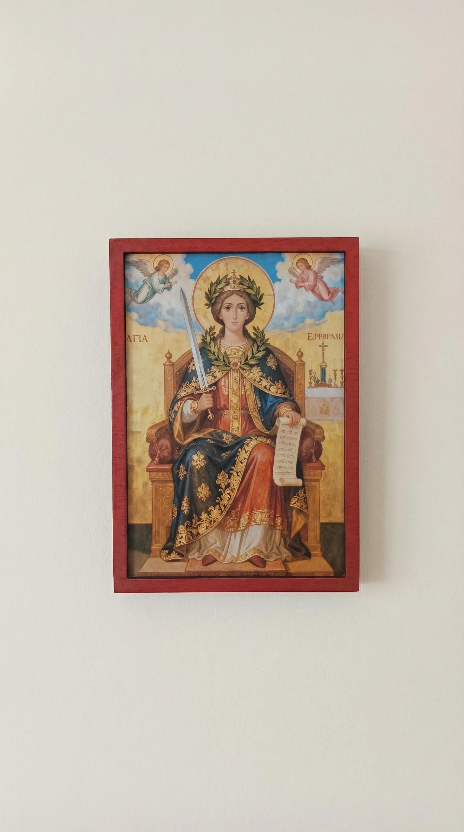 This handmade wooden icon depicts Saint Euphrasia, an important Orthodox saint known for her purity, humility, and unwavering devotion to God.