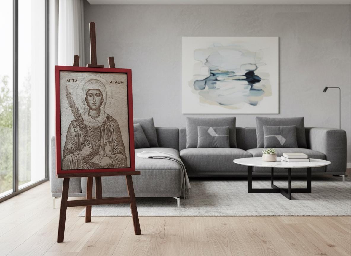 This handmade wooden icon of Saint Agatha is created using laser engraving pyrography, carefully capturing her sacred image on natural wood. Each piece is unique, highlighting the warmth and authenticity of true craftsmanship.