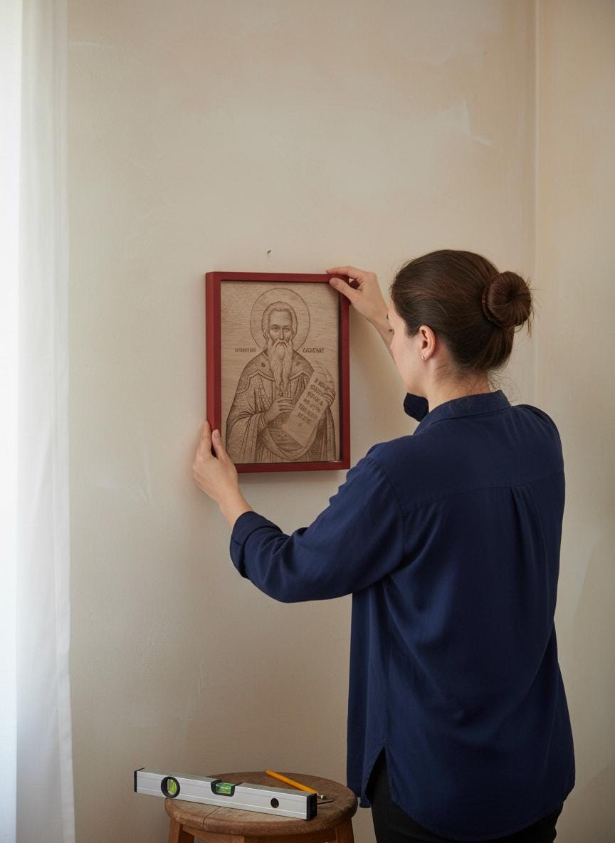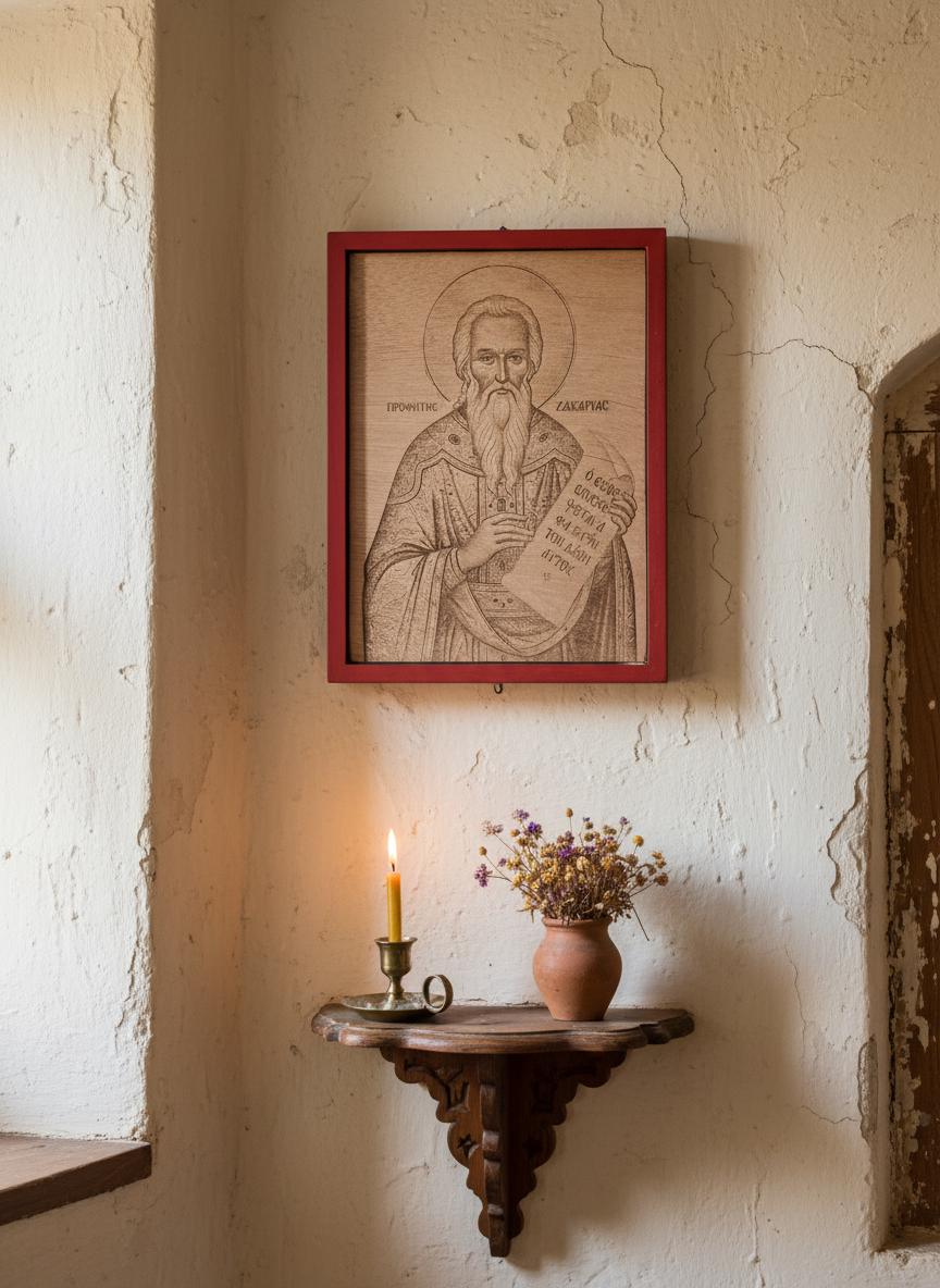 Handmade wooden icon of Prophet Zechariah, carefully engraved with high-precision laser pyrography on natural wood. The artwork reflects the simplicity and spiritual depth of Orthodox iconography, offering a timeless piece of faith and devotion.