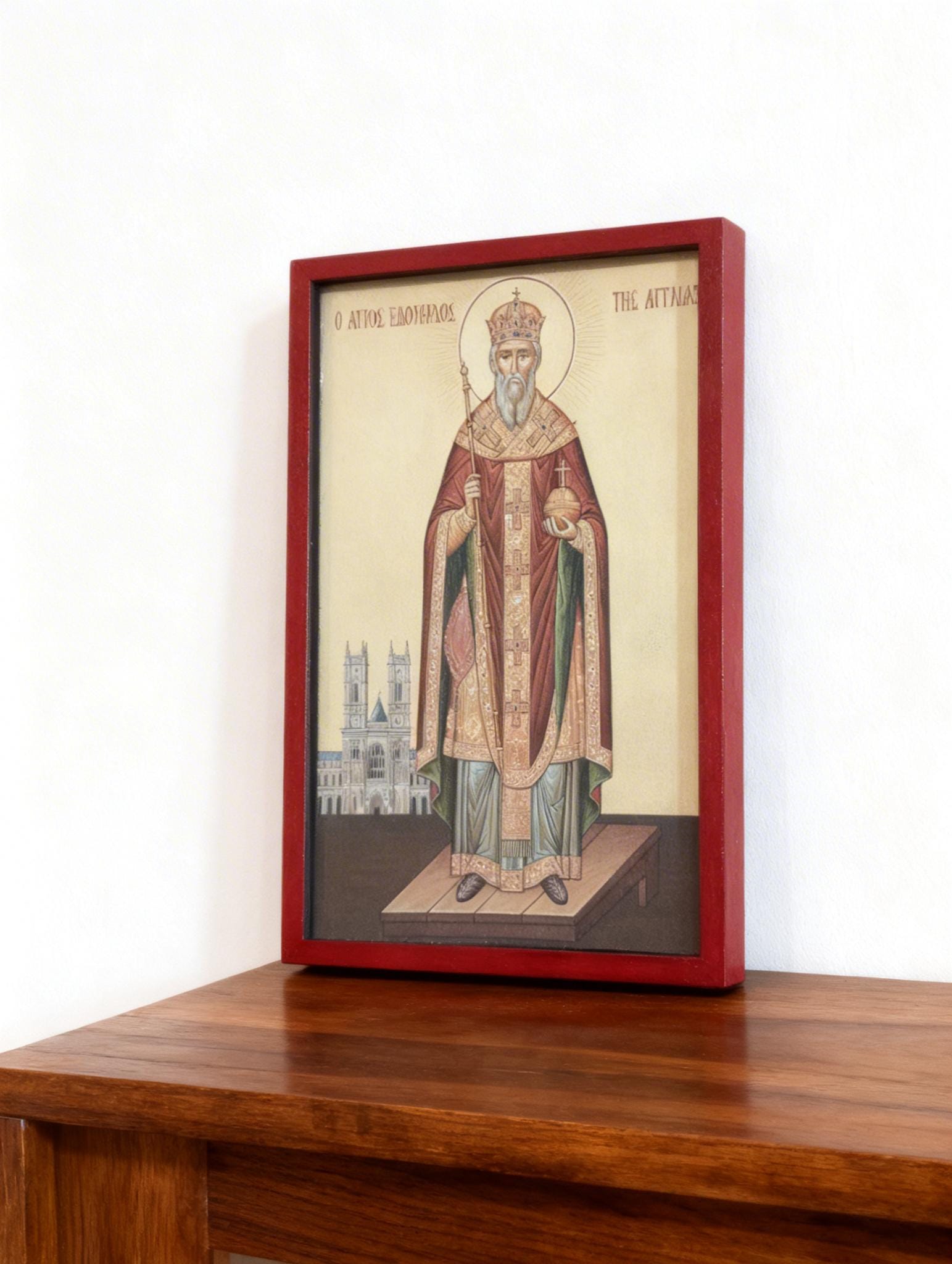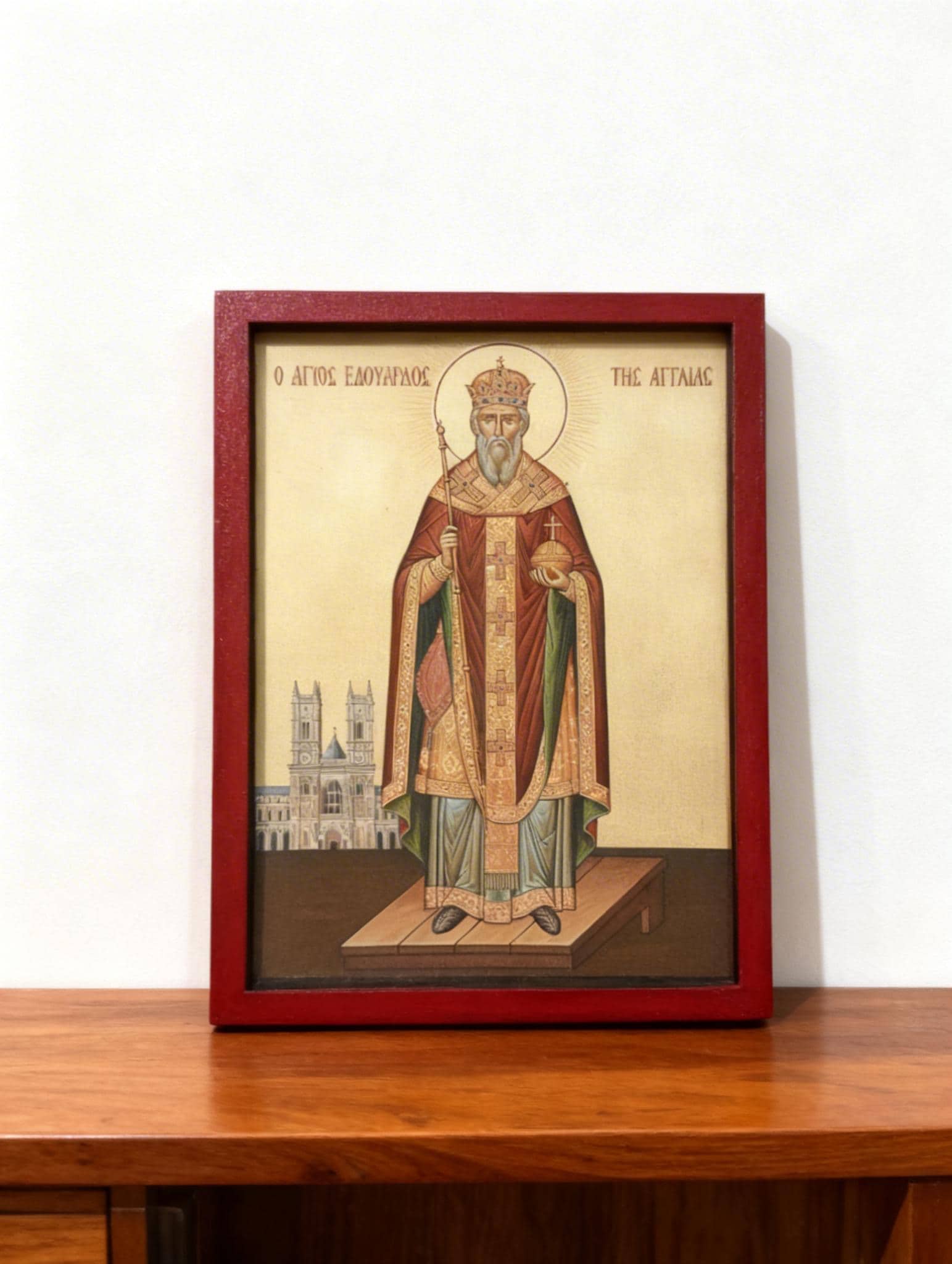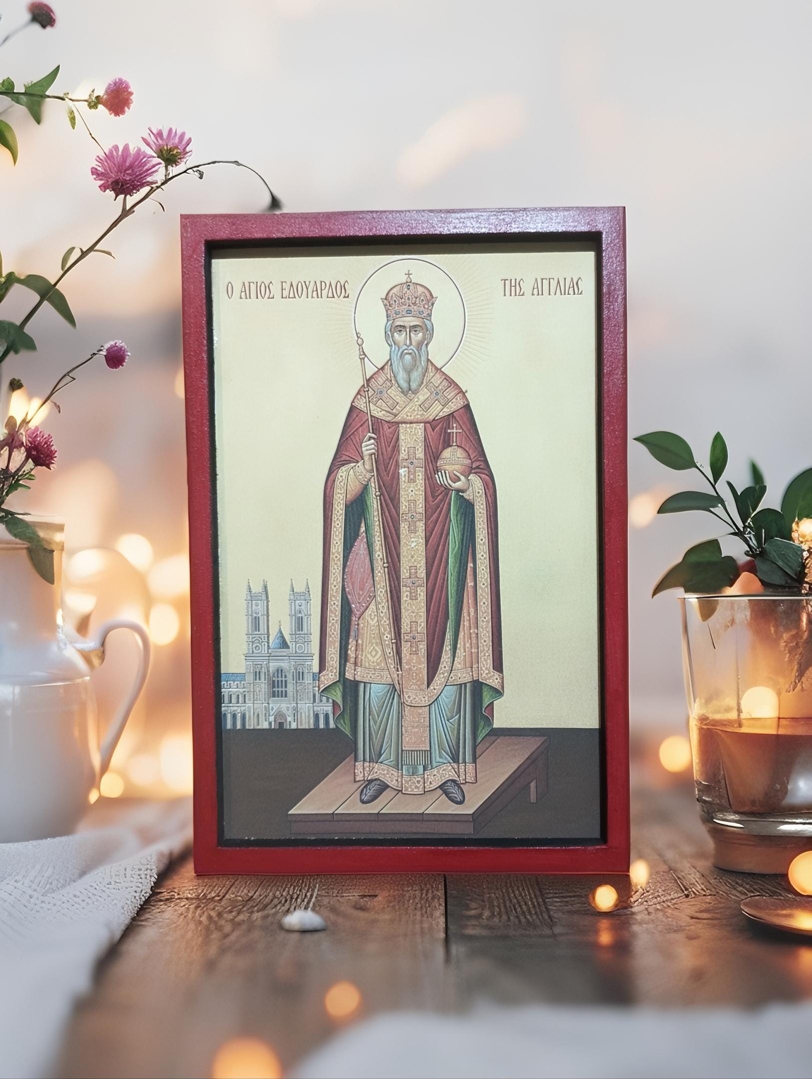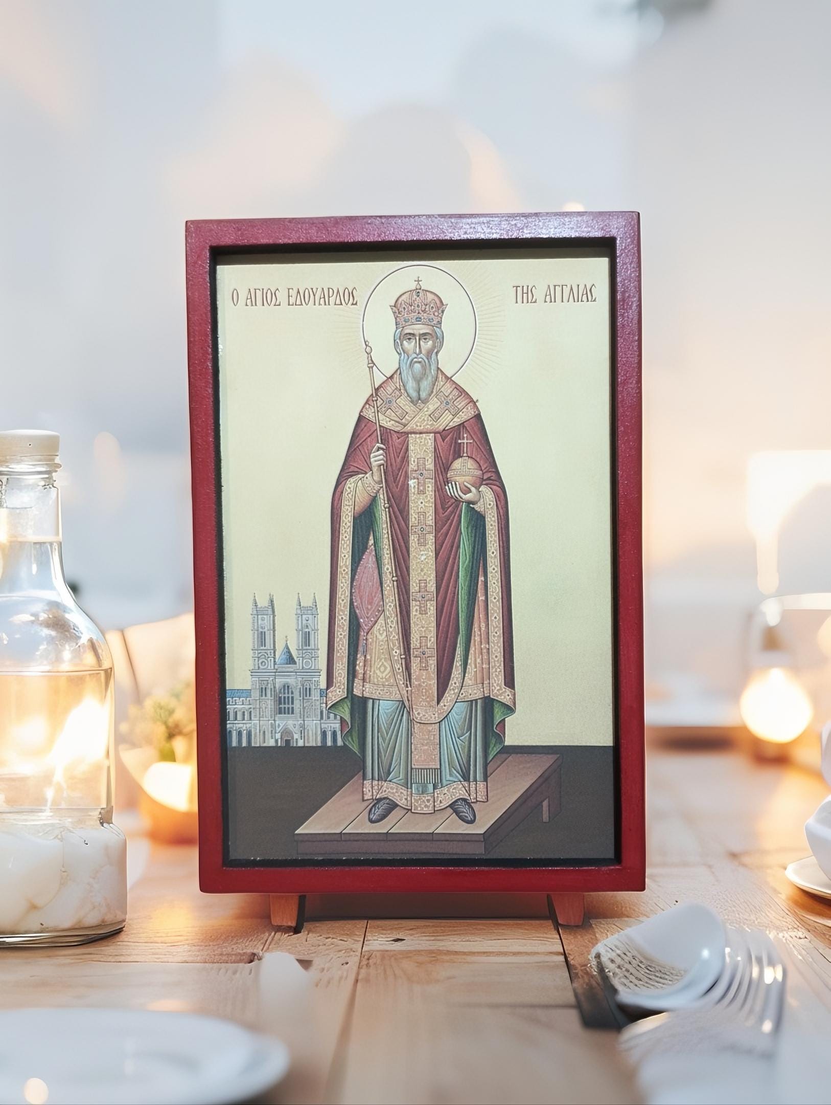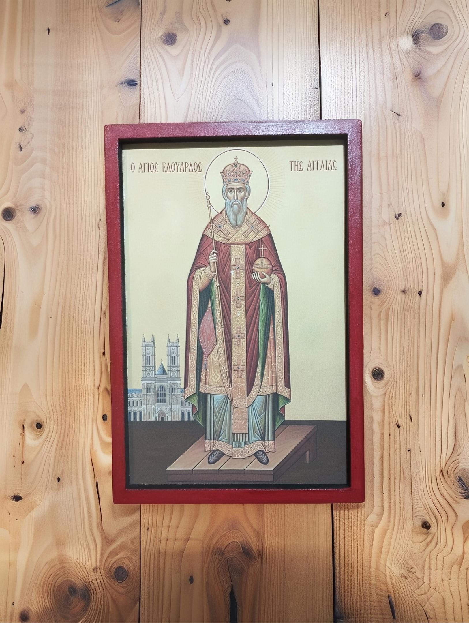 This handmade wooden icon of Saint Edward the Confessor, King of England, is created using the vinyl heat transfer technique on carefully prepared wood, giving the image clarity, depth, and durability.