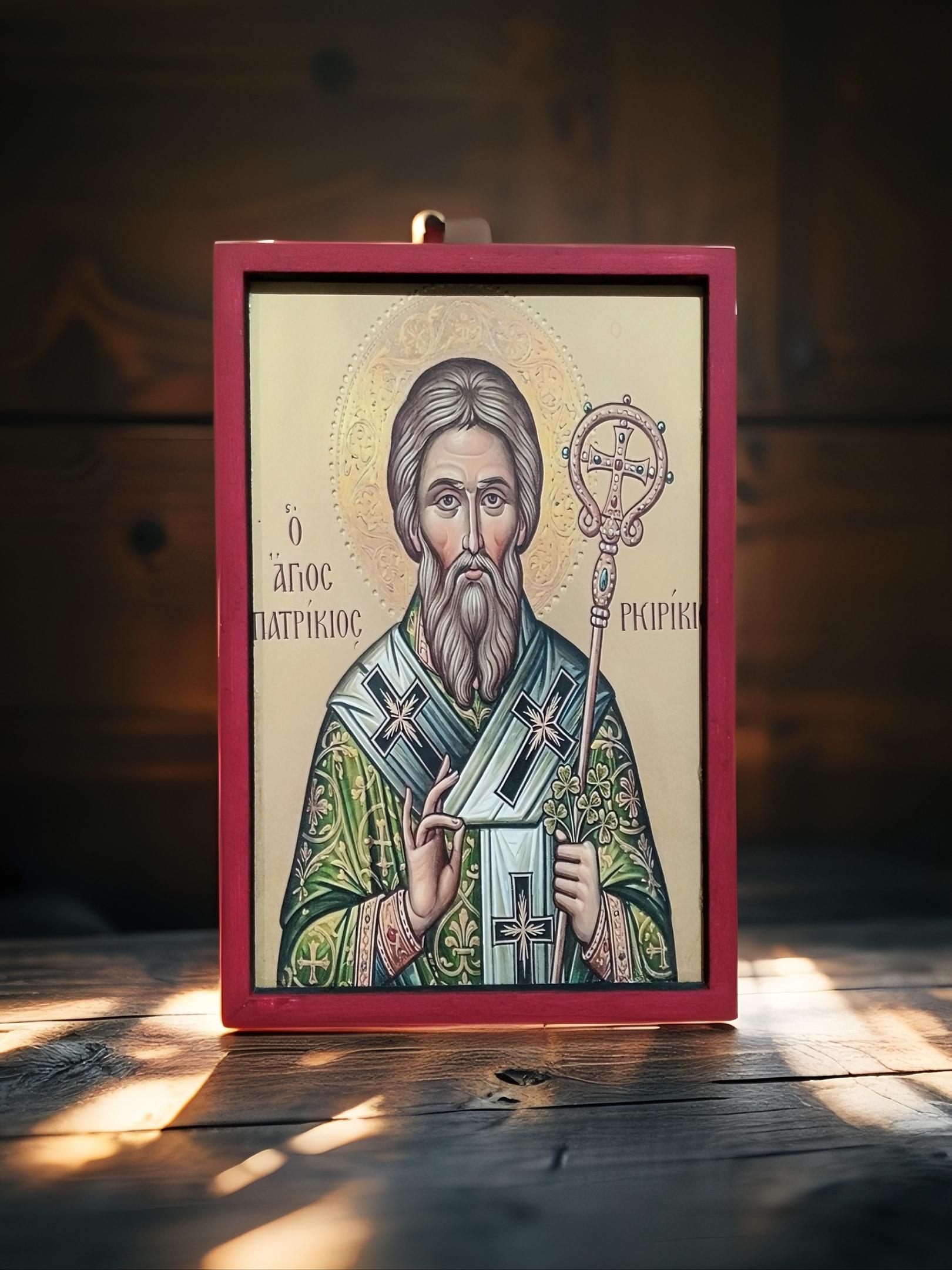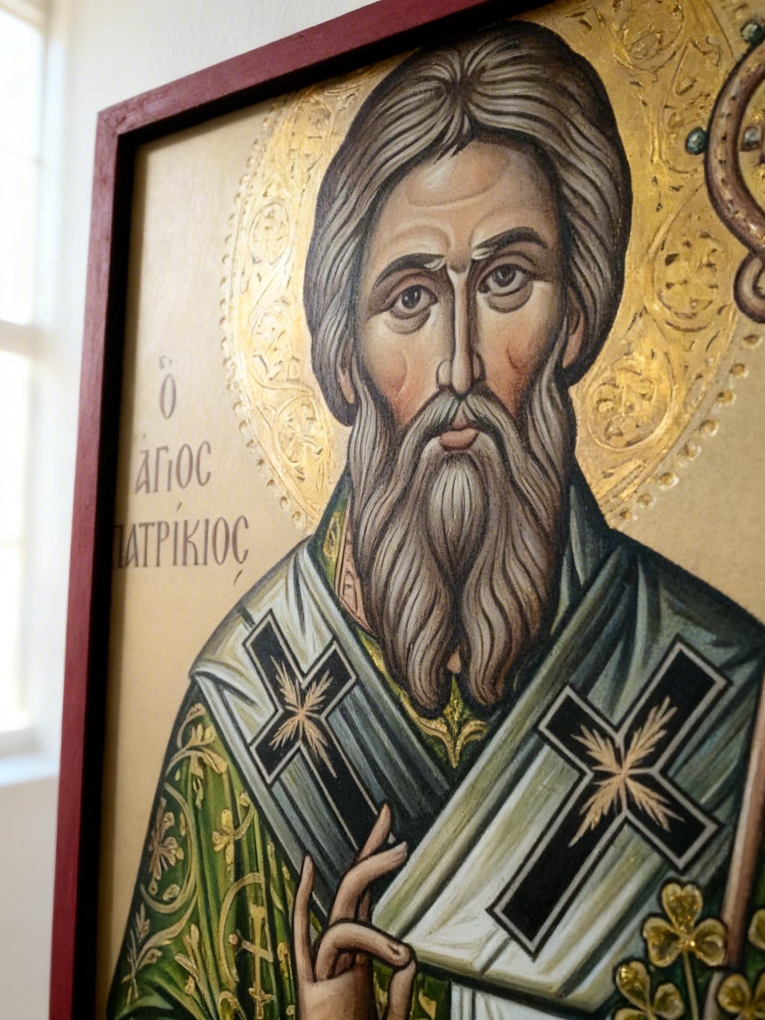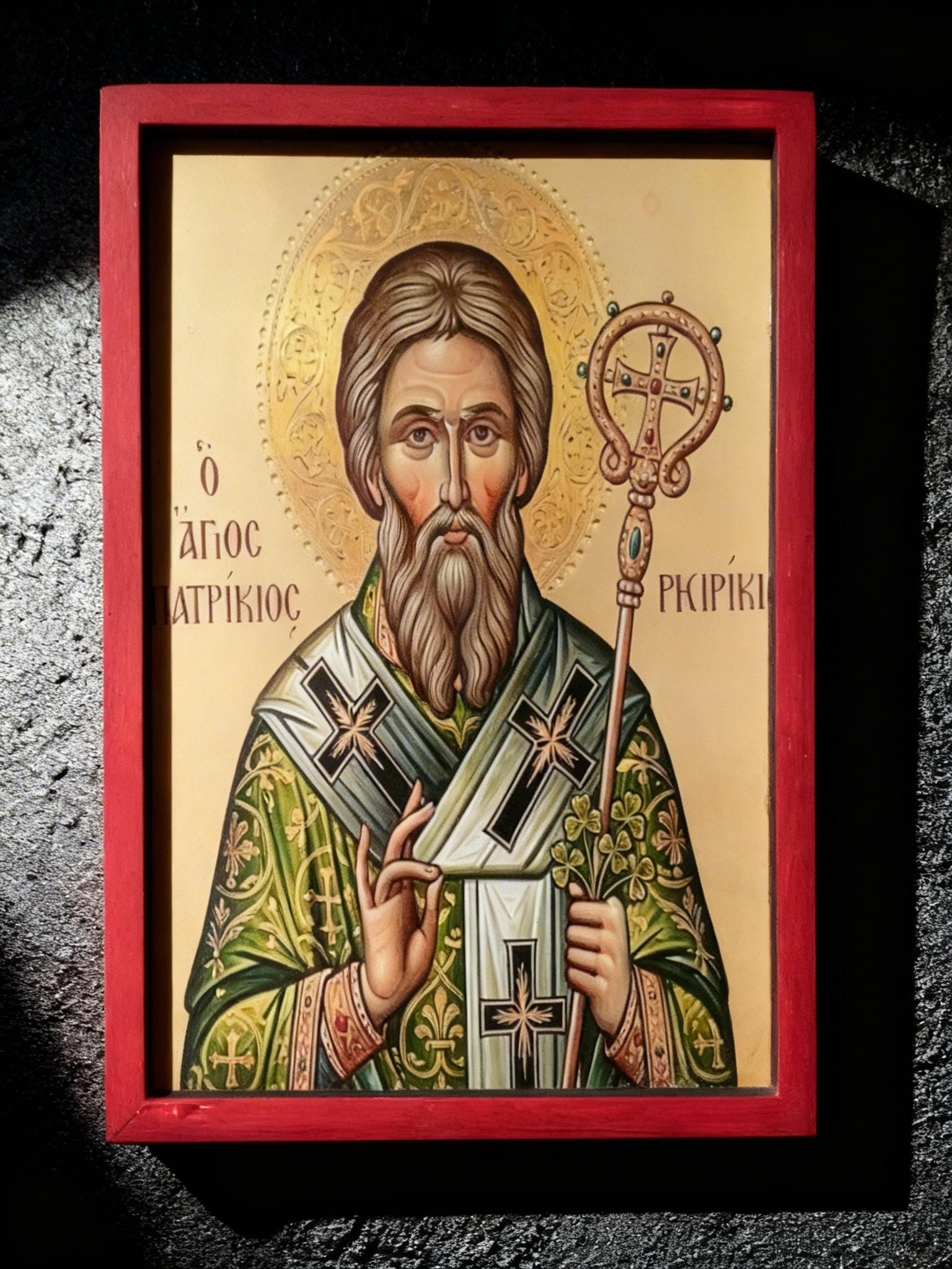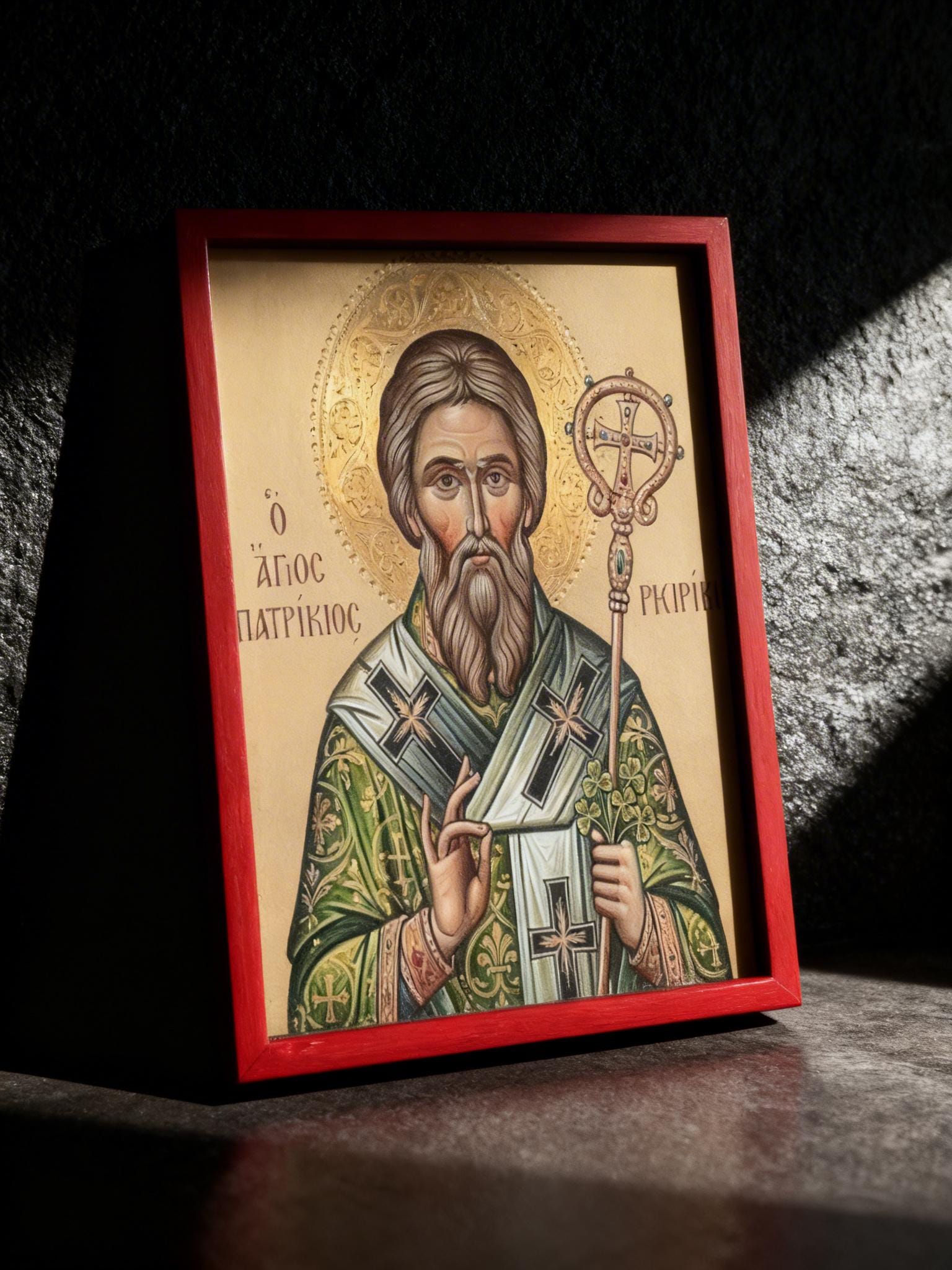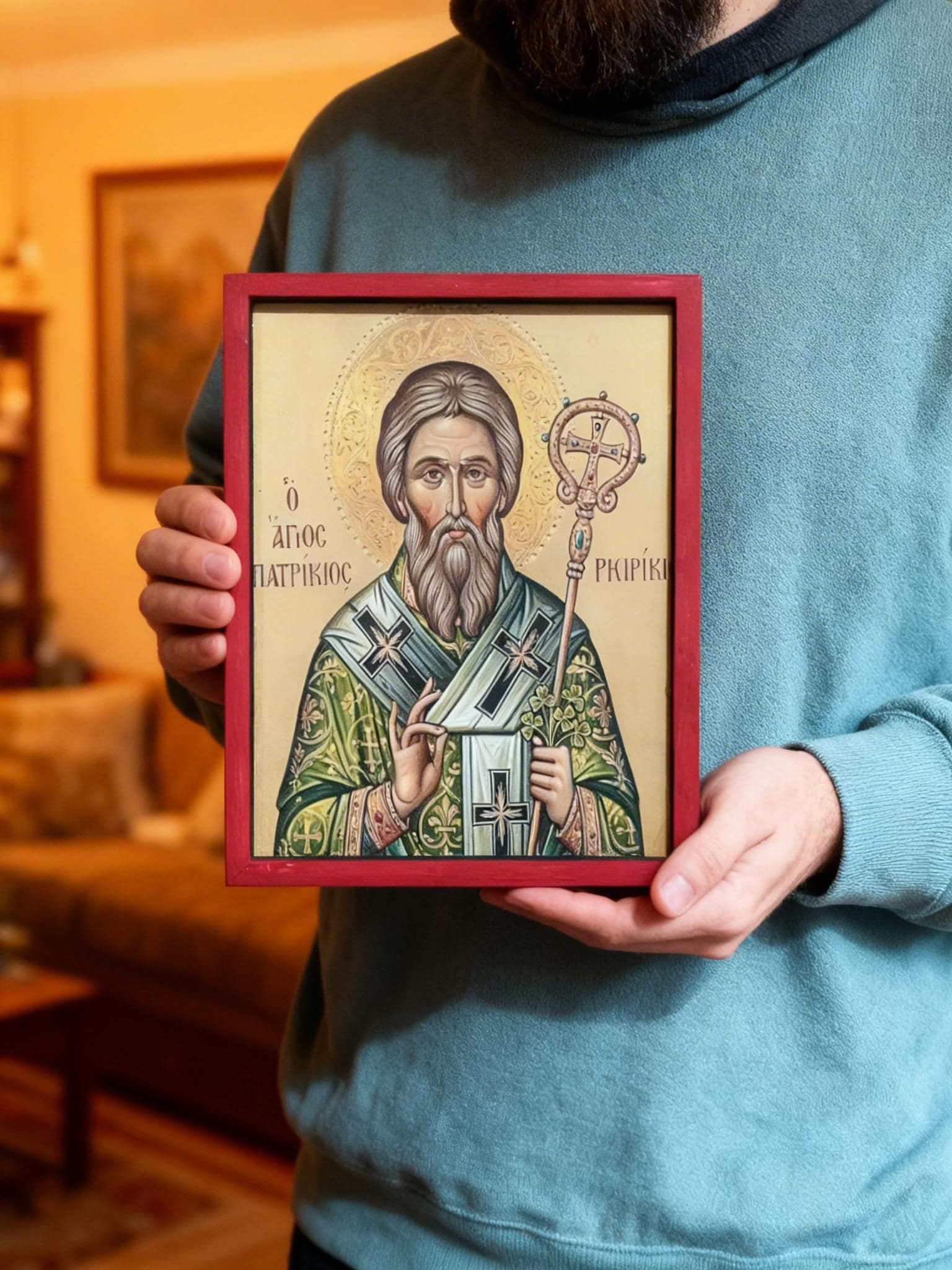 This handmade wooden icon depicts Saint Patrick, the beloved patron saint of Ireland and one of the most recognized Christian missionaries in history.