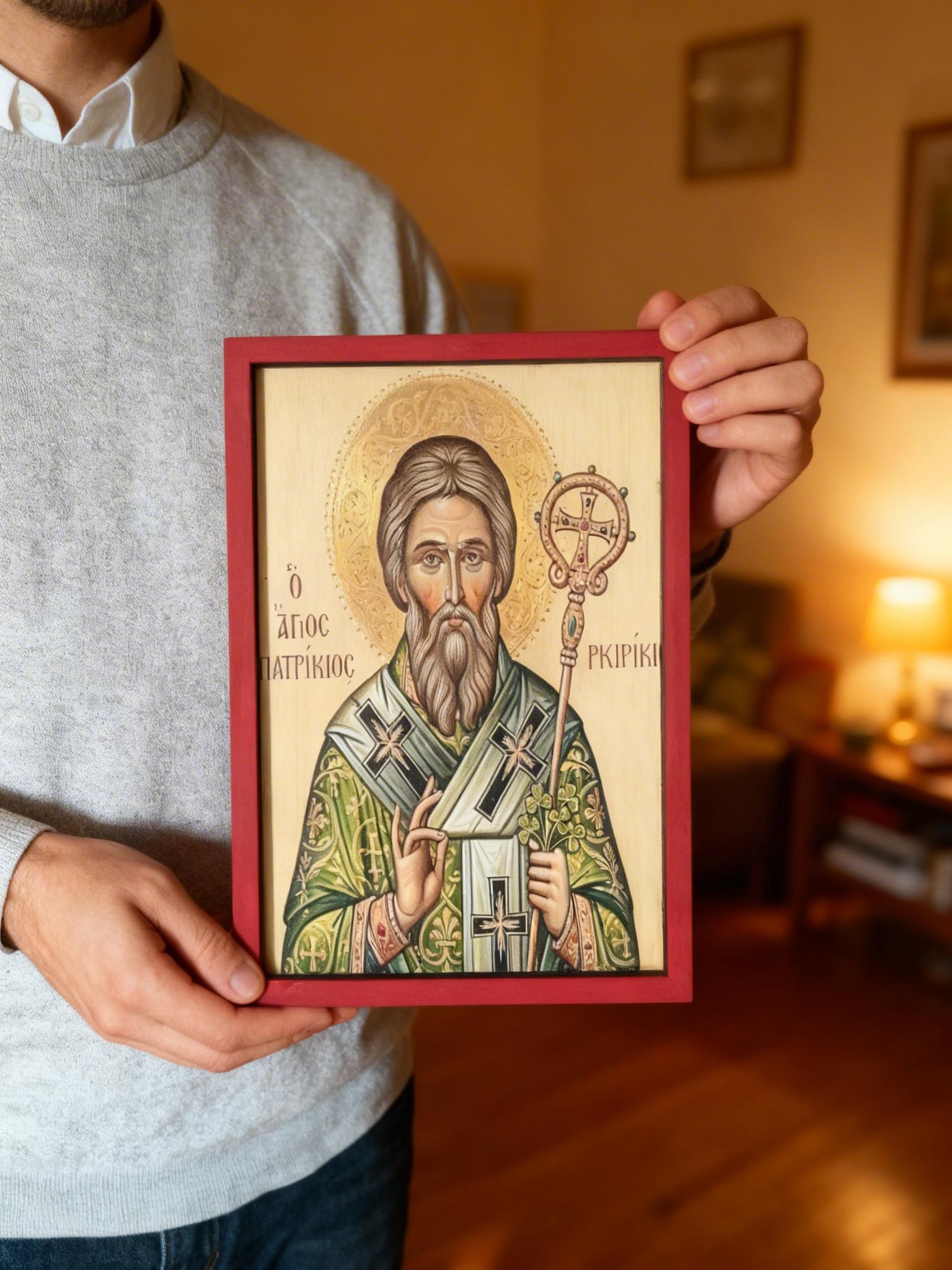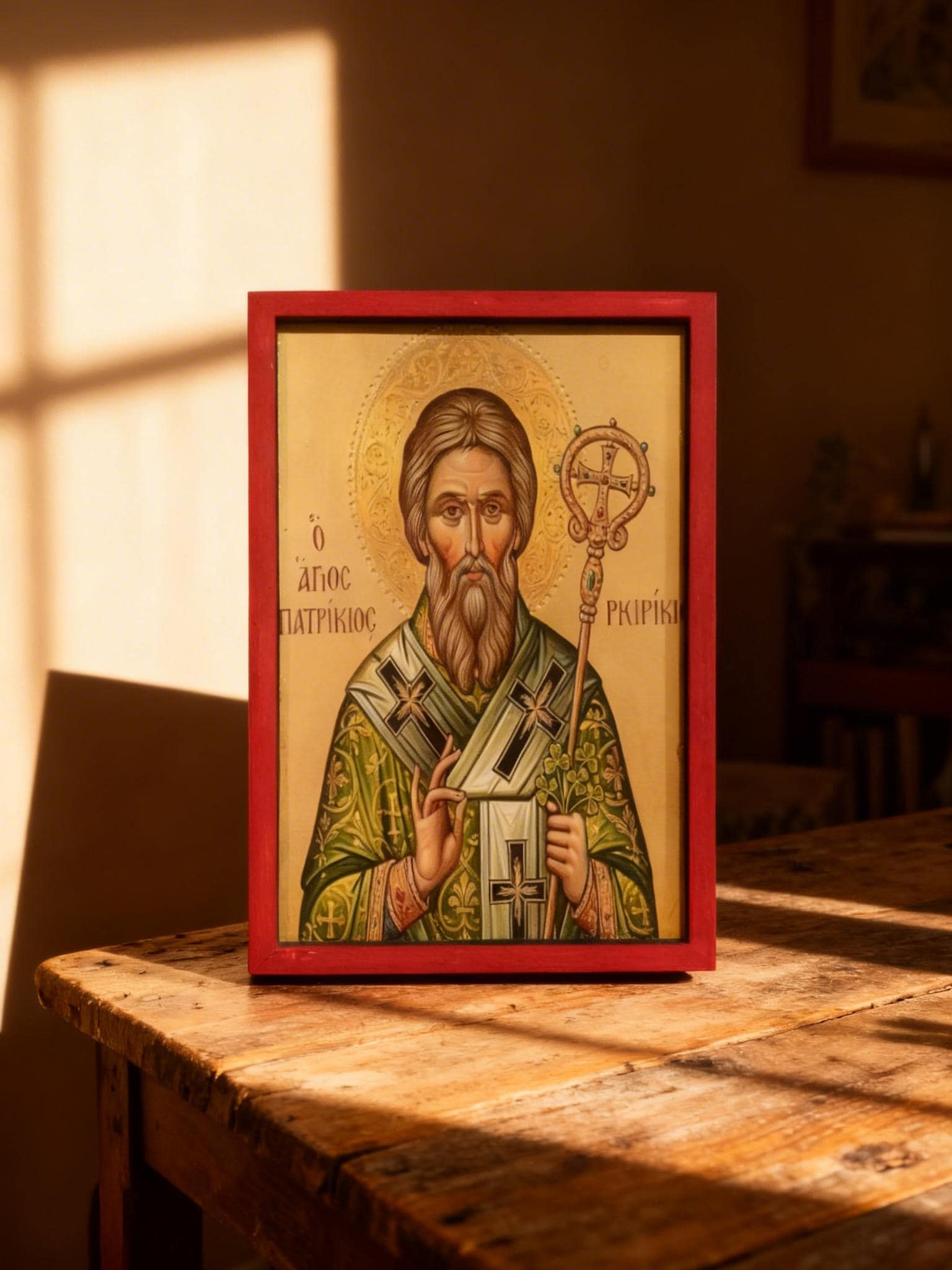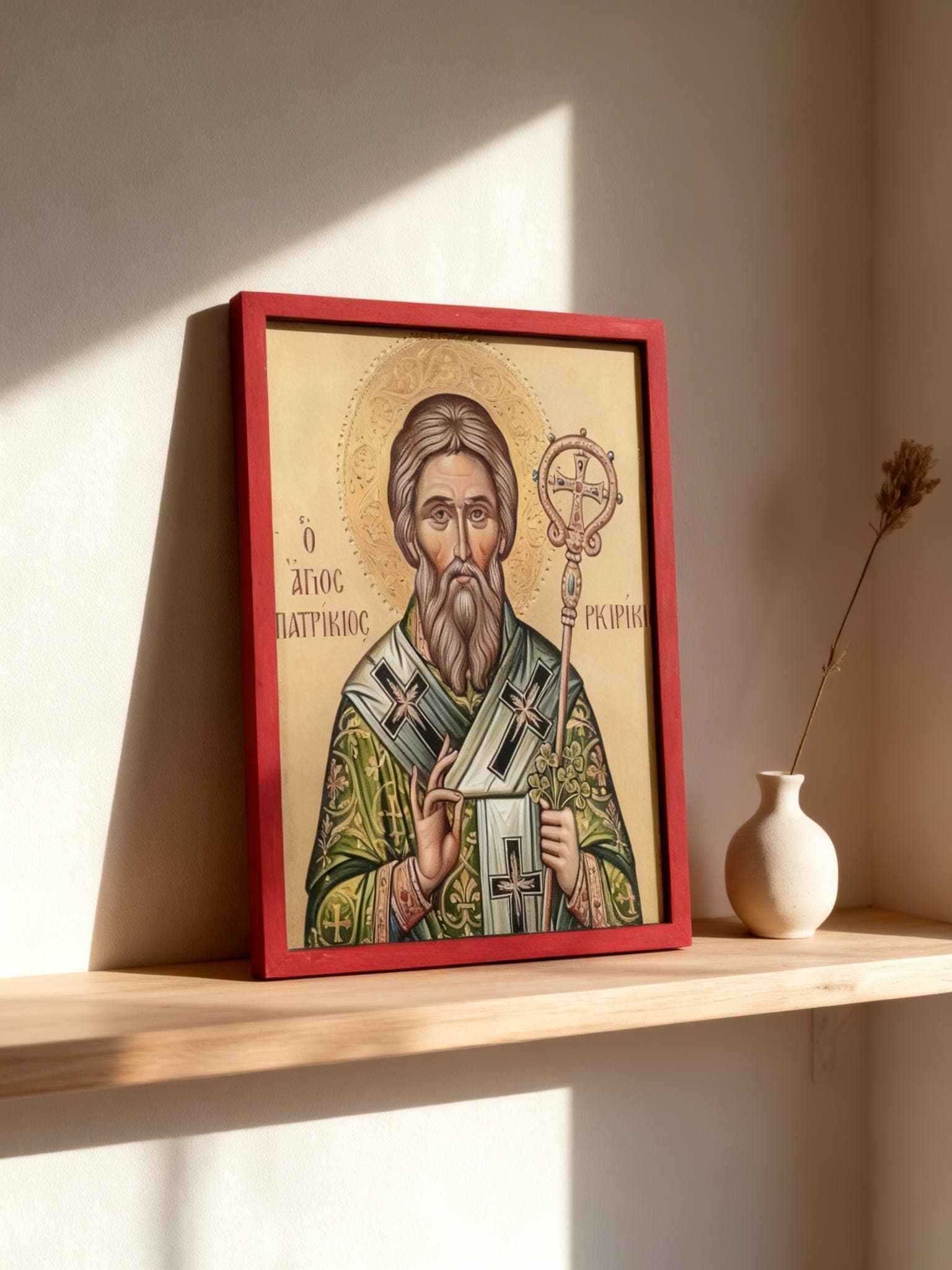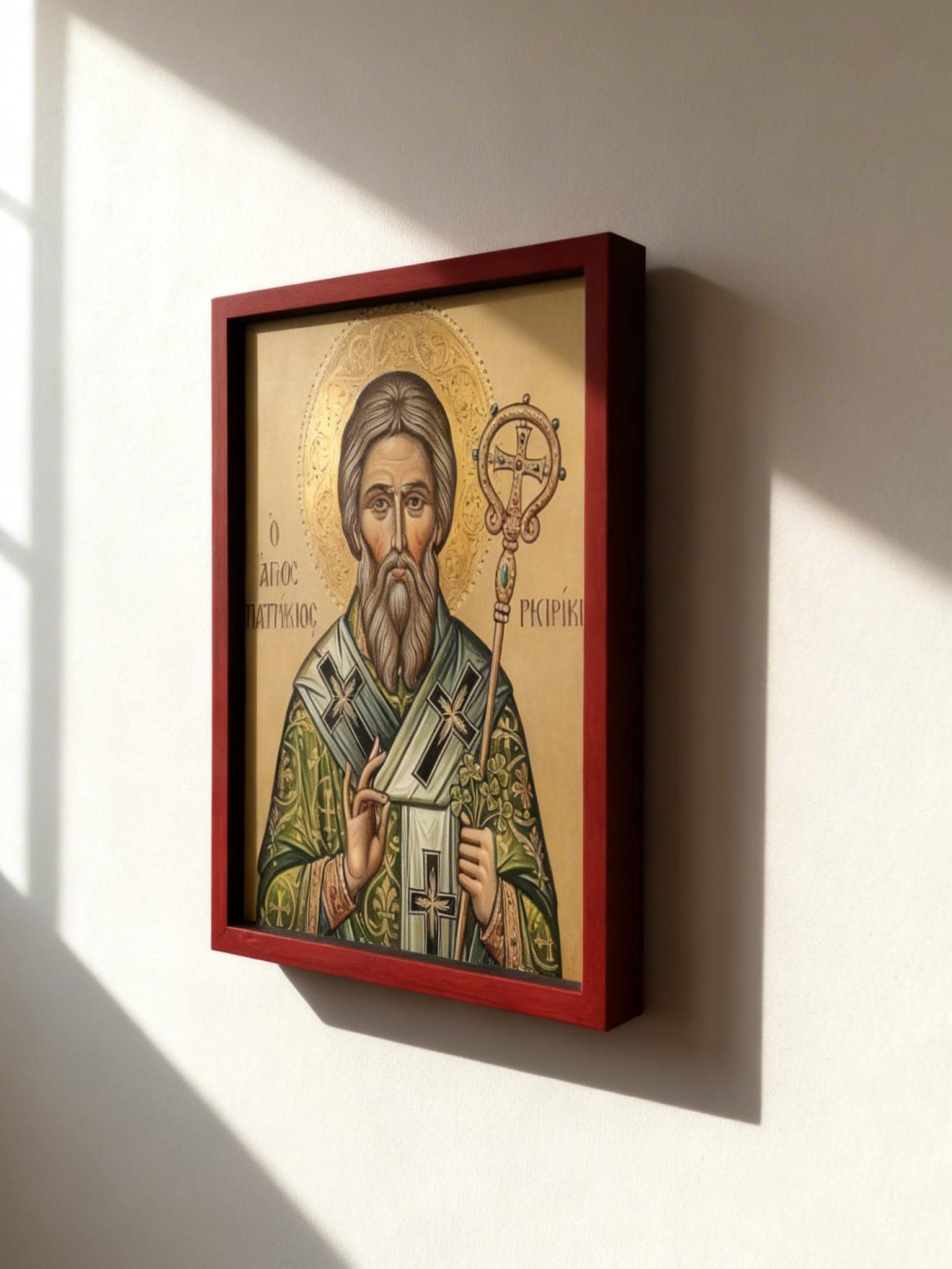 This handmade wooden icon depicts Saint Patrick, the beloved patron saint of Ireland and one of the most recognized Christian missionaries in history.