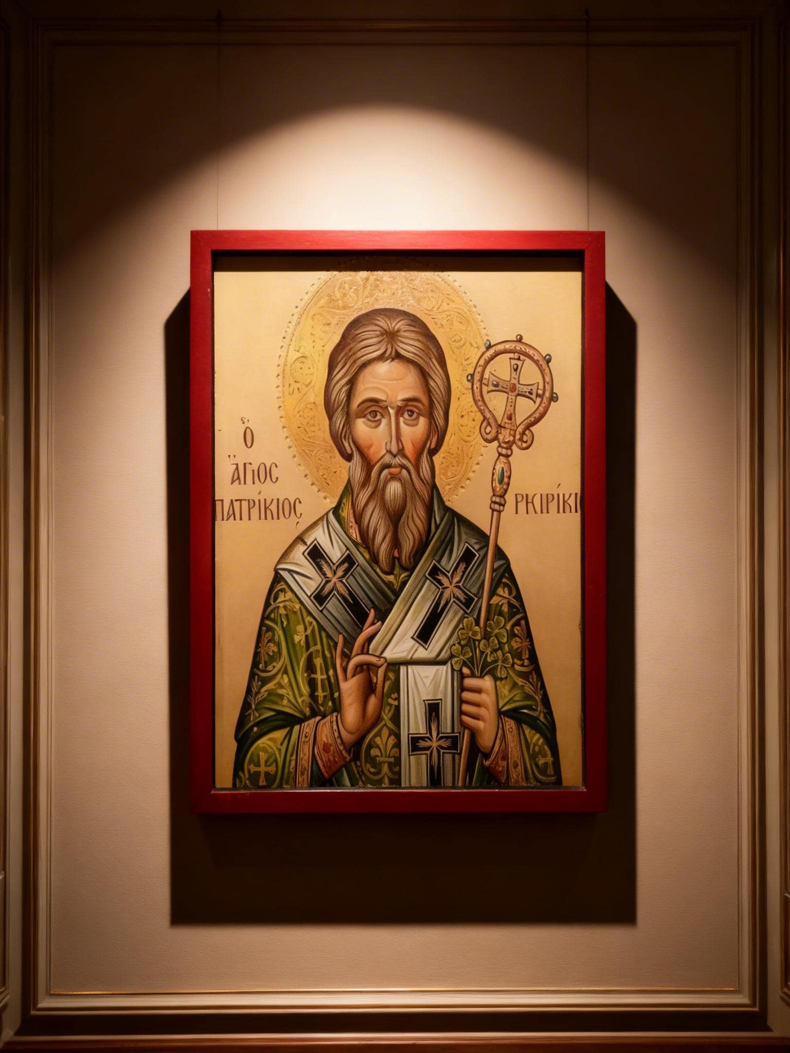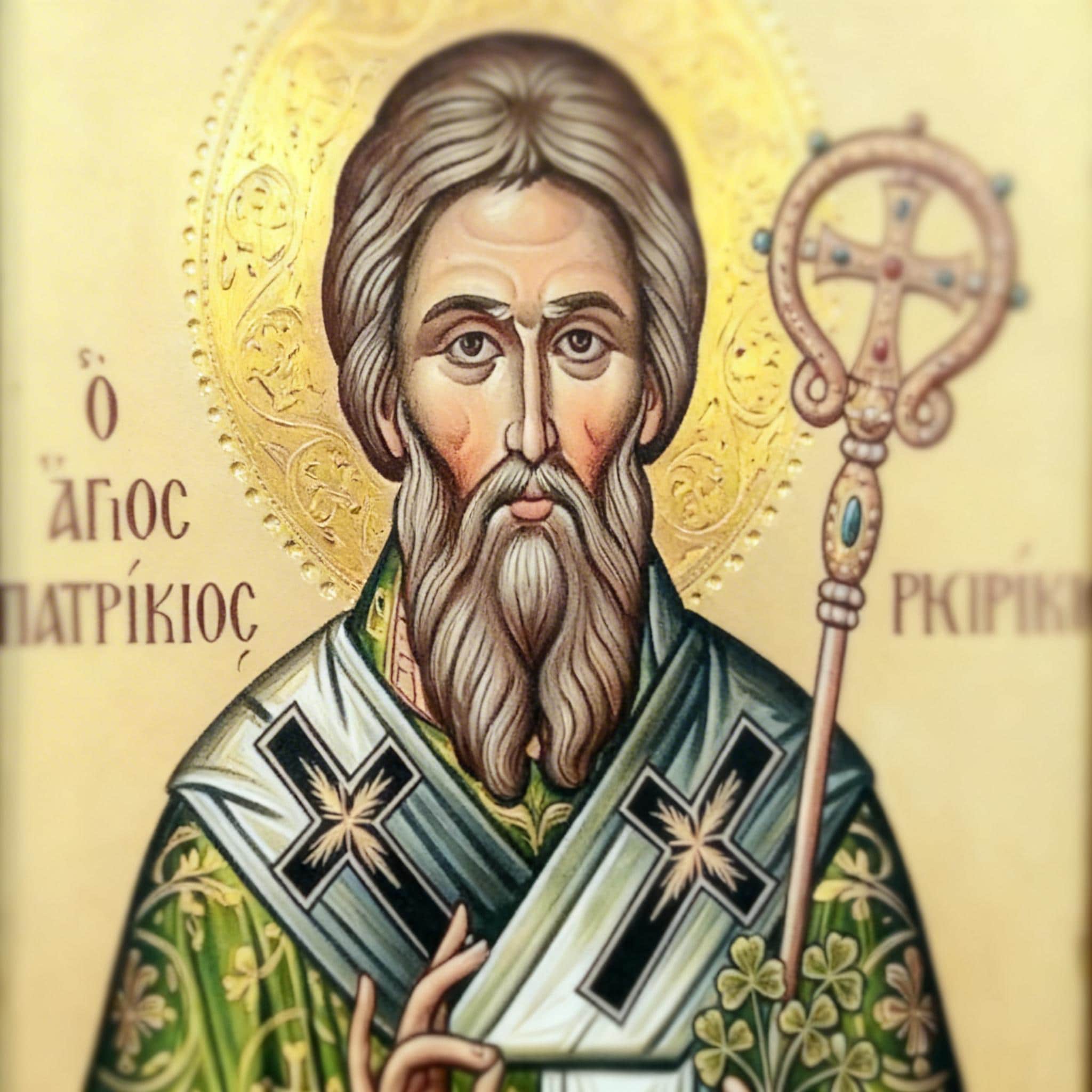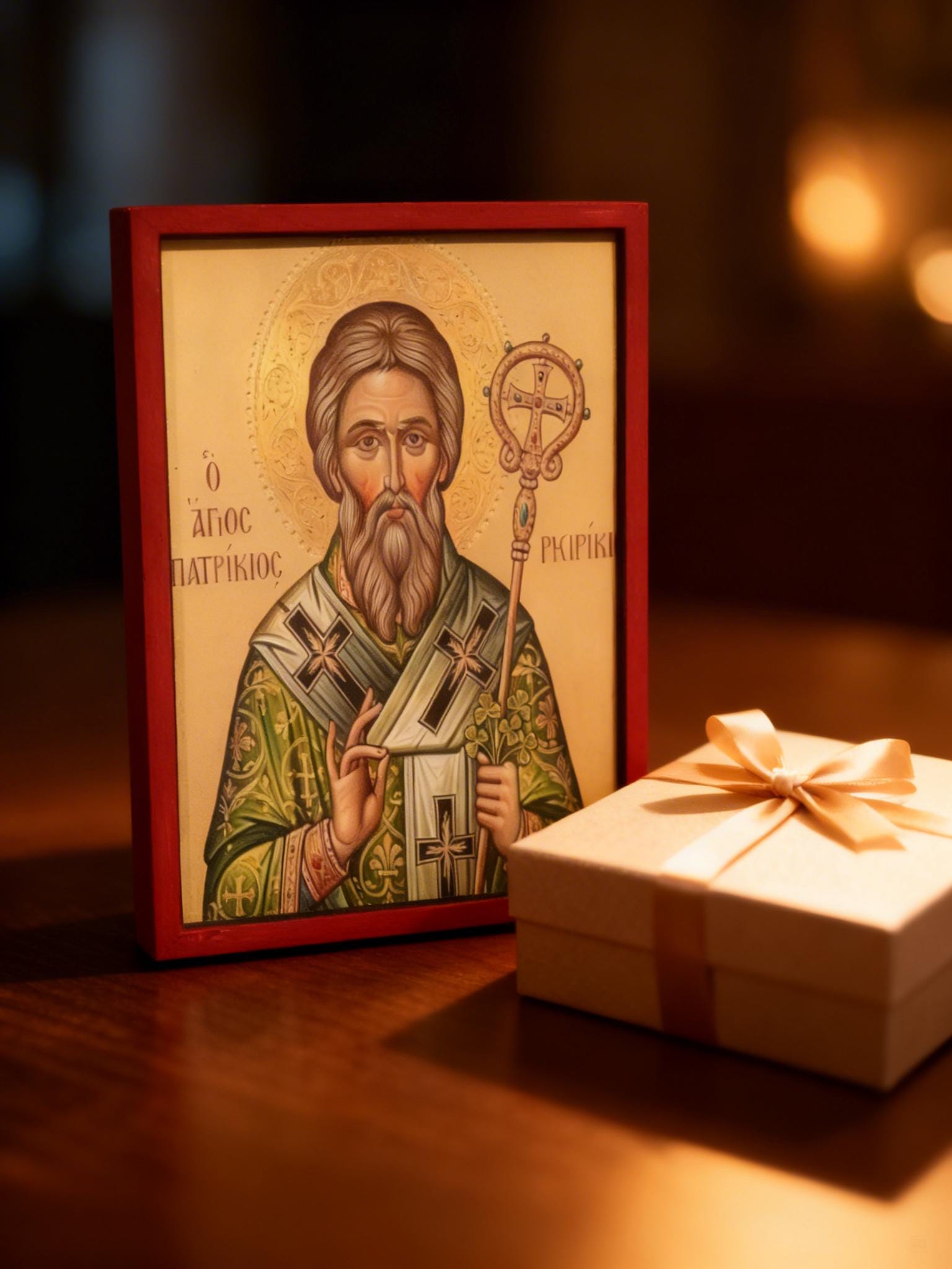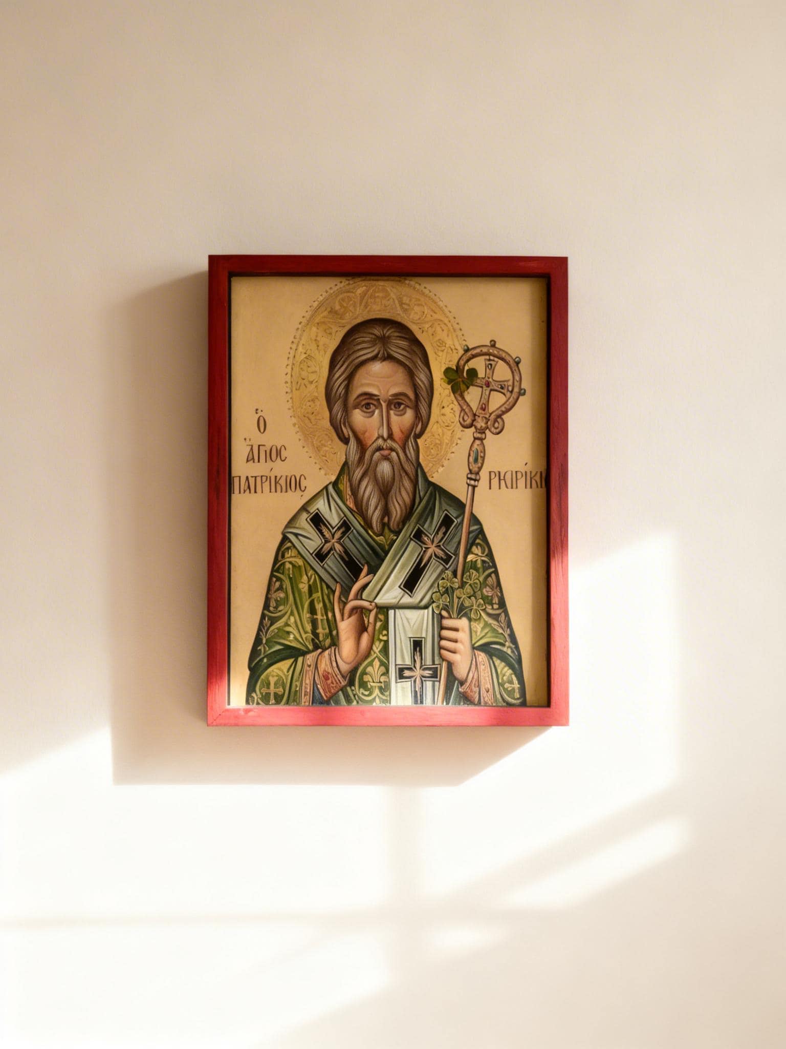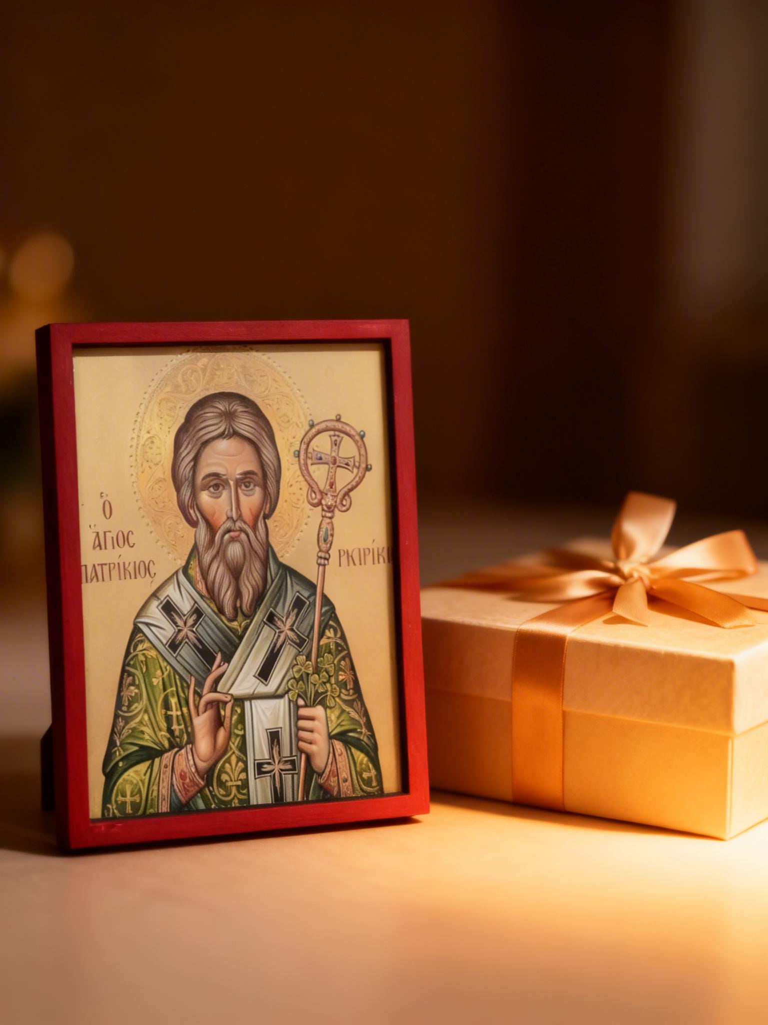This handmade wooden icon depicts Saint Patrick, the beloved patron saint of Ireland and one of the most recognized Christian missionaries in history.
