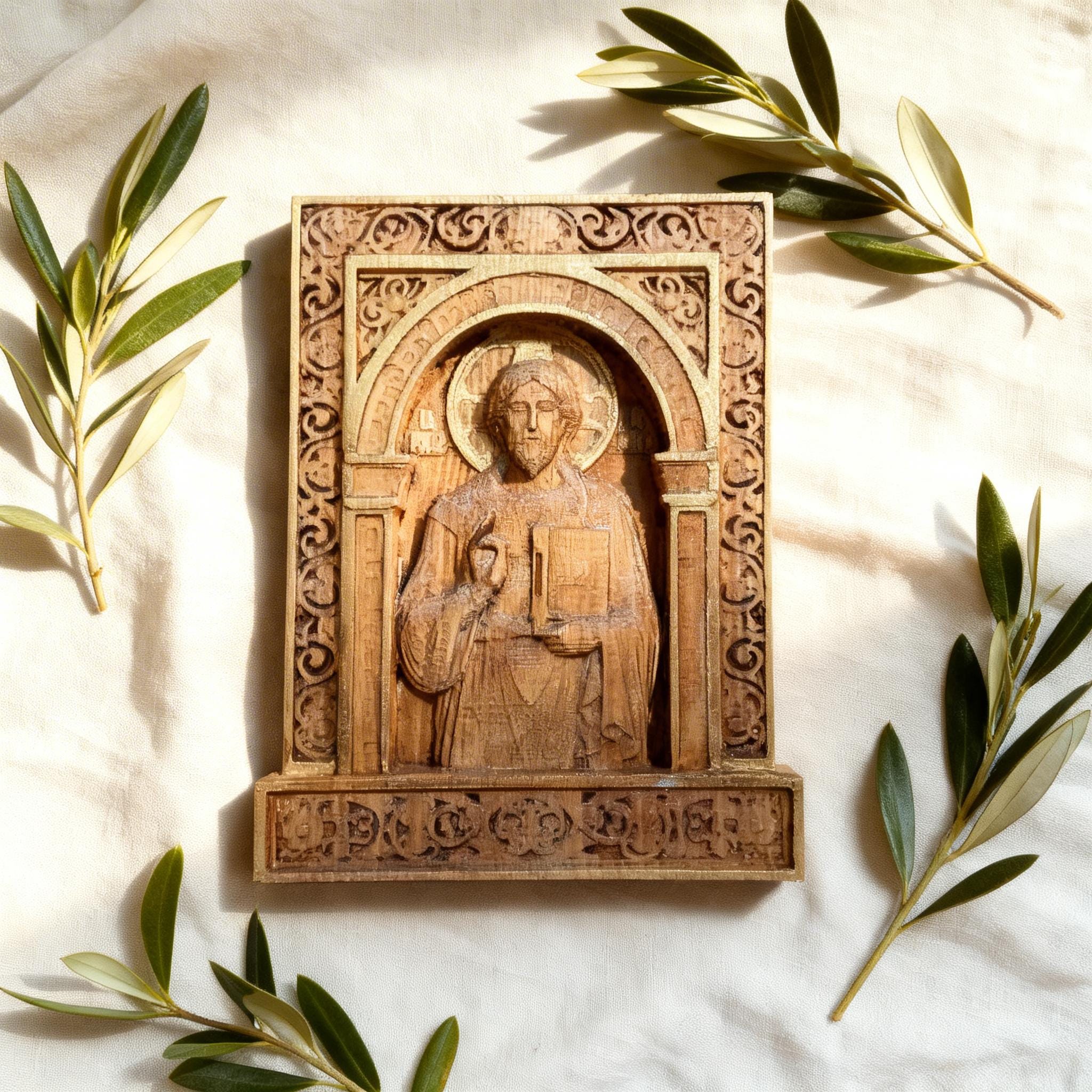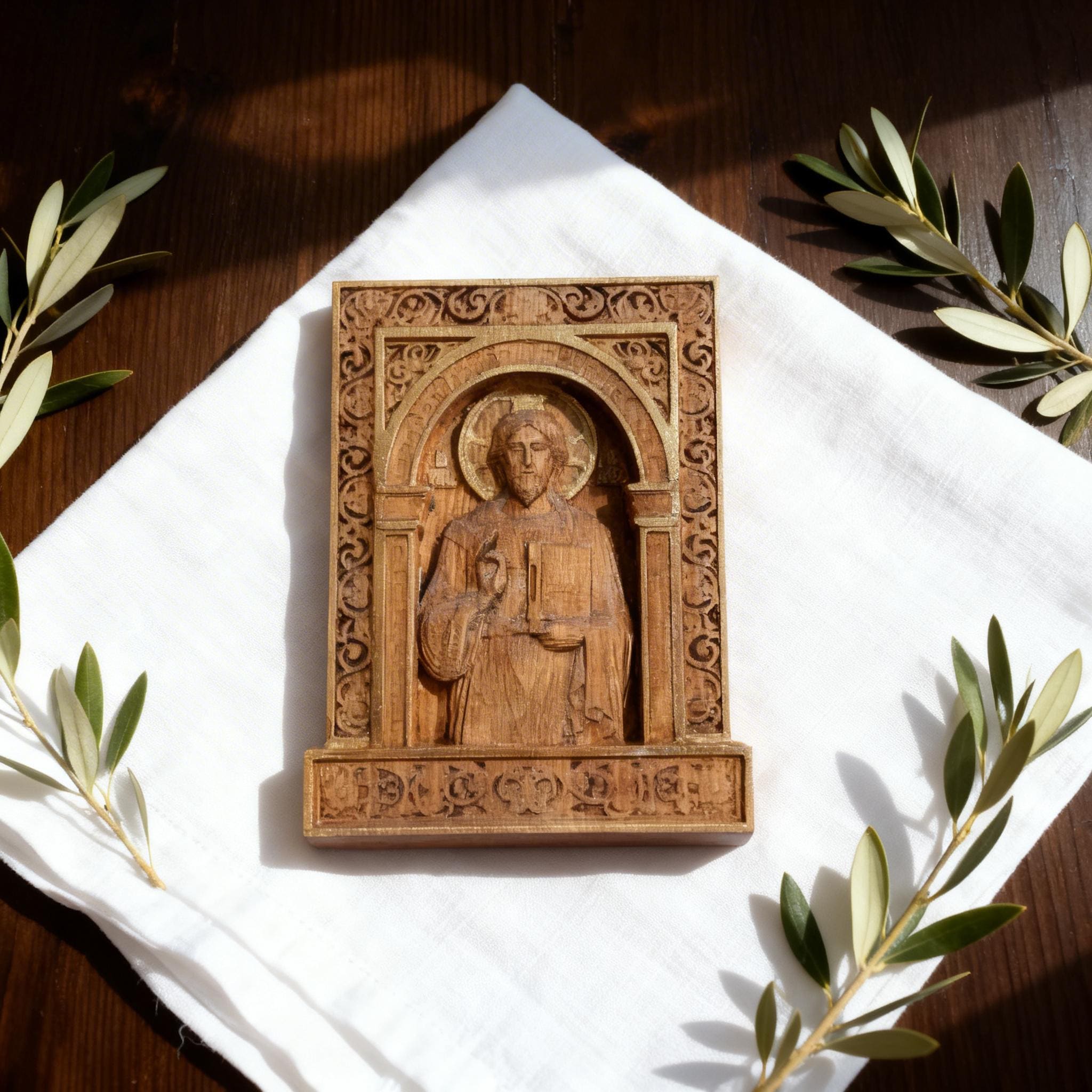 This hand carved wooden icon of Christ Pantocrator is crafted with attention to detail and deep respect for the traditional Byzantine iconography.