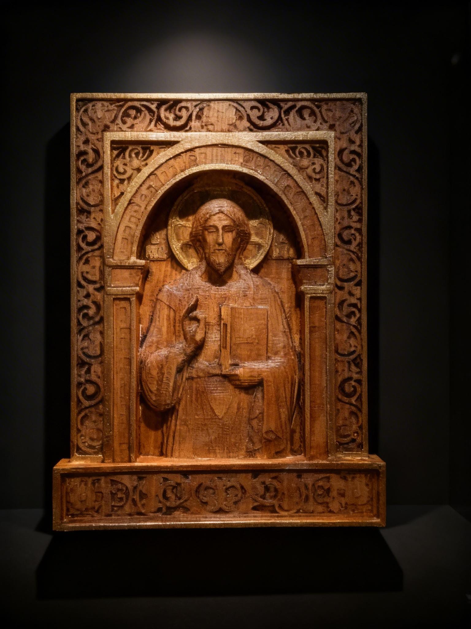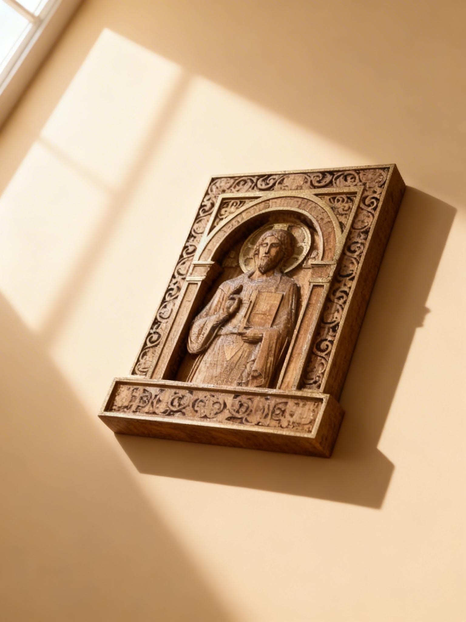 The deep relief carving gives the icon a strong three dimensional presence, making it perfect for: