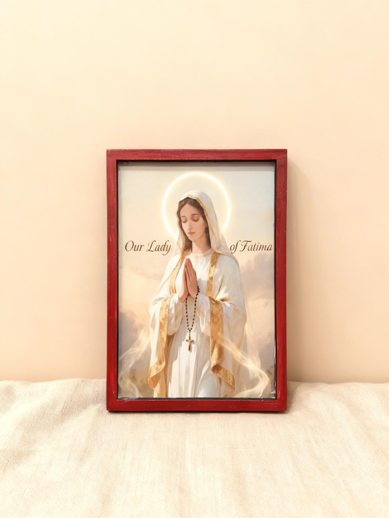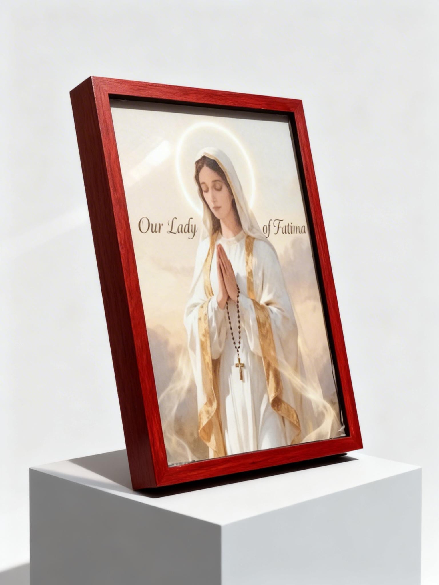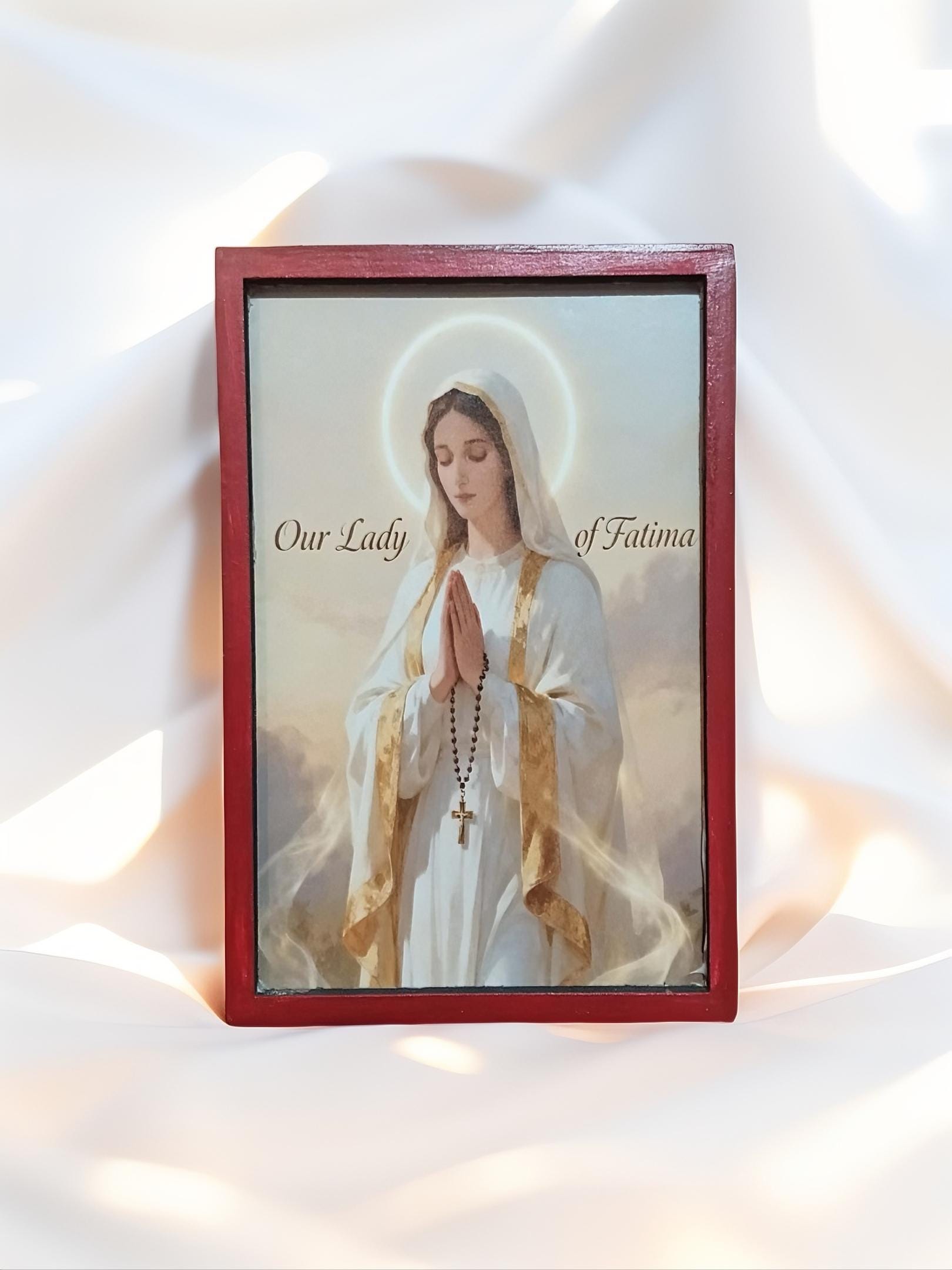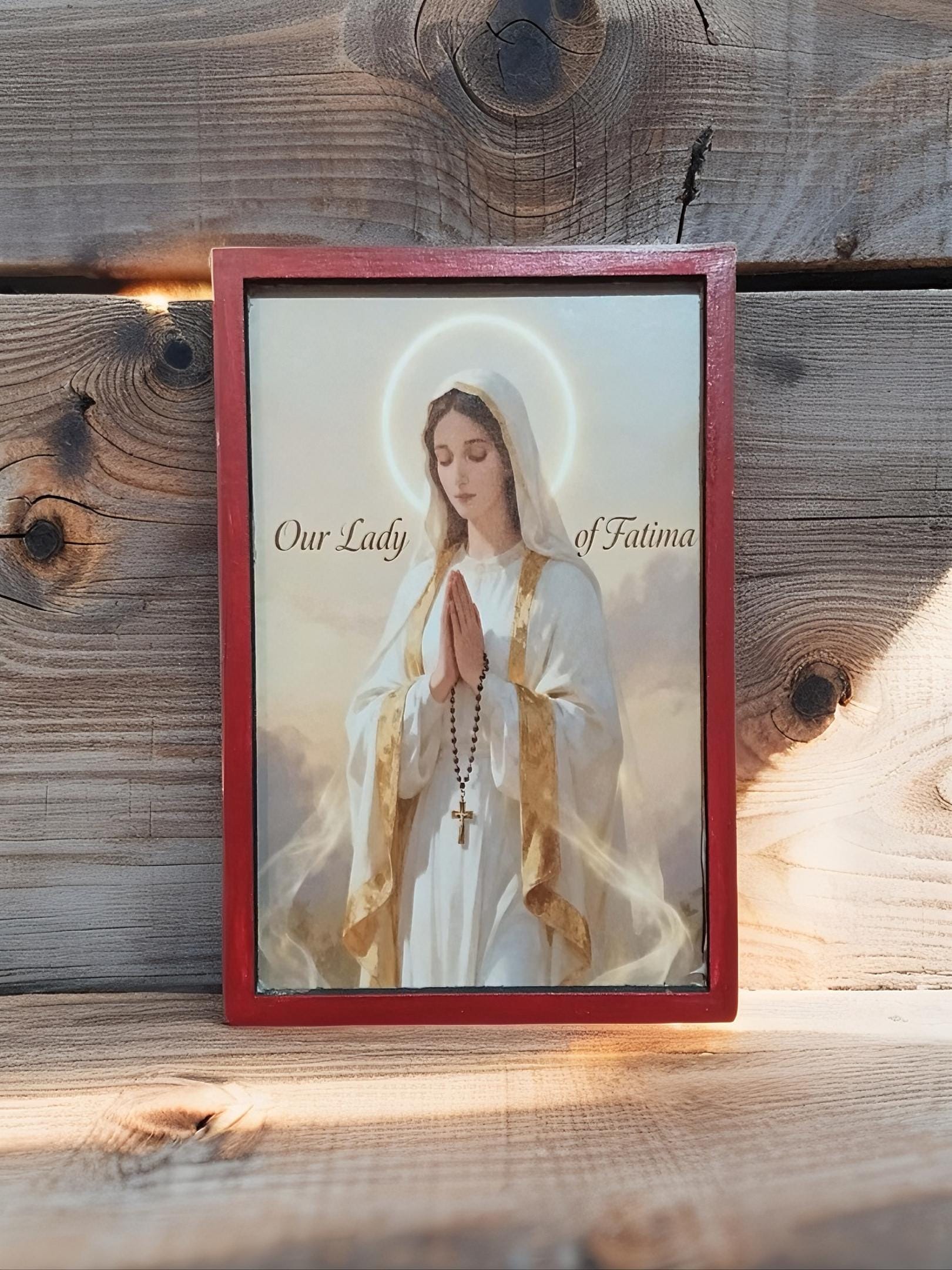 Bring peace, faith and devotion into your home with this handmade wooden icon of Our Lady of Fatima.