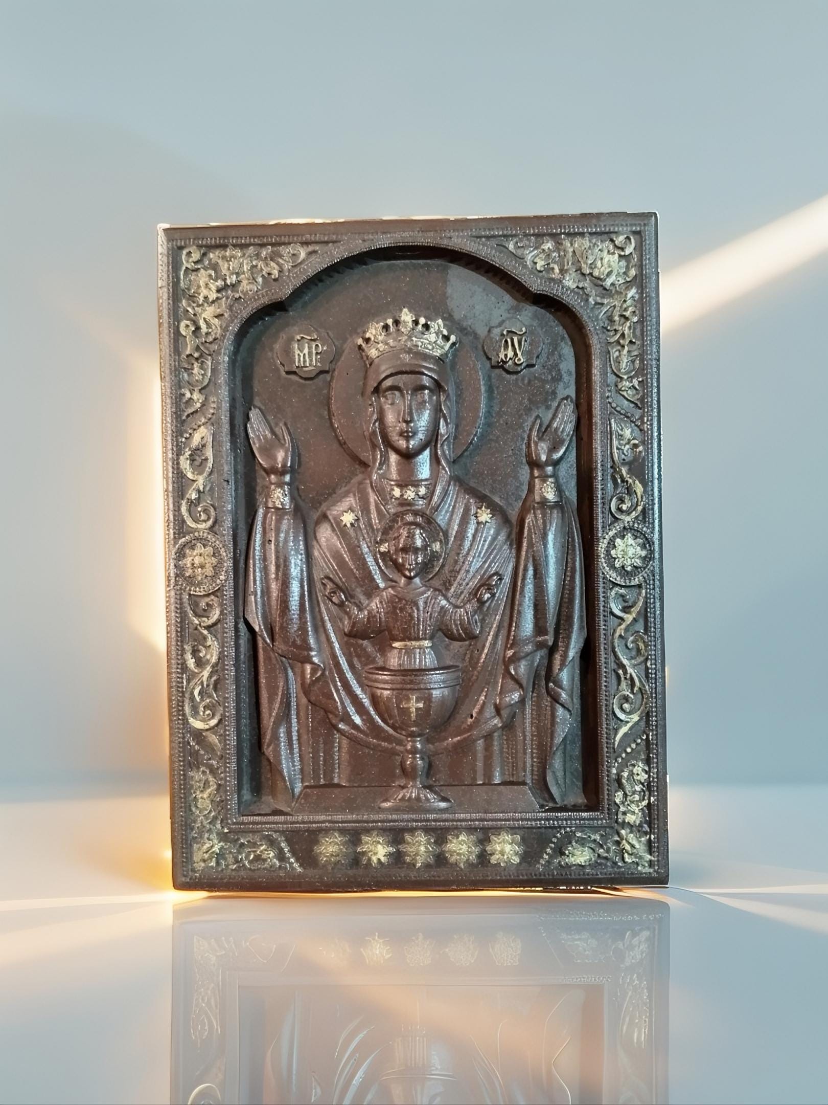 This unique Orthodox icon of the Virgin Mary (Panagia) is a handcrafted relief piece made from cast stone and finished with a porcelain-like surface. The dark bronze patina gives it an antique, timeless character, resembling traditional Byzantine metal icons.