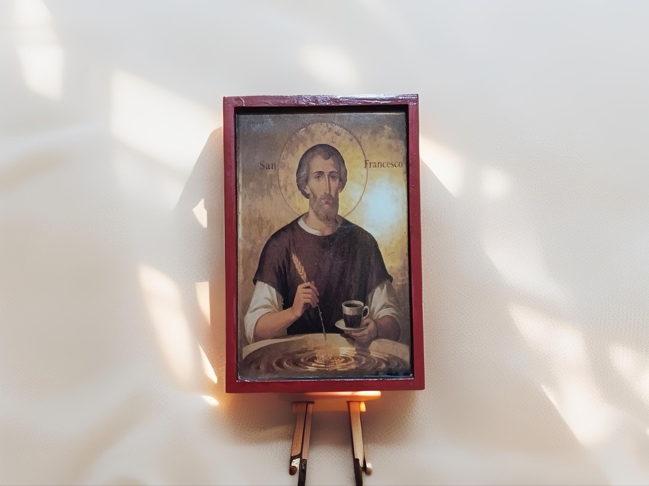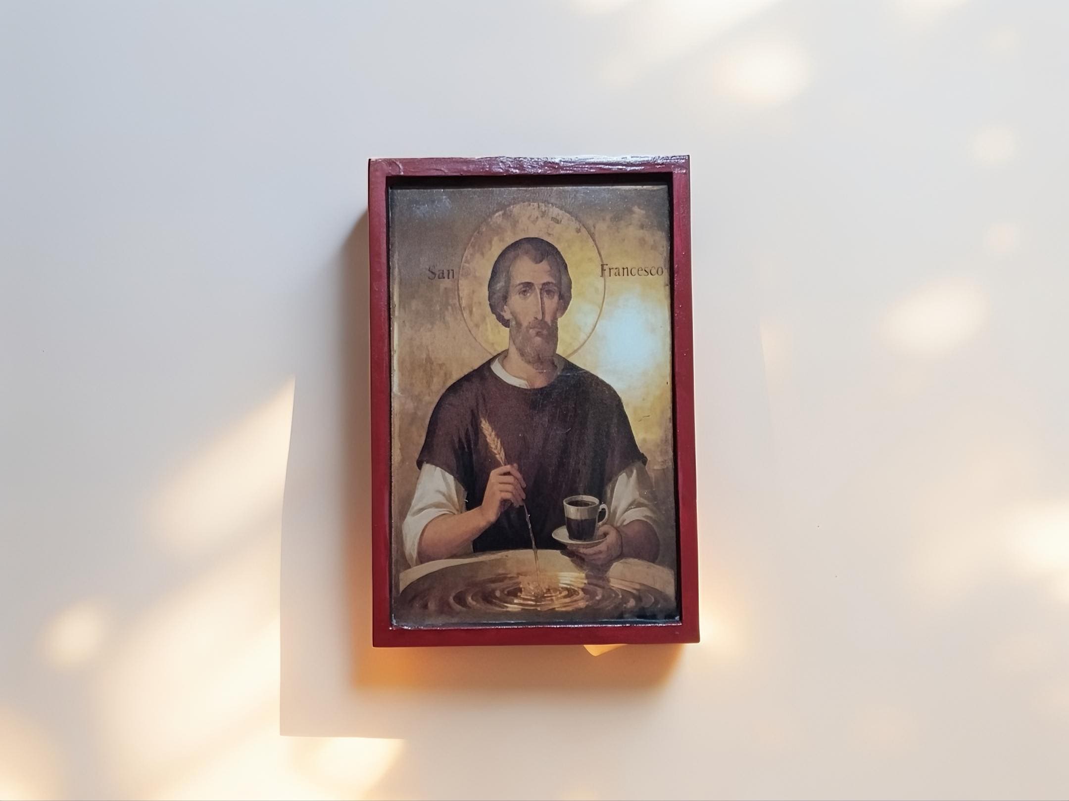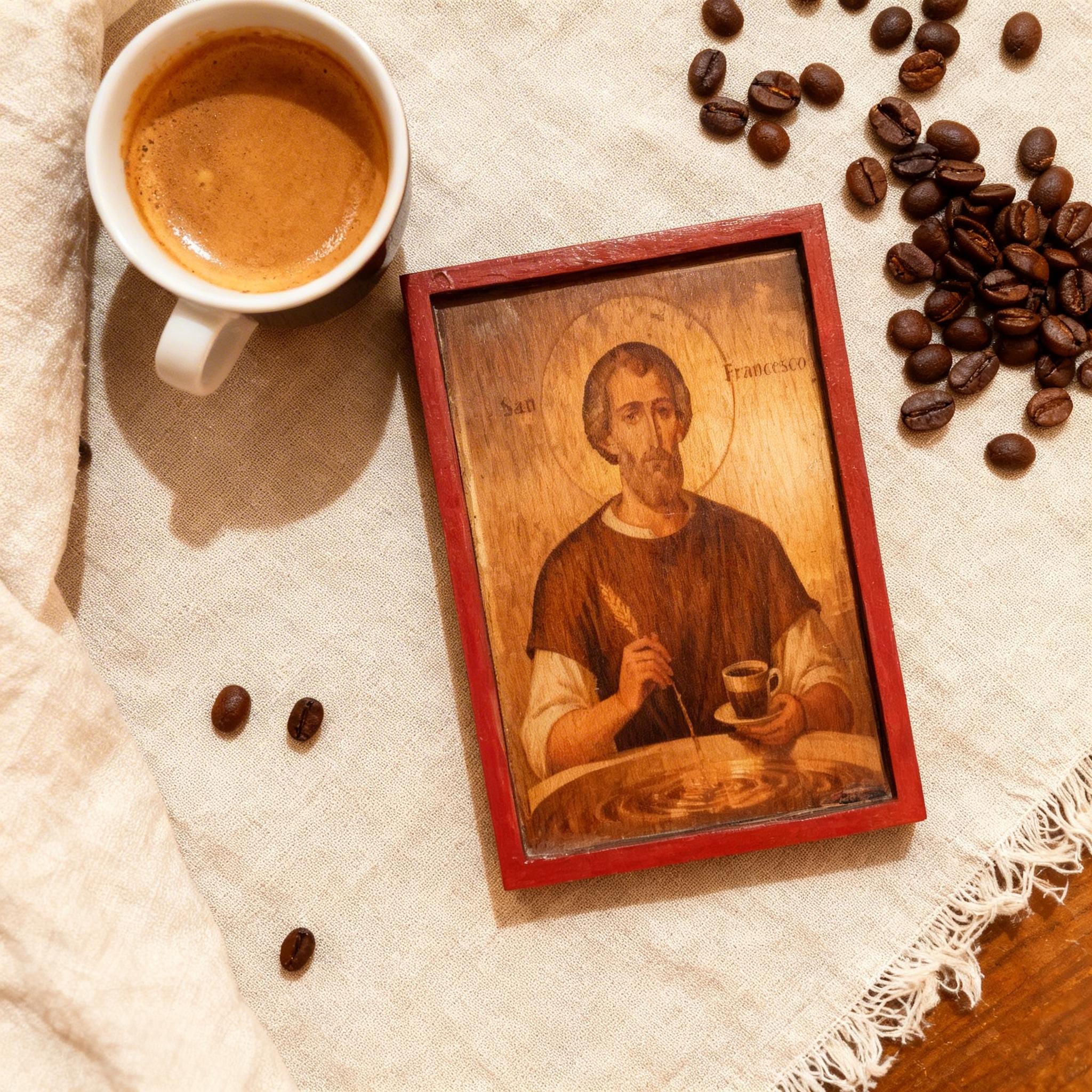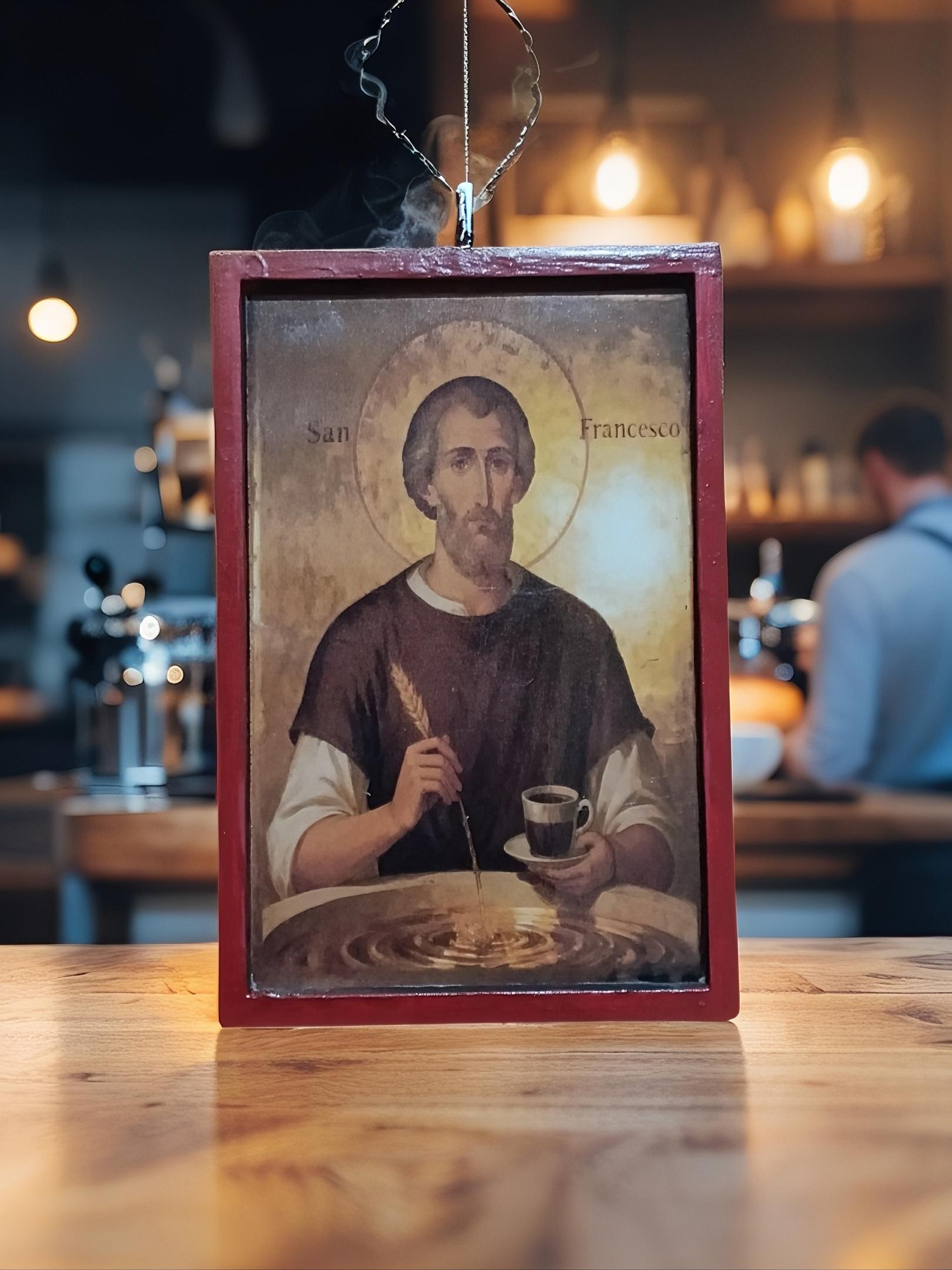 This piece blends traditional religious art with a subtle, modern twist portraying Saint Francis as a symbol of simplicity, gratitude, and even the humble joy of coffee. It’s not just decor it’s a conversation piece.