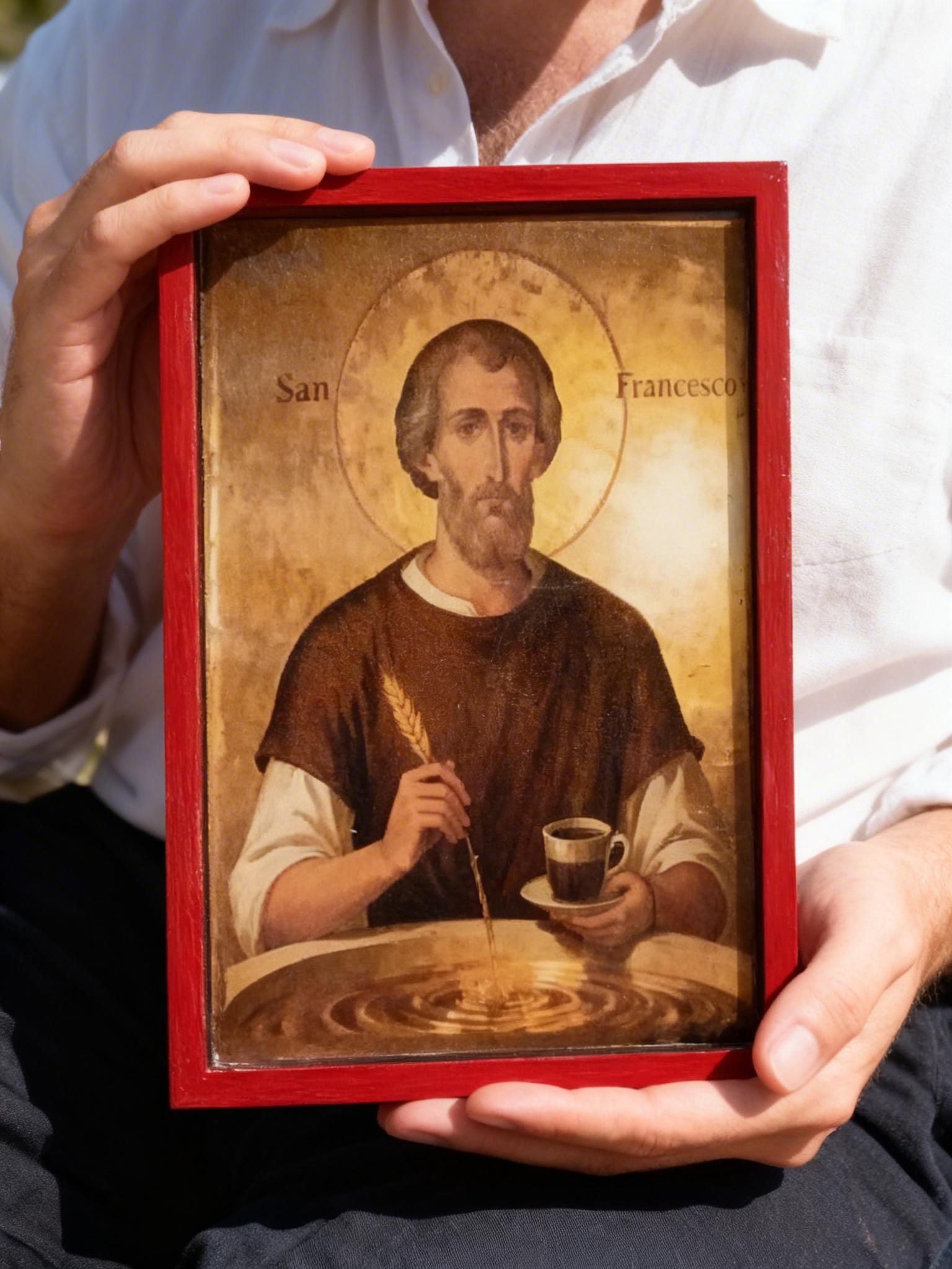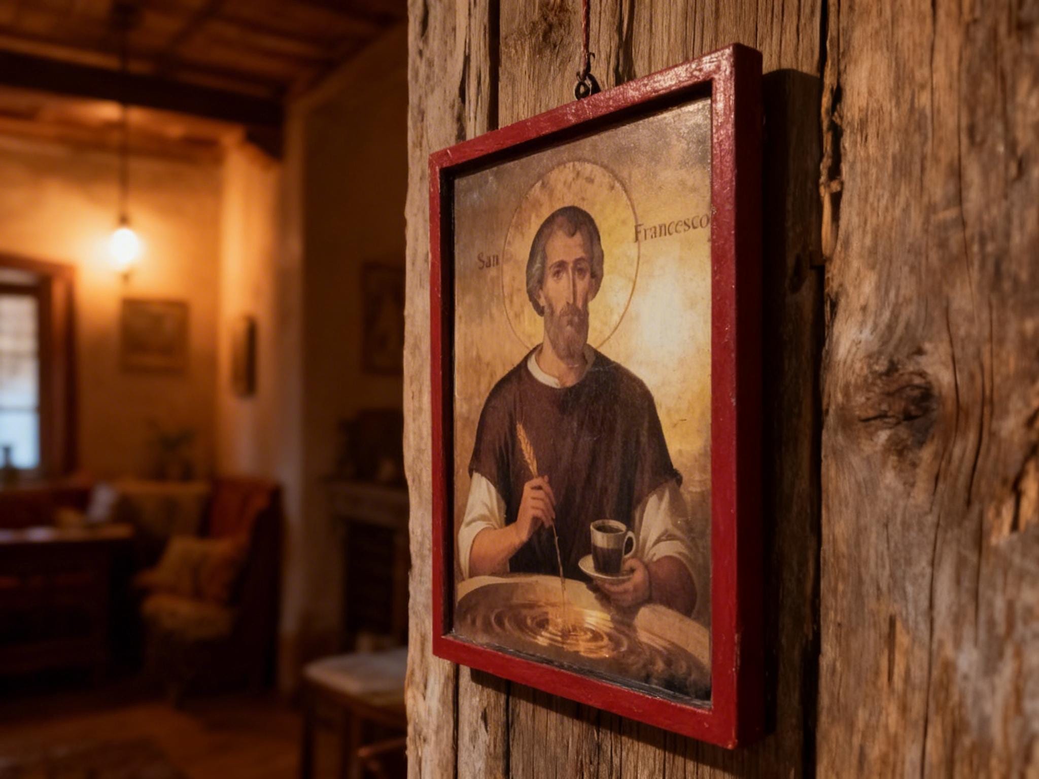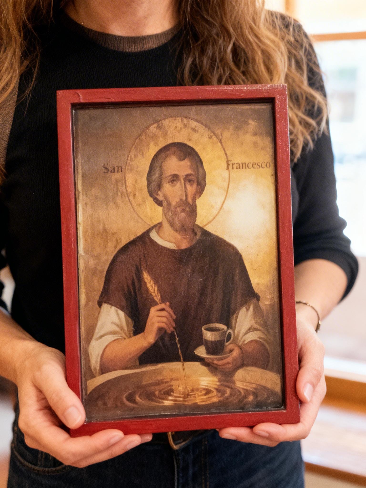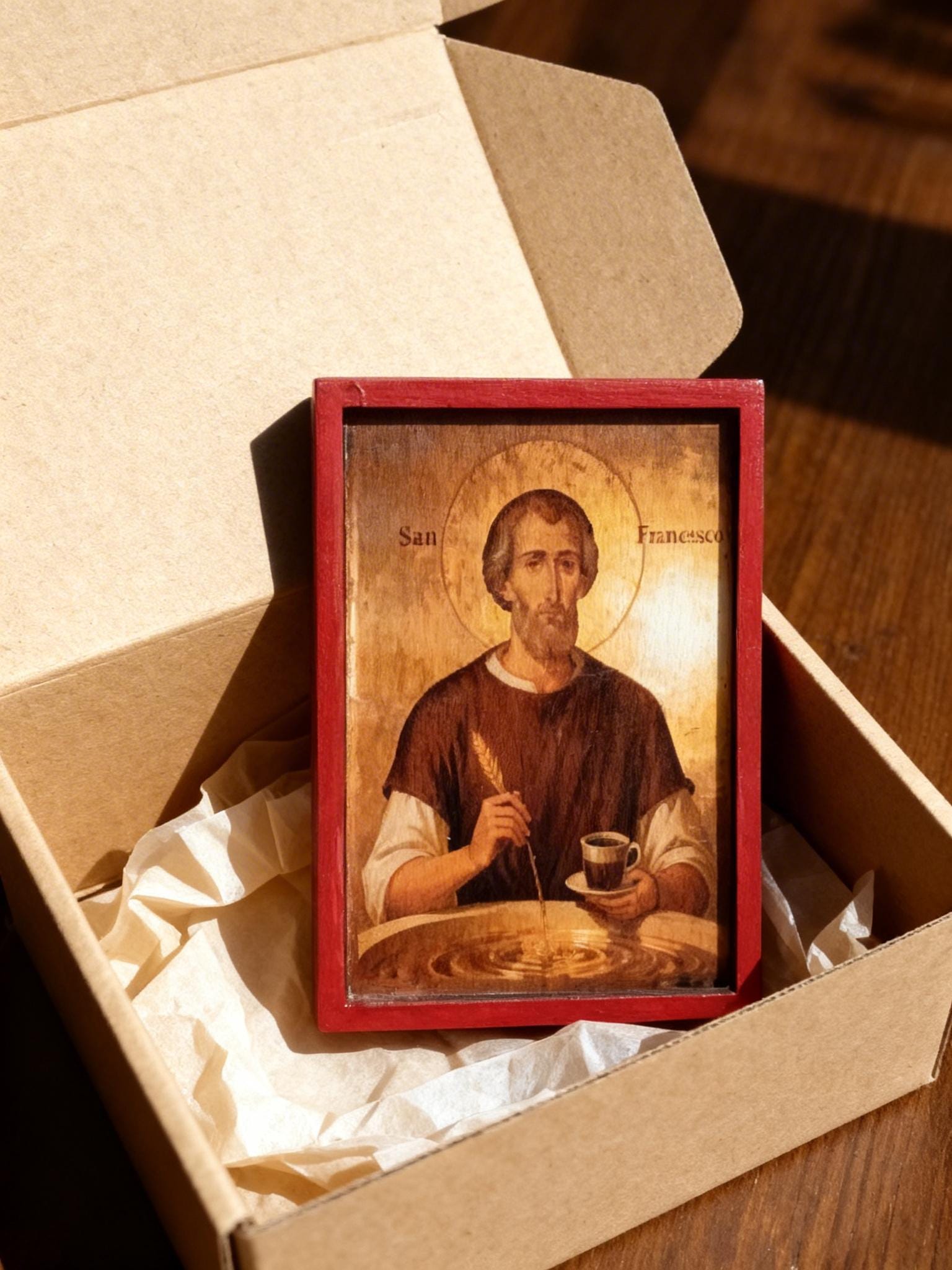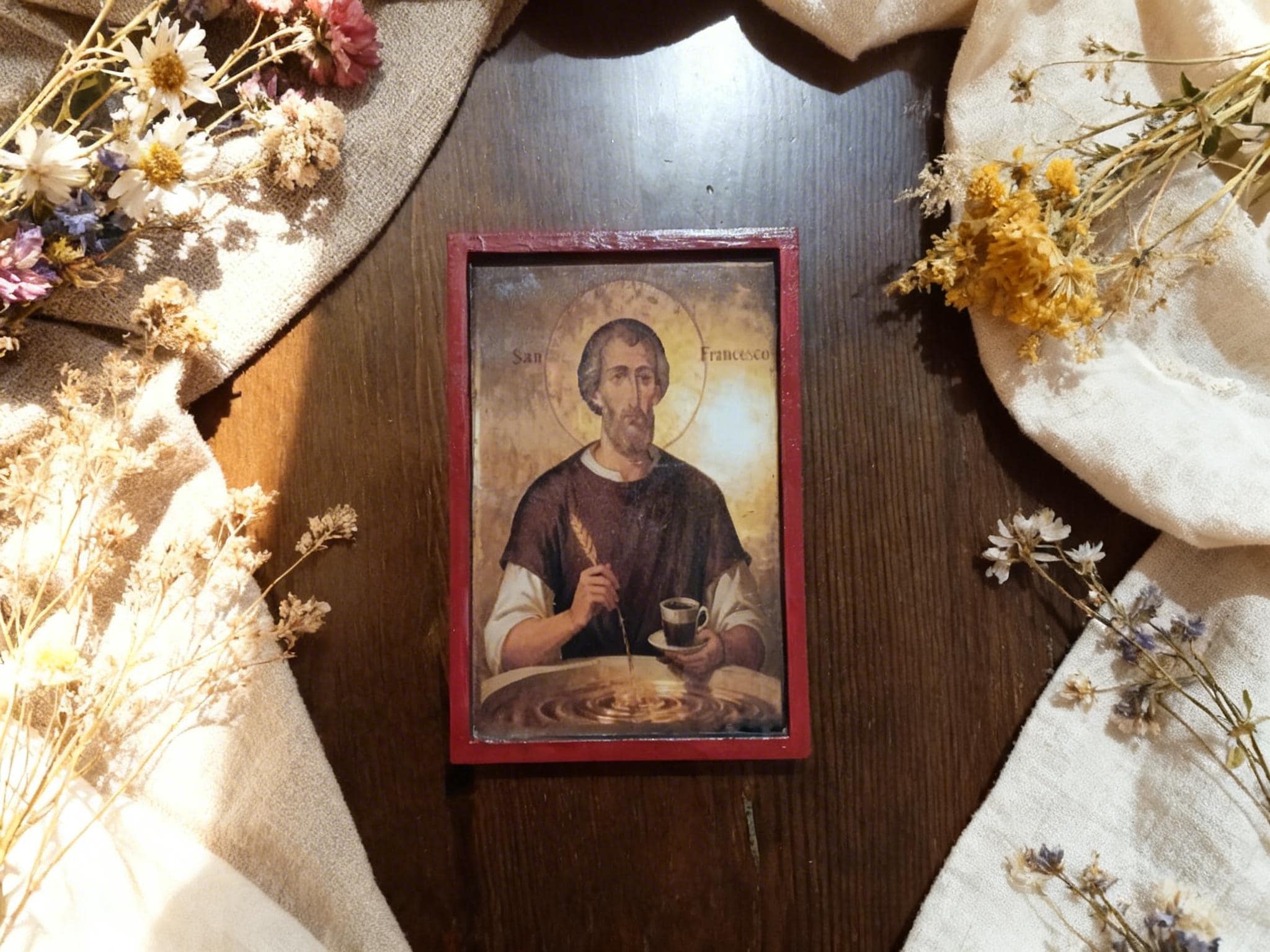 This piece blends traditional religious art with a subtle, modern twist portraying Saint Francis as a symbol of simplicity, gratitude, and even the humble joy of coffee. It’s not just decor it’s a conversation piece.