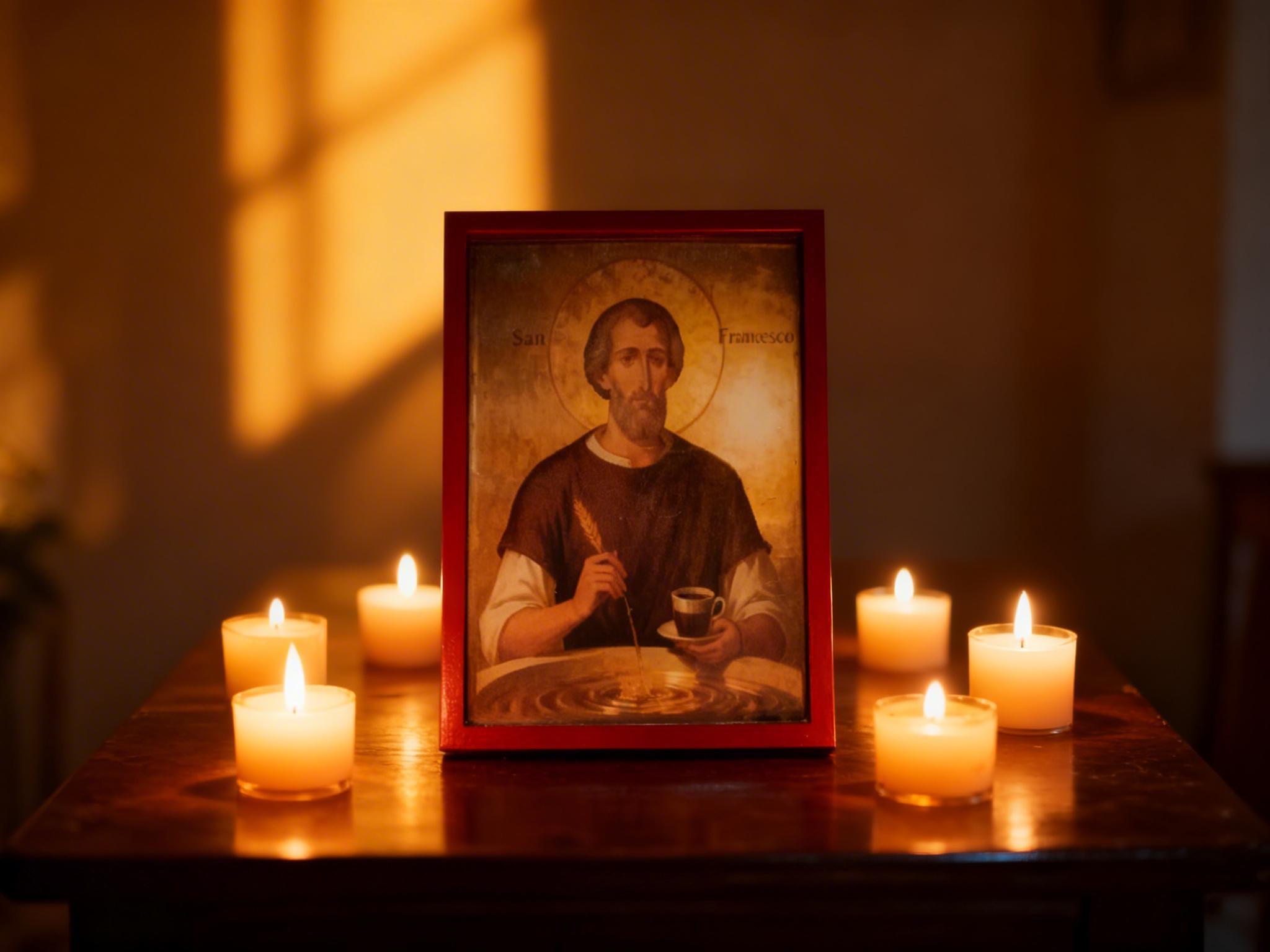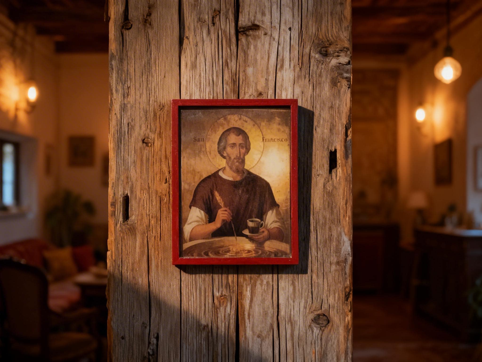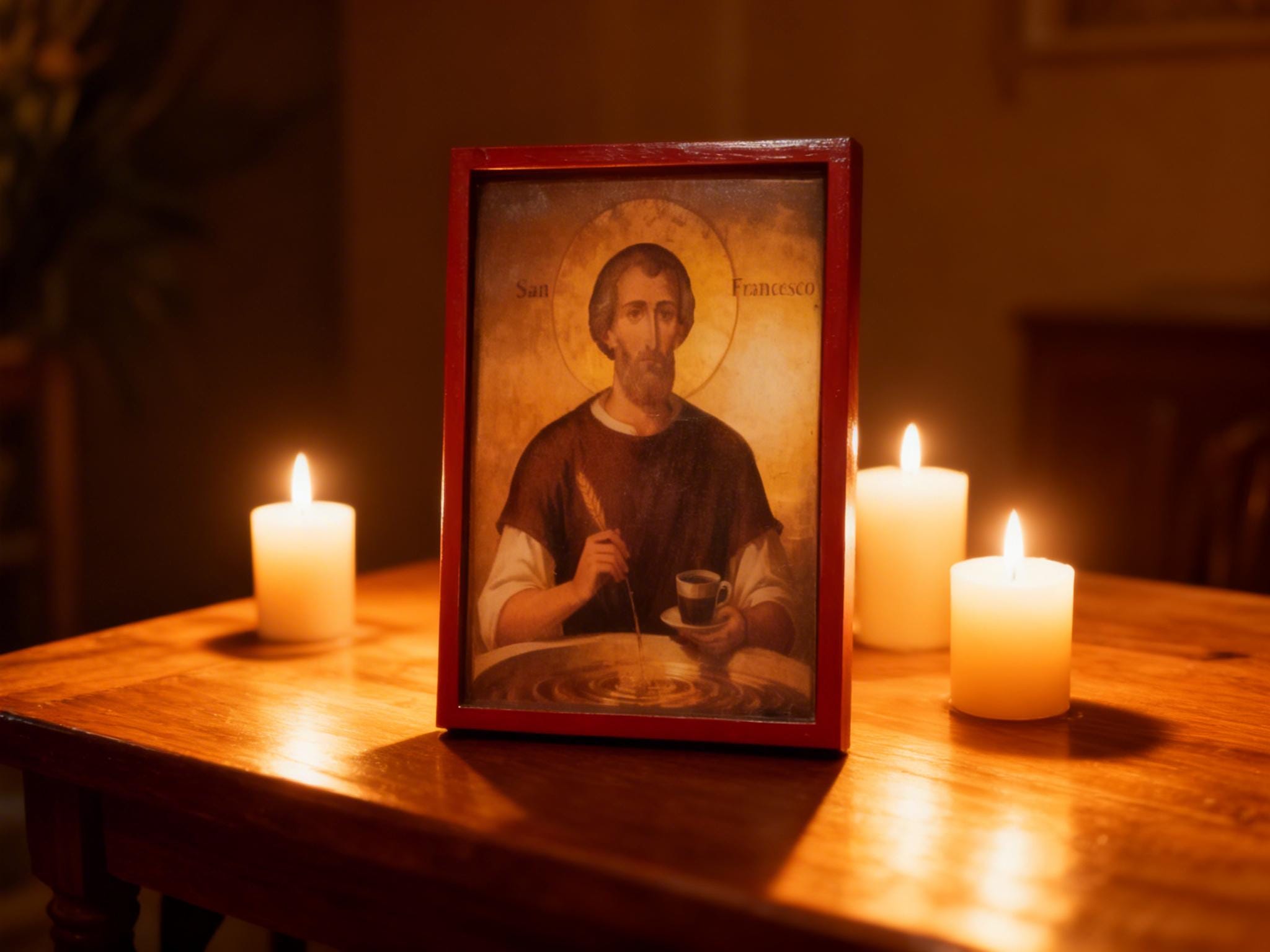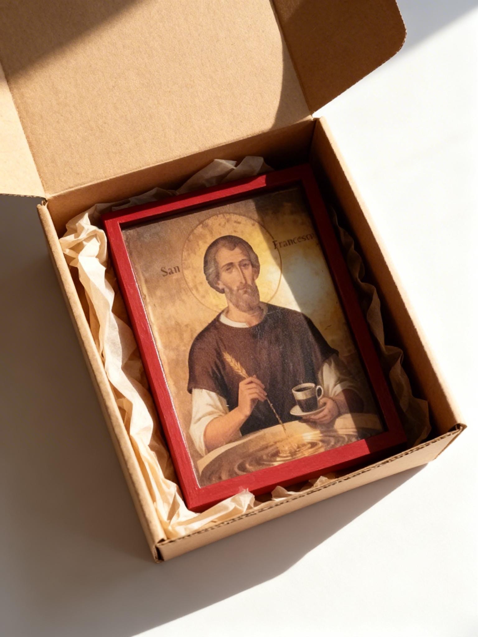 This piece blends traditional religious art with a subtle, modern twist portraying Saint Francis as a symbol of simplicity, gratitude, and even the humble joy of coffee. It’s not just decor it’s a conversation piece.