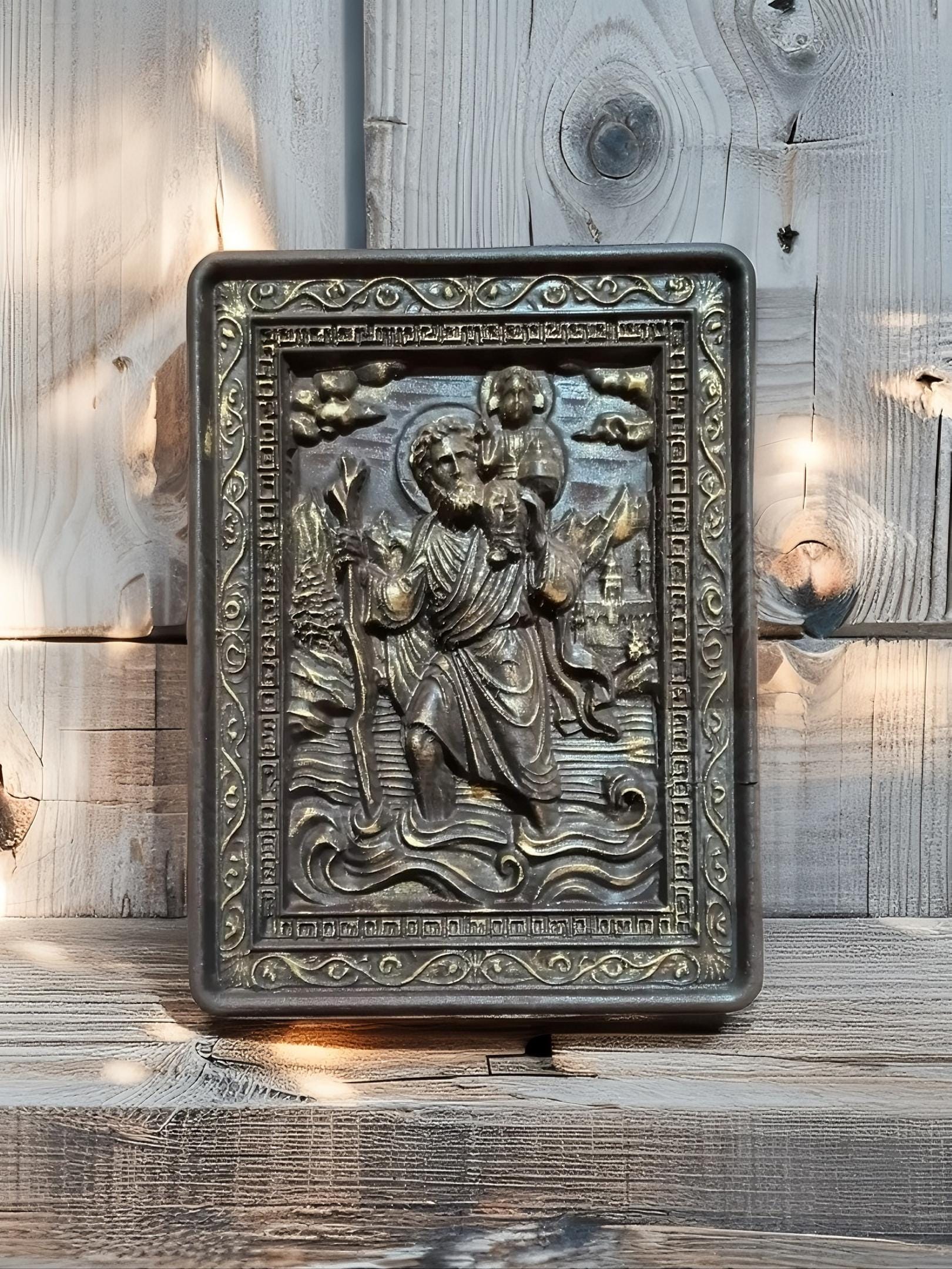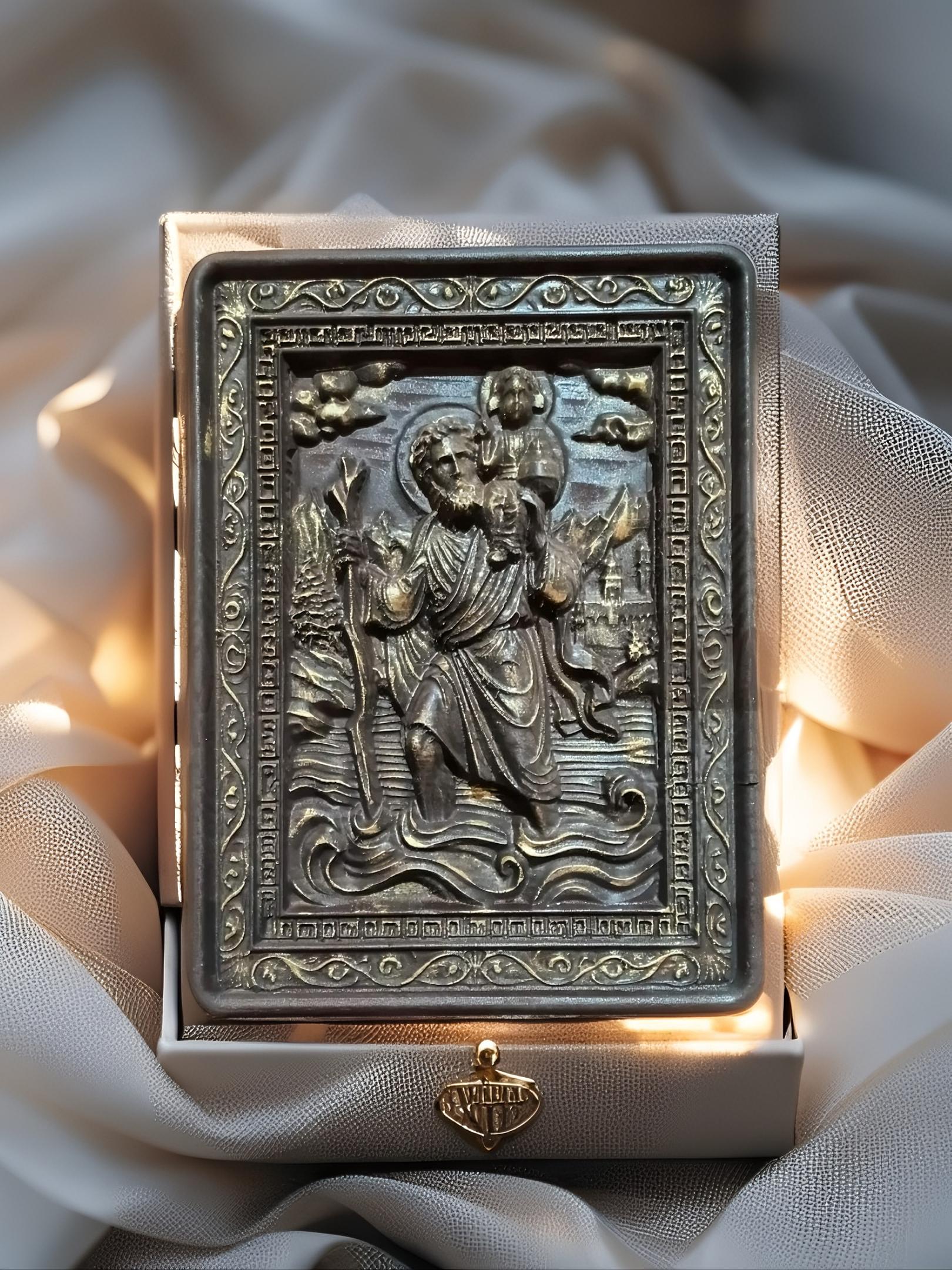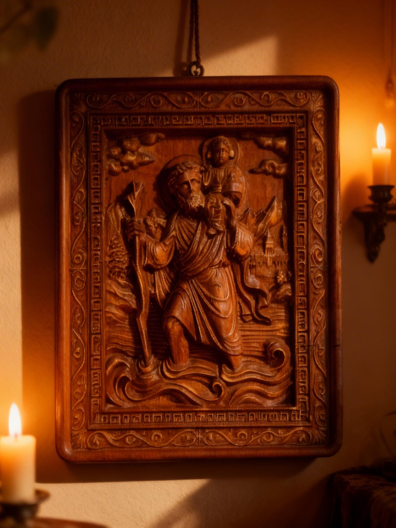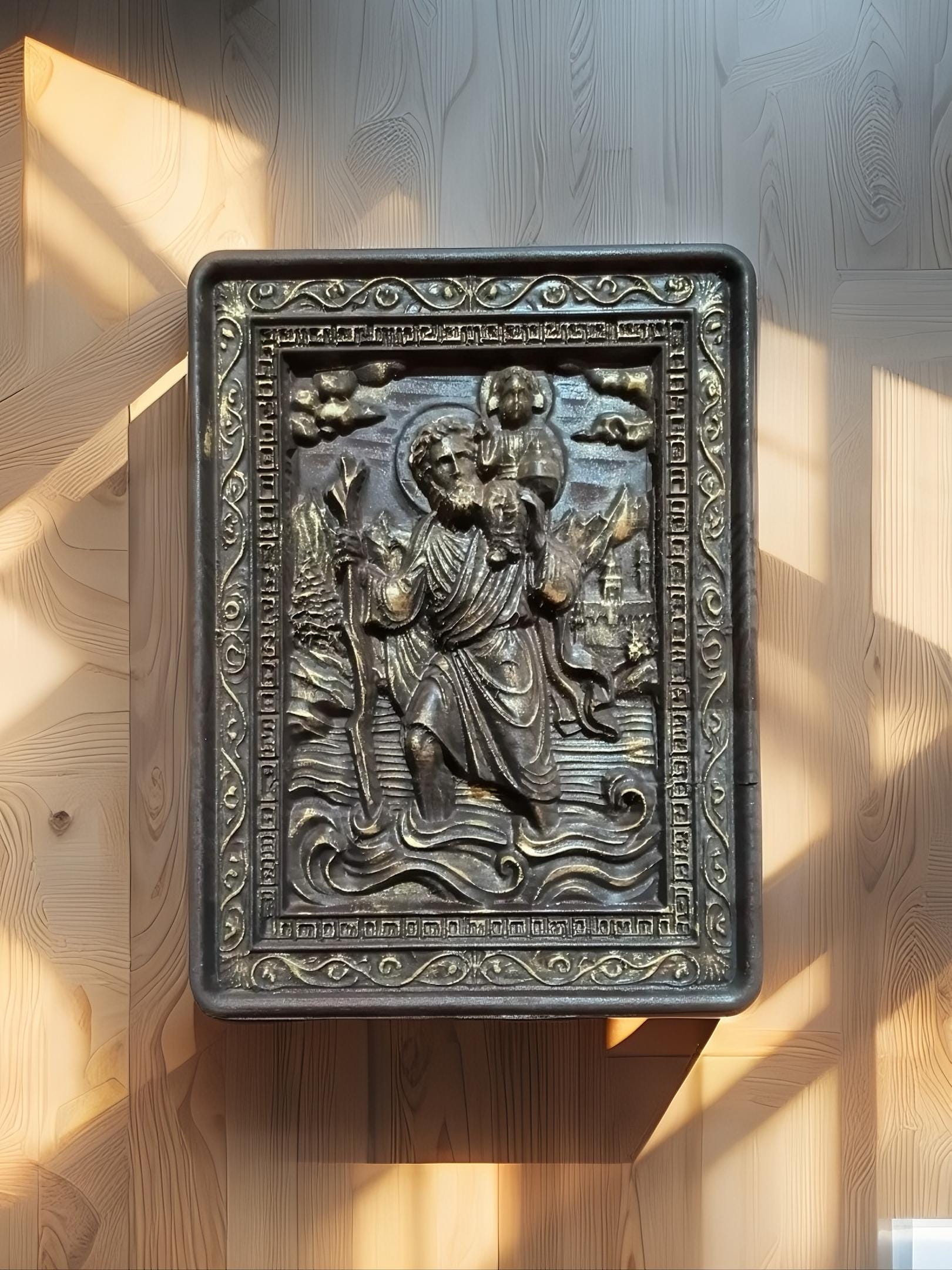 Bring spiritual protection and timeless craftsmanship into your space with this handmade wooden icon of Saint Christopher the patron saint of travelers.