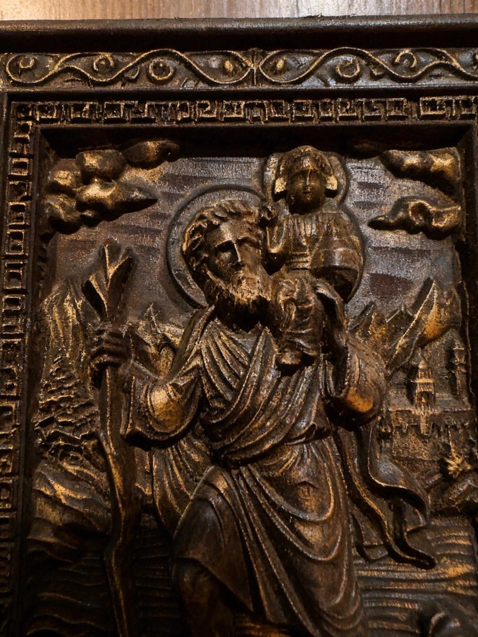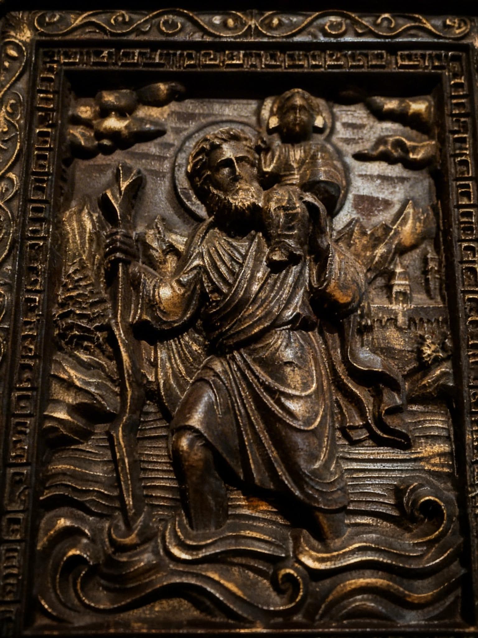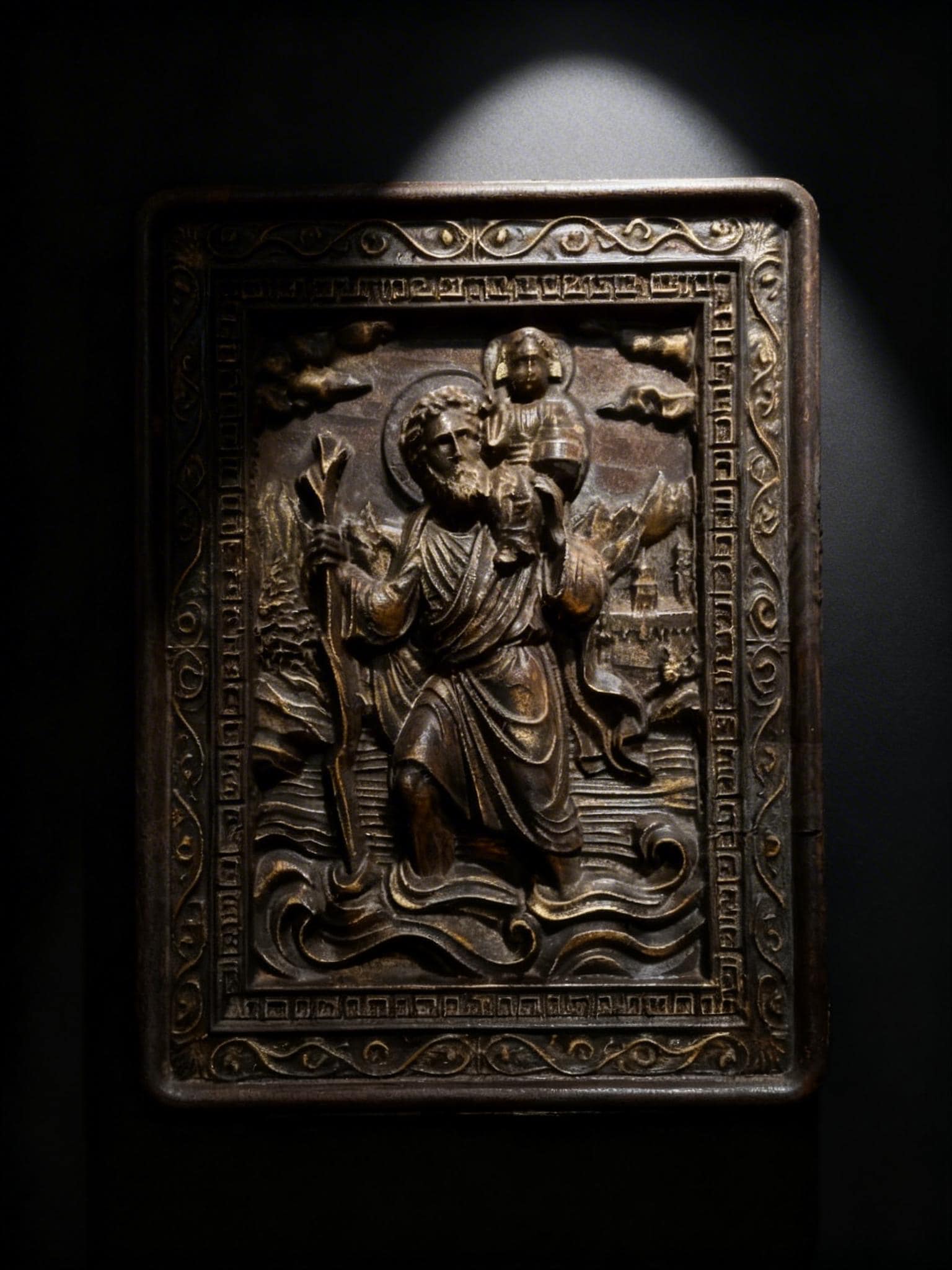 Expertly carved from wood, this piece depicts Saint Christopher carrying Christ, symbolizing strength, faith, and protection on life’s journey.