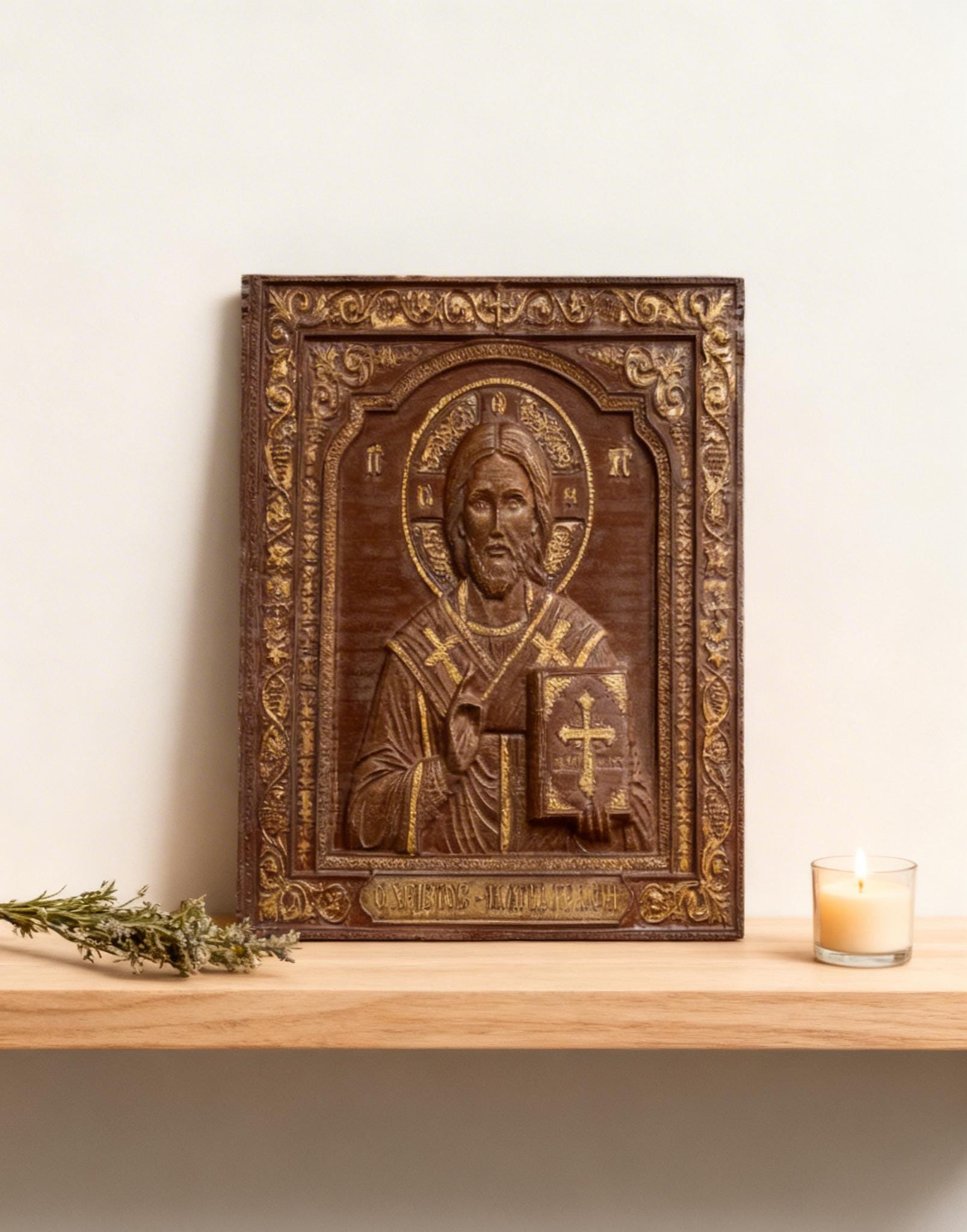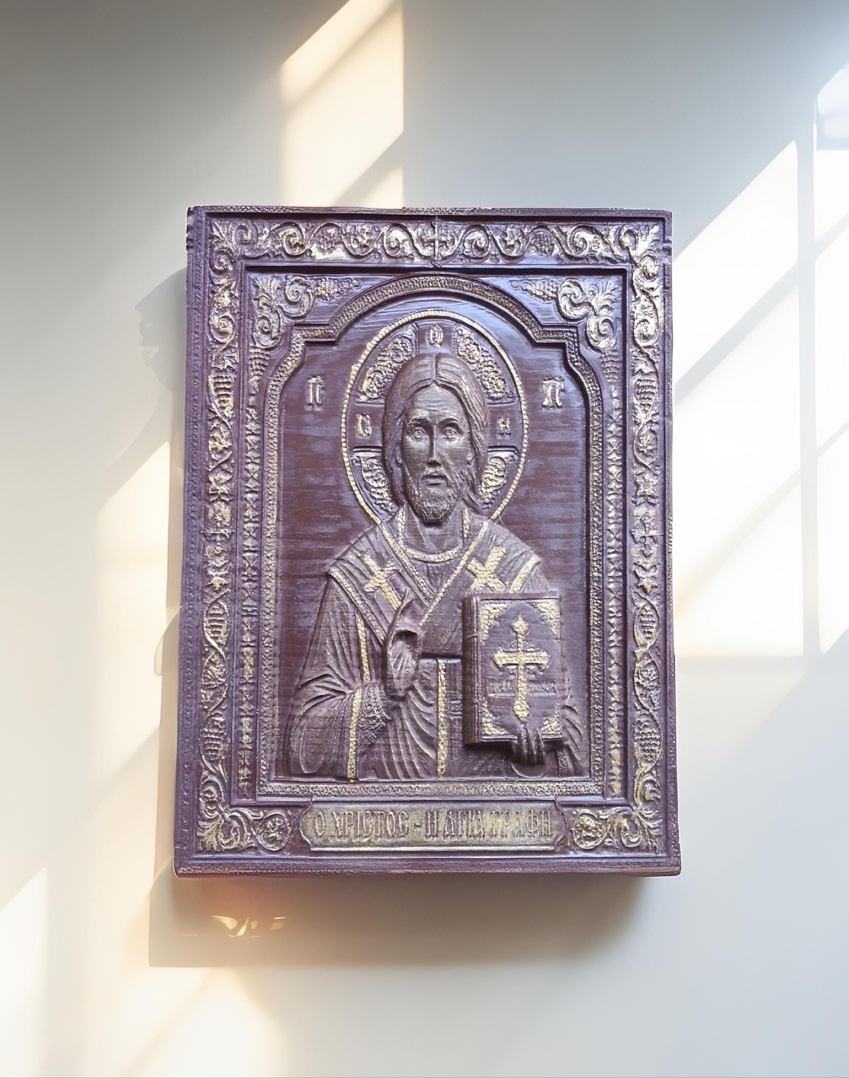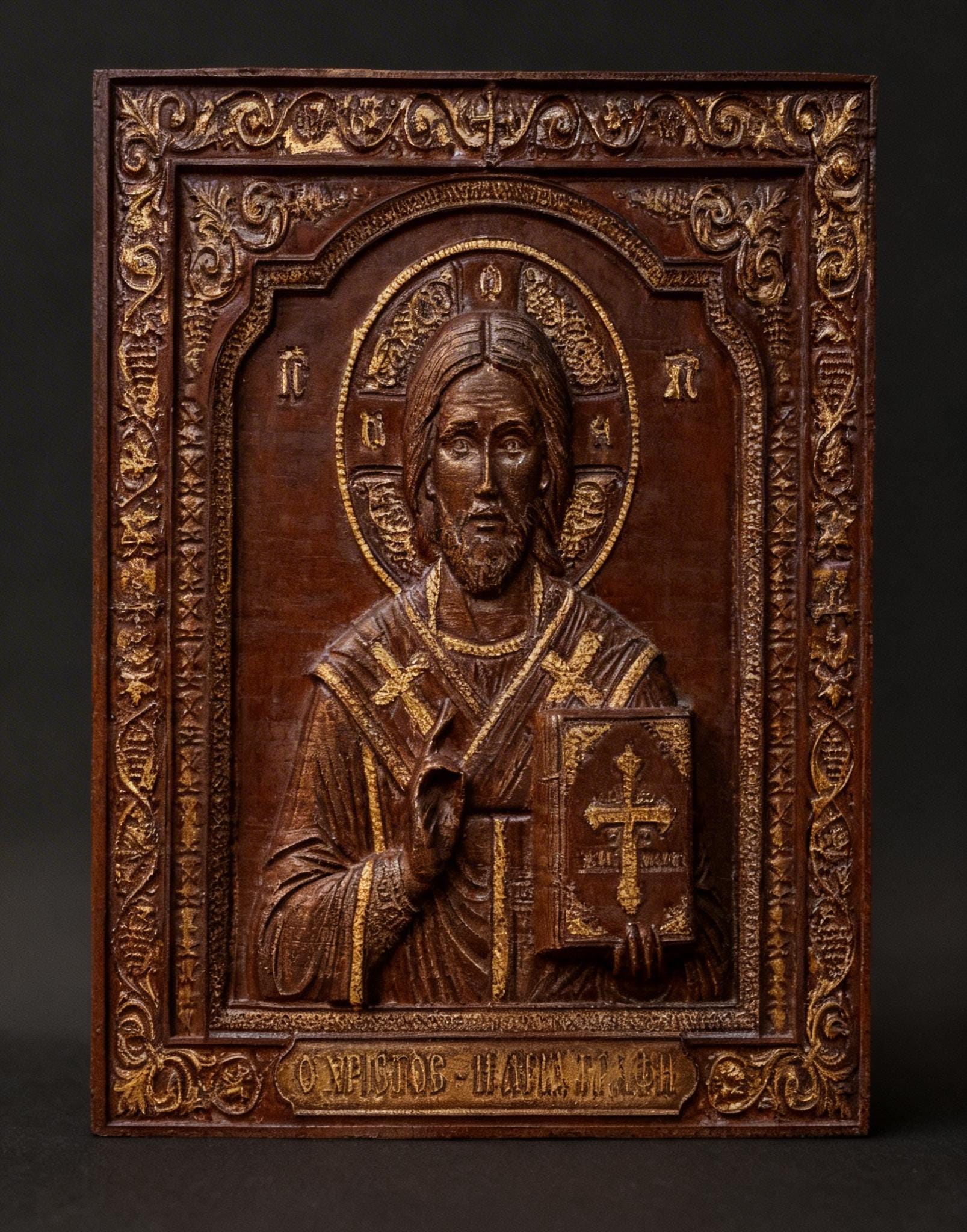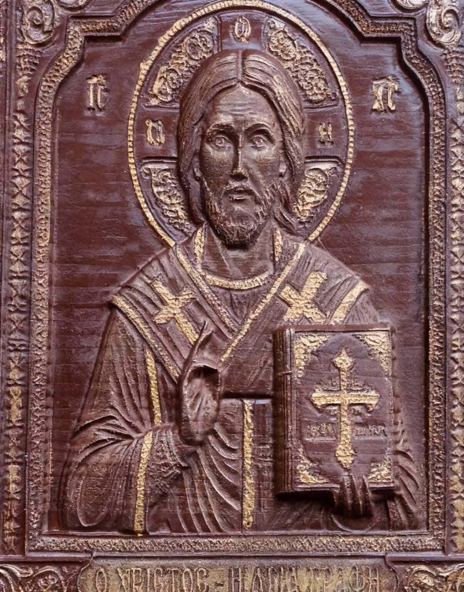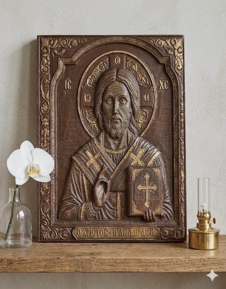 This exquisite wood-carved icon depicts Jesus Christ holding the Holy Bible. Meticulously crafted with deep respect for Orthodox tradition, this piece features intricate floral borders and gold-toned highlights that catch the light beautifully.