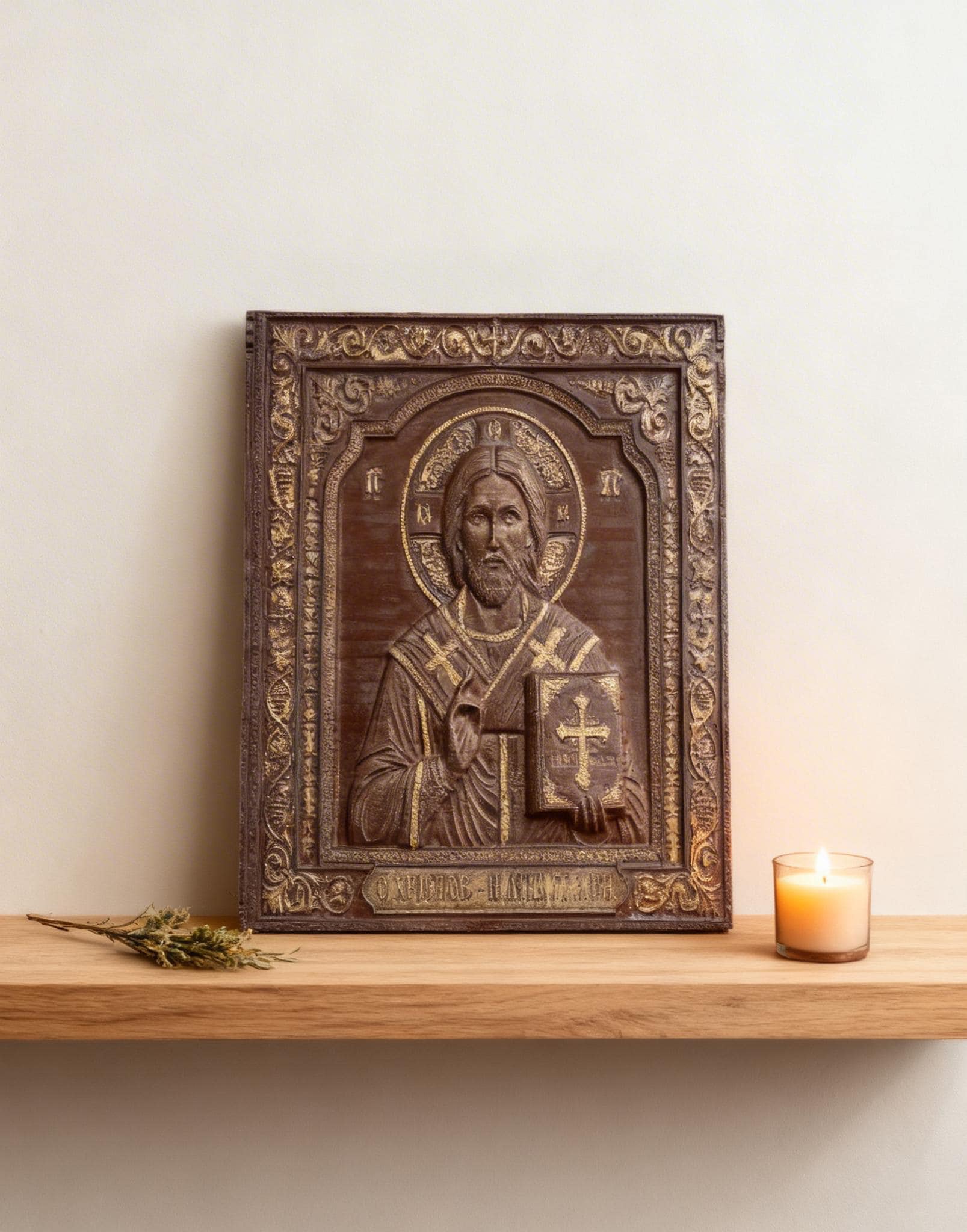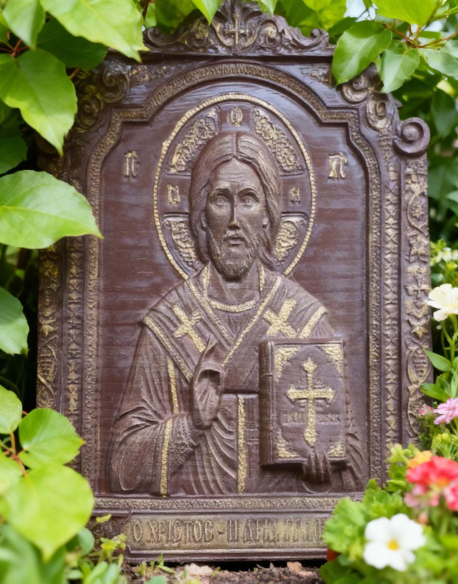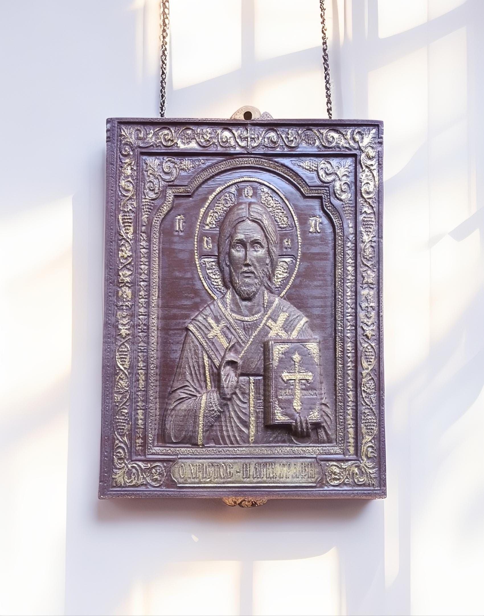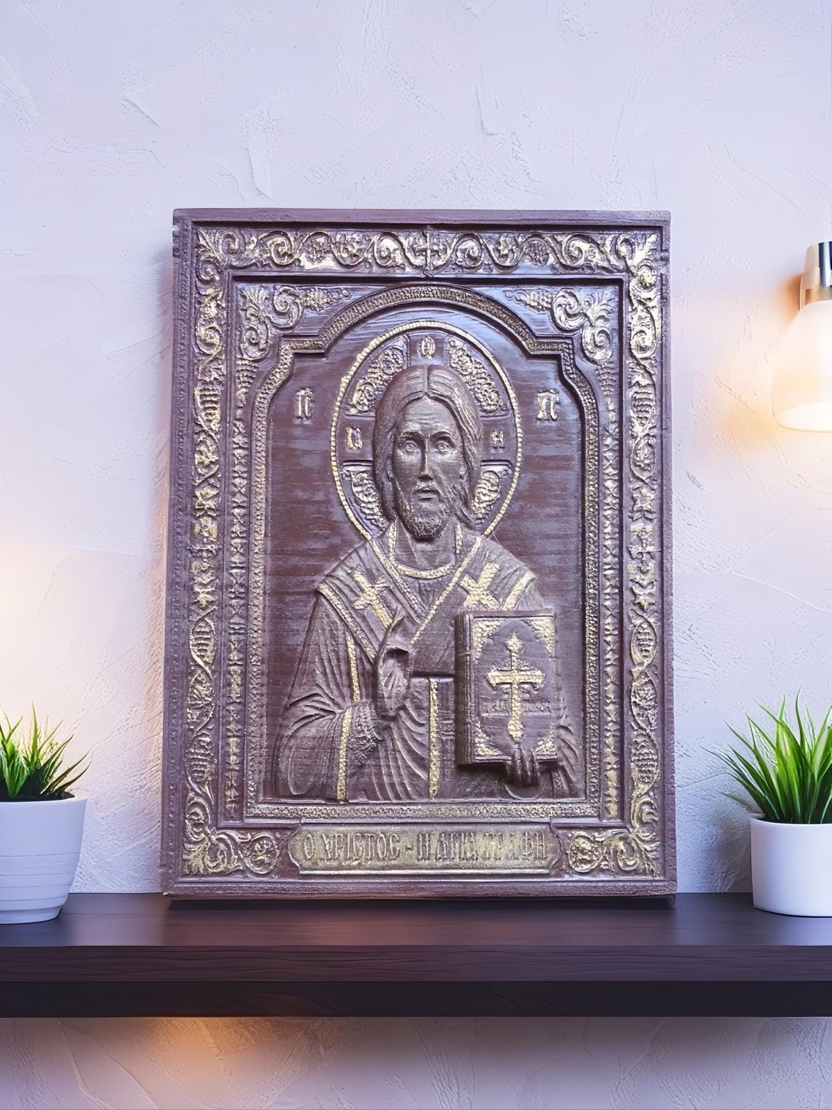 This exquisite wood-carved icon depicts Jesus Christ holding the Holy Bible. Meticulously crafted with deep respect for Orthodox tradition, this piece features intricate floral borders and gold-toned highlights that catch the light beautifully.