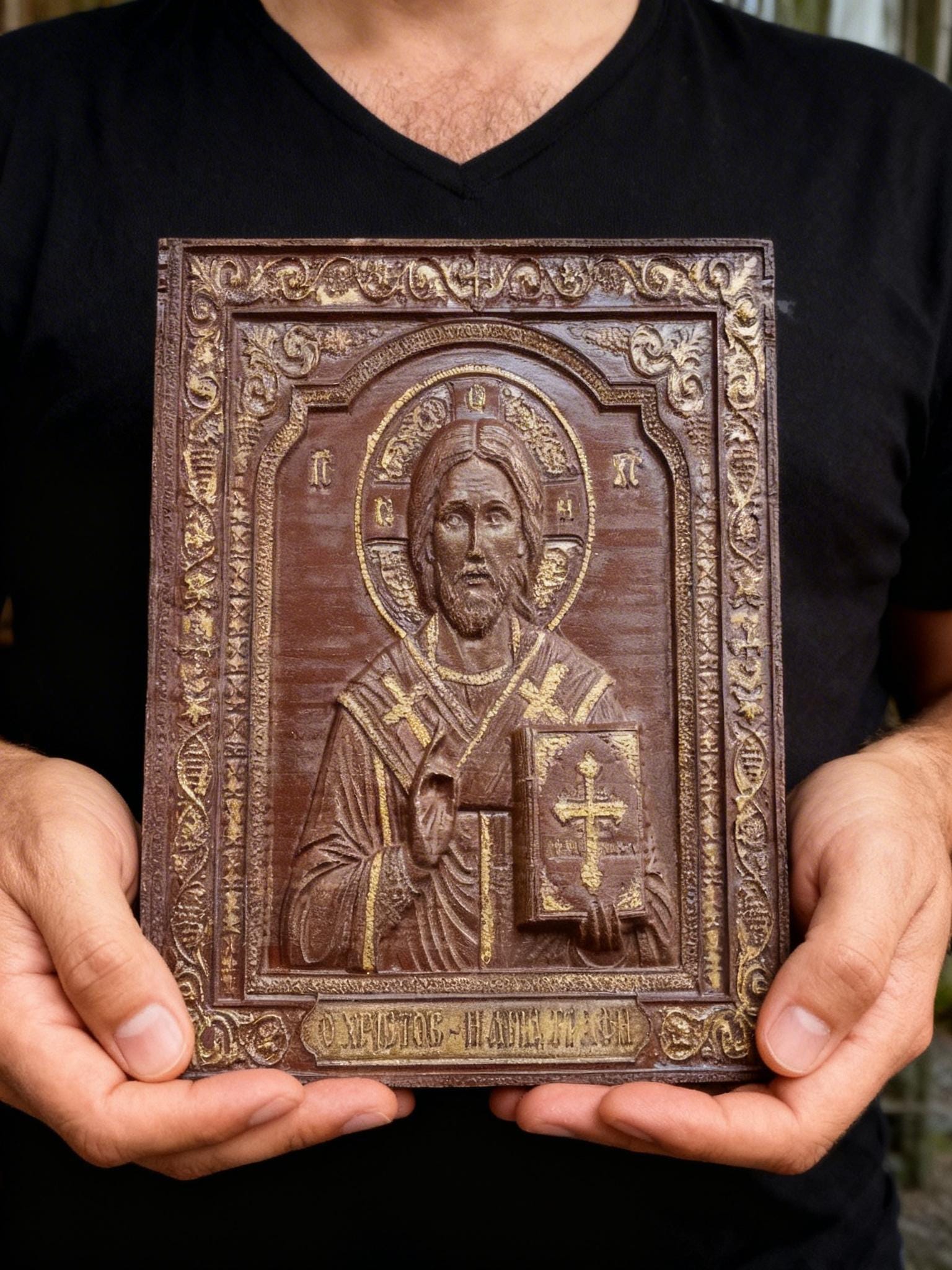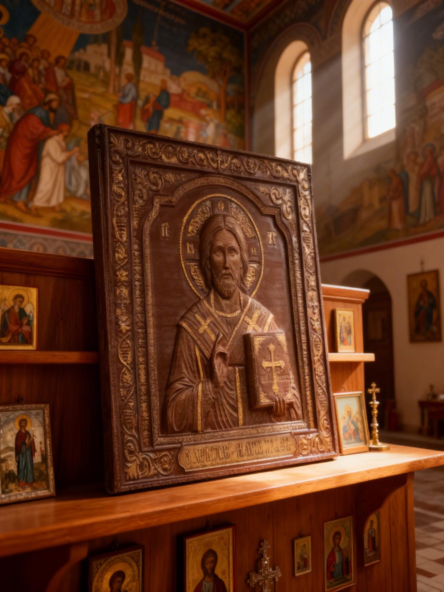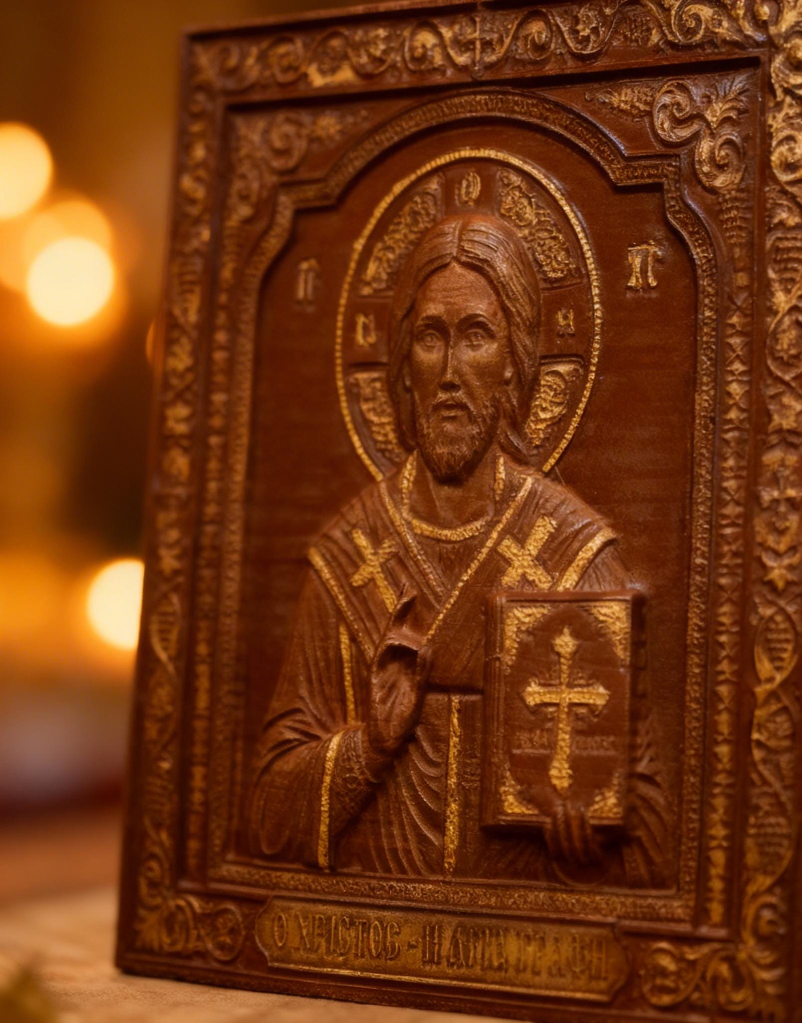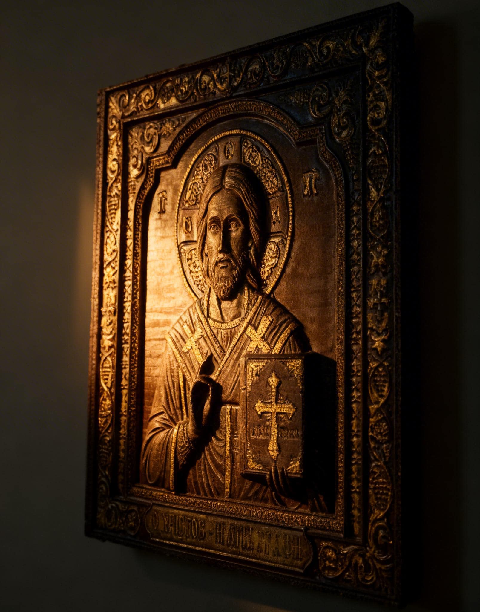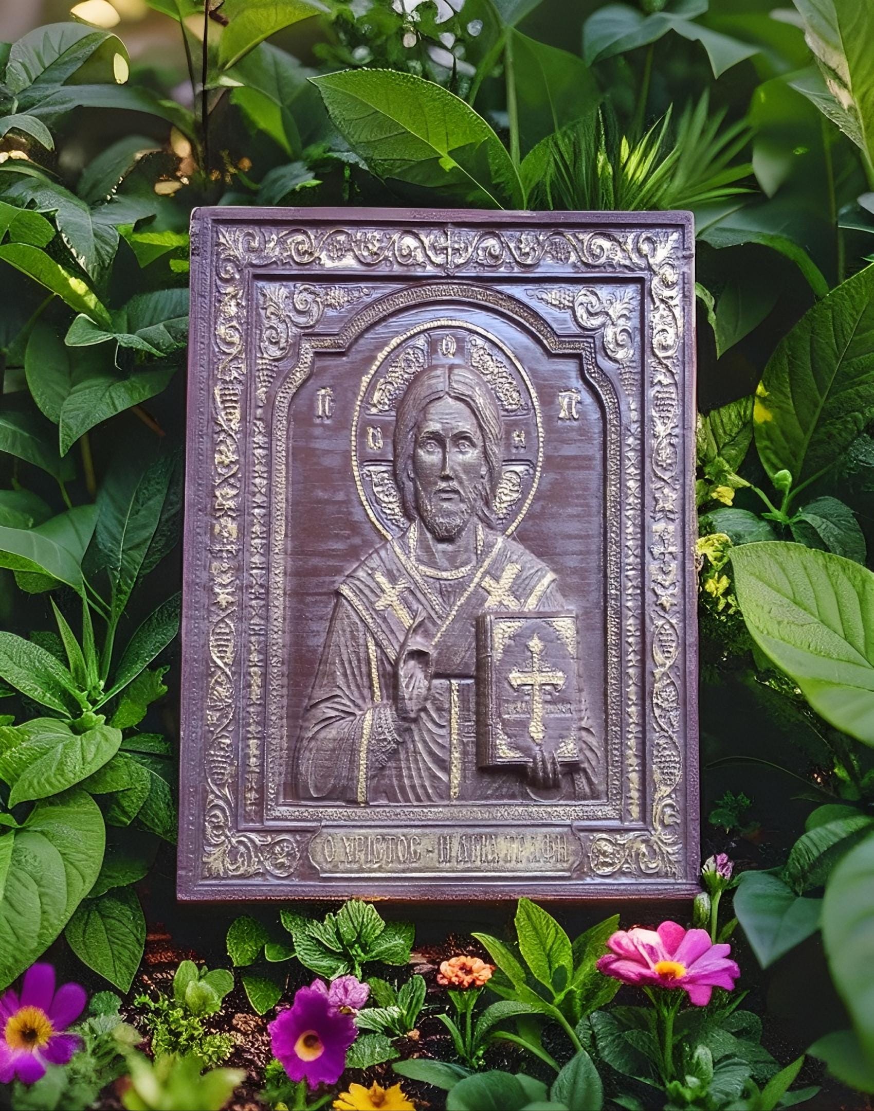 This exquisite wood-carved icon depicts Jesus Christ holding the Holy Bible. Meticulously crafted with deep respect for Orthodox tradition, this piece features intricate floral borders and gold-toned highlights that catch the light beautifully.