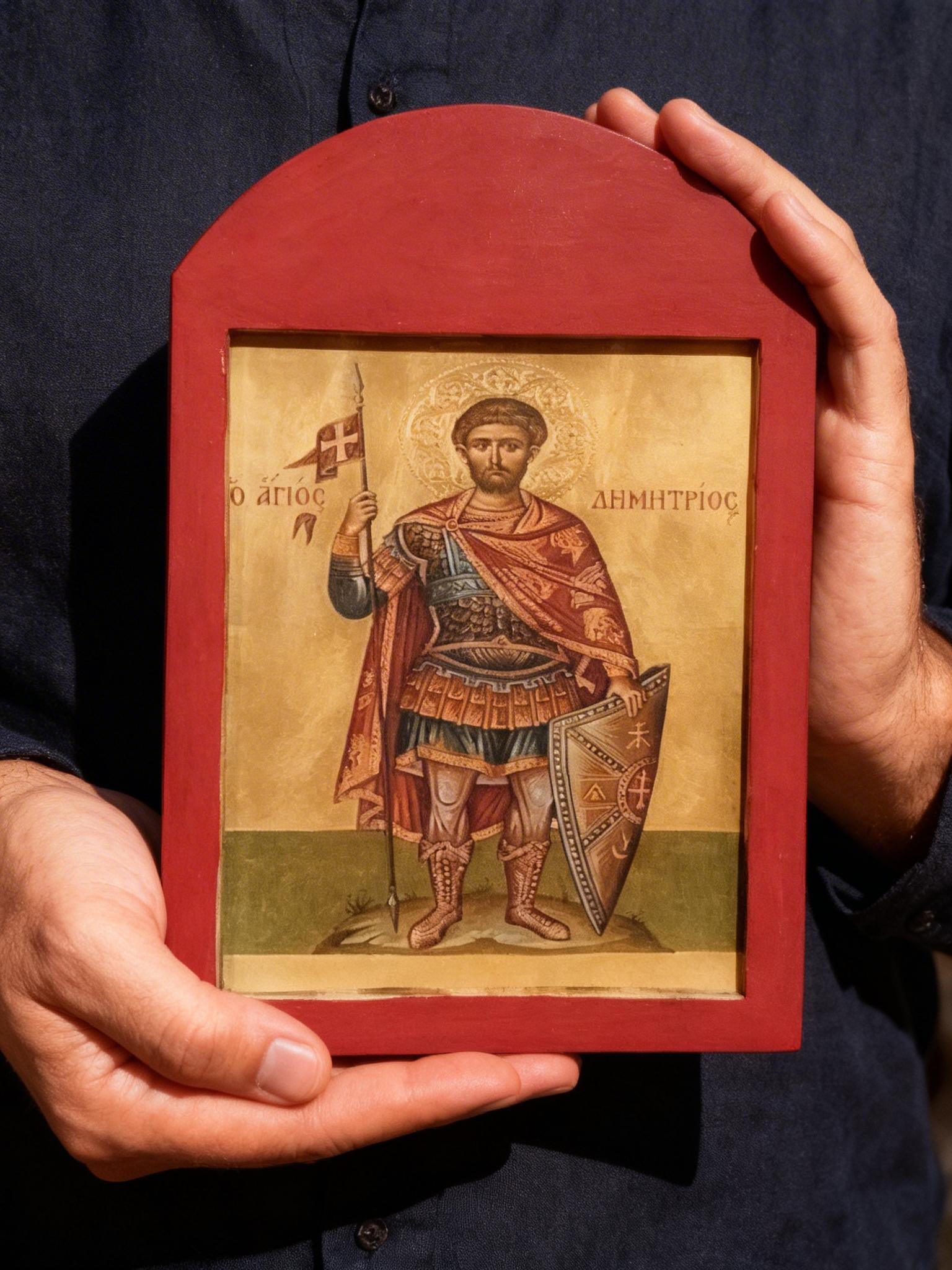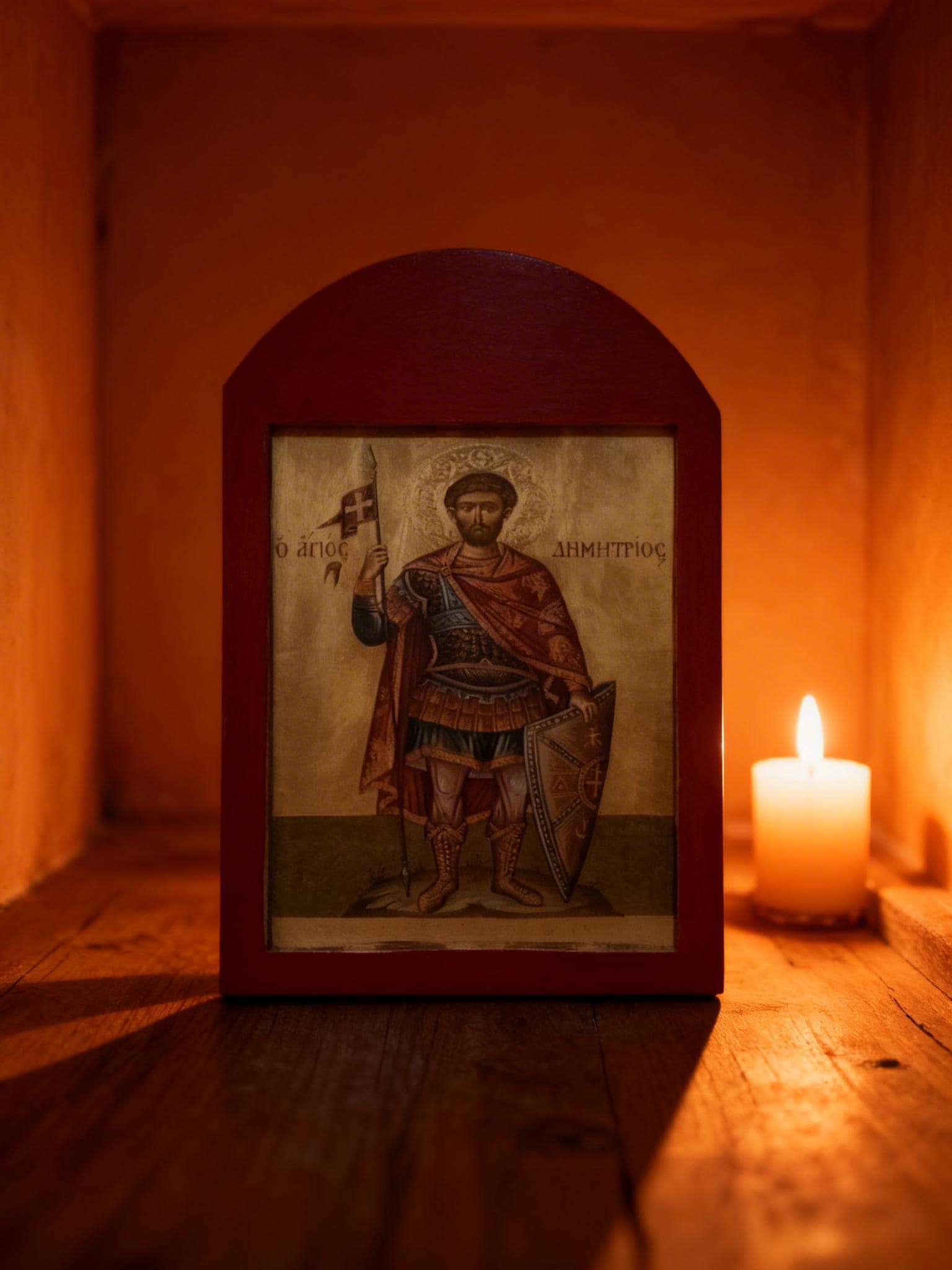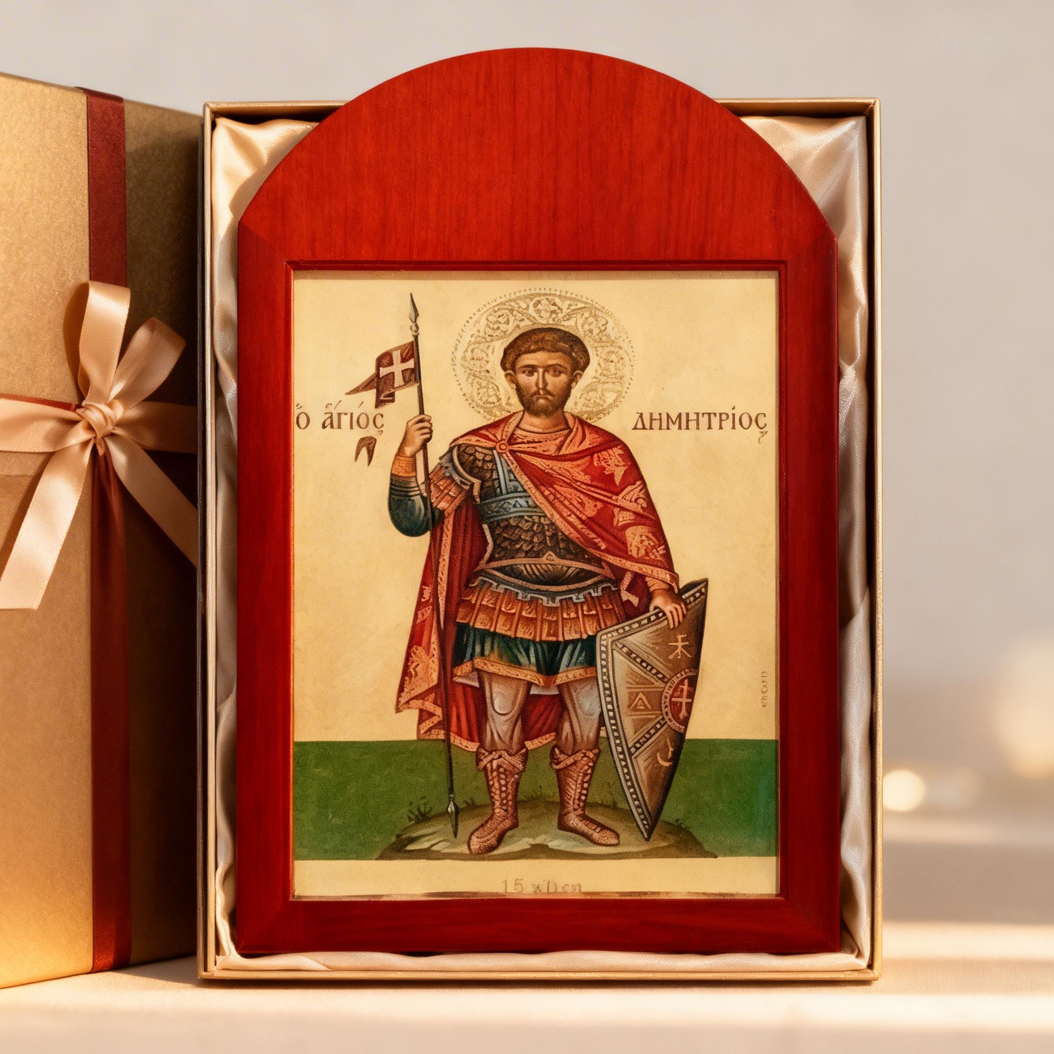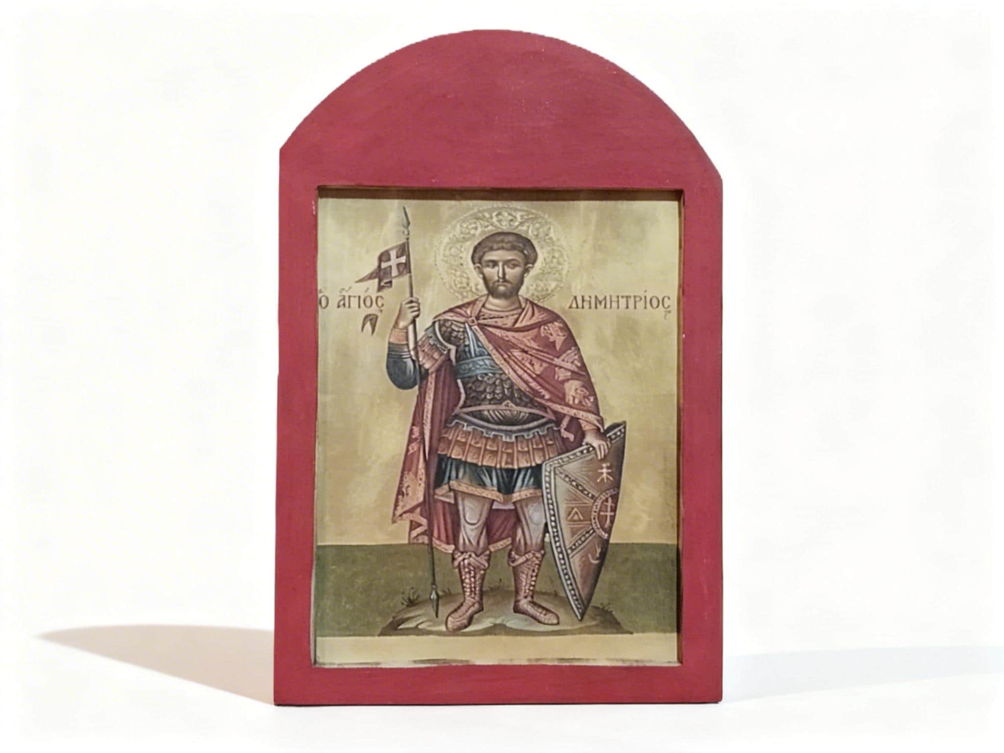 A handcrafted wooden icon of Saint Demetrios, created with care and respect for Orthodox tradition.