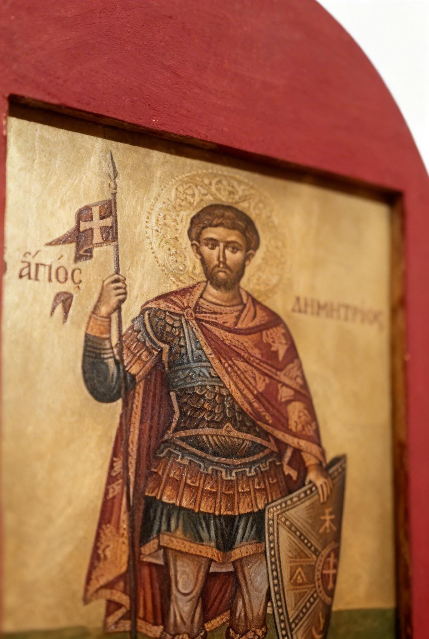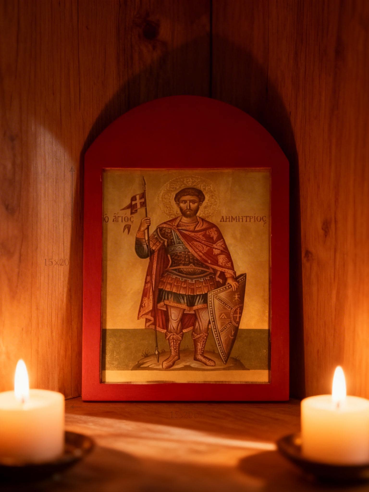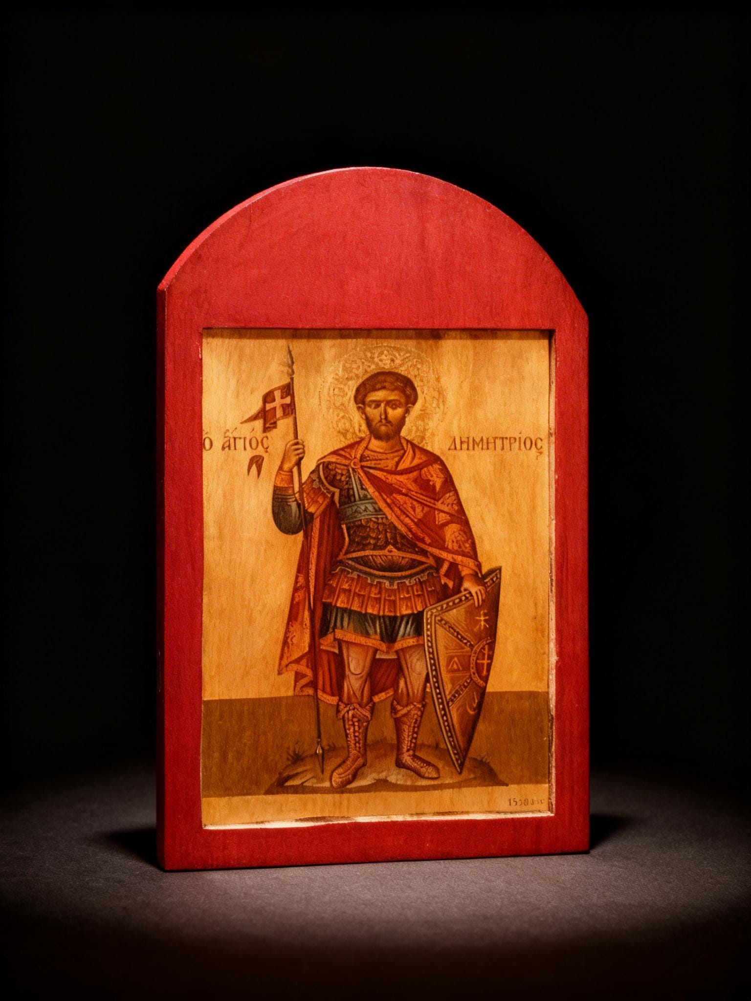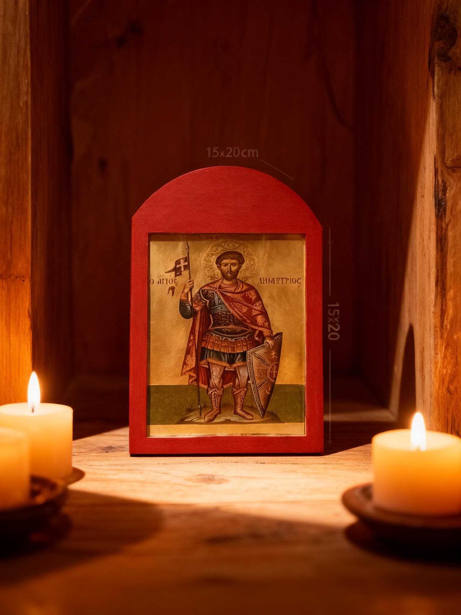 A handcrafted wooden icon of Saint Demetrios, created with care and respect for Orthodox tradition.