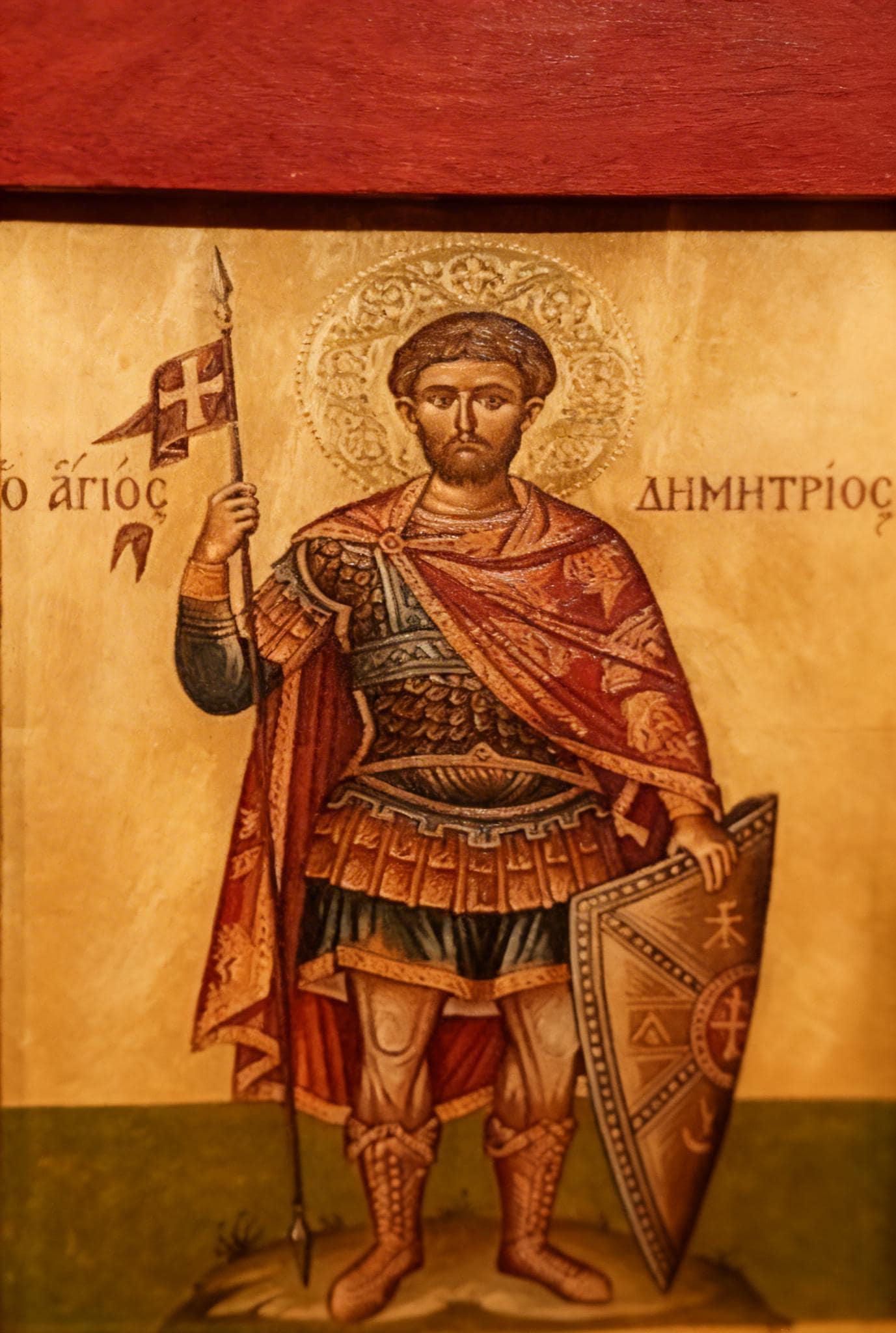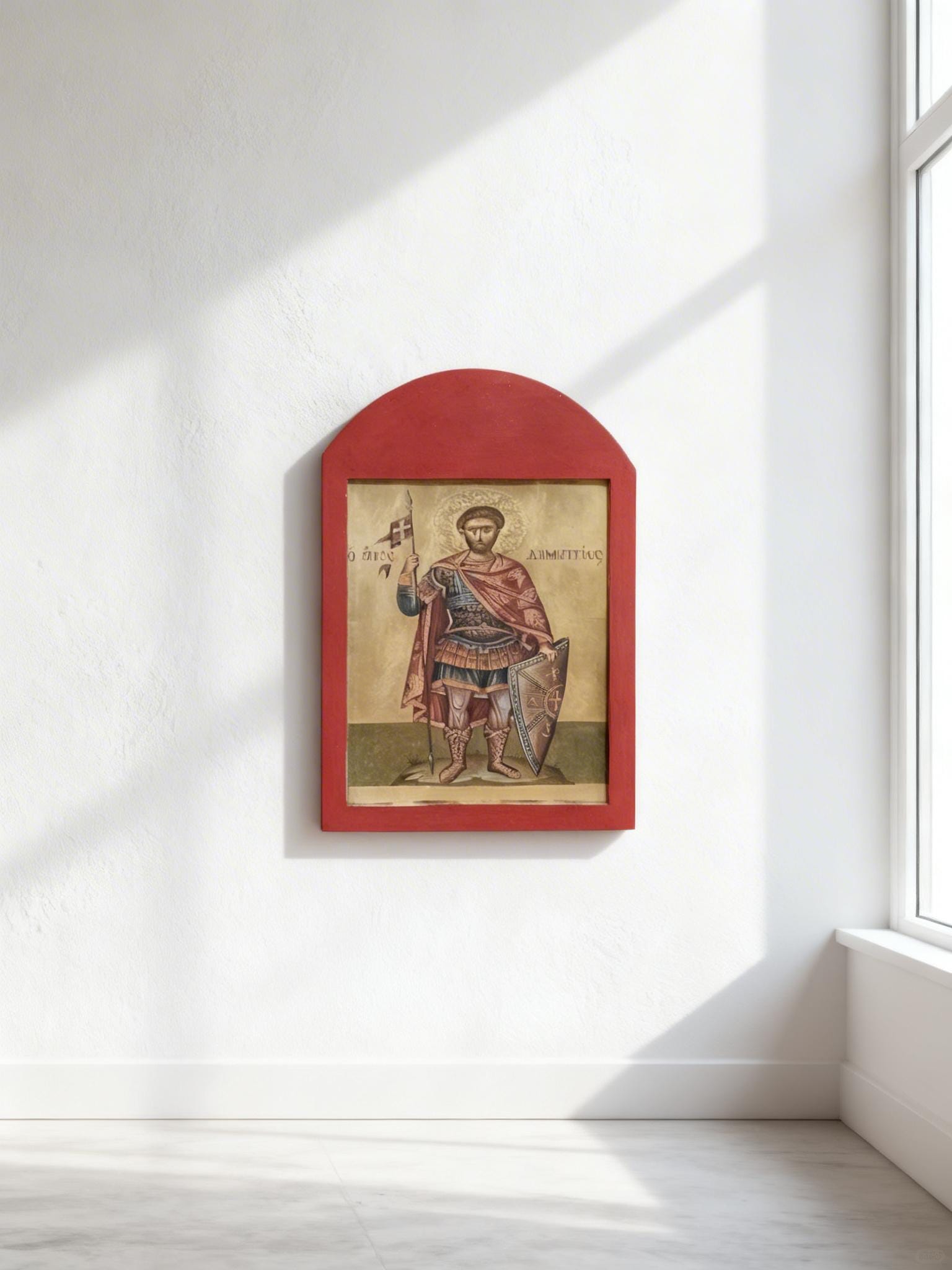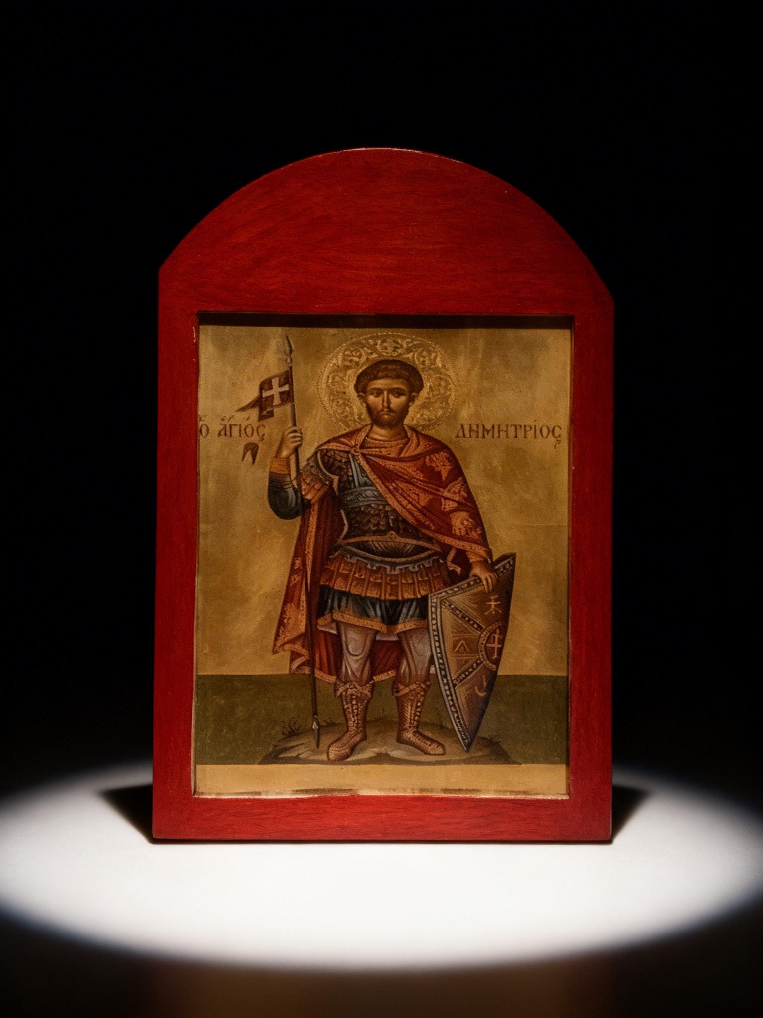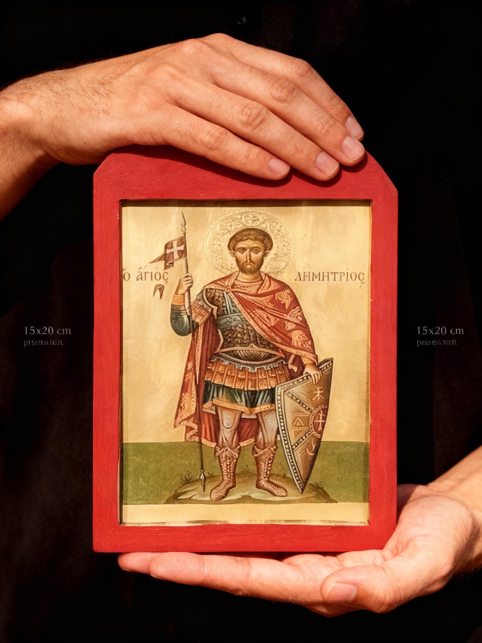 A handcrafted wooden icon of Saint Demetrios, created with care and respect for Orthodox tradition.