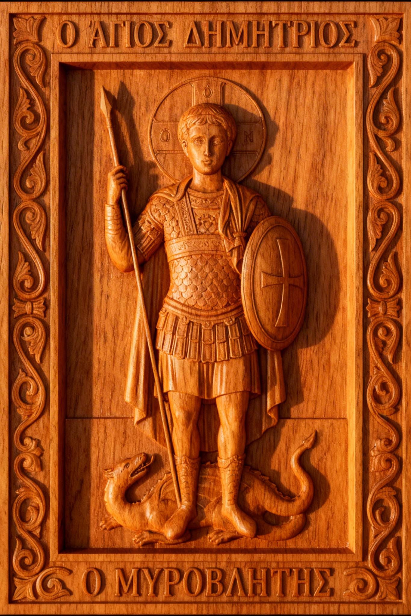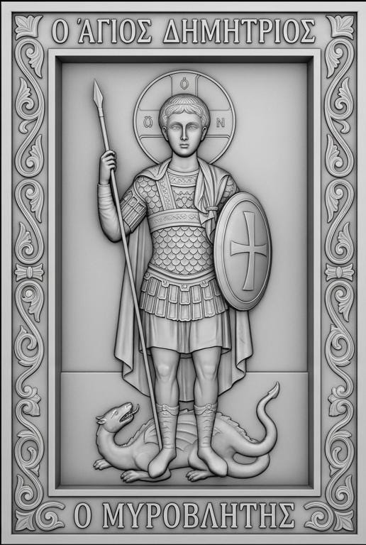 Bring the power and symbolism of Saint Demetrios the Myrrh Streamer (Agios Dimitrios) into your creations with this high-detail 3D relief STL file, designed for CNC carving, laser engraving, and 3D printing.