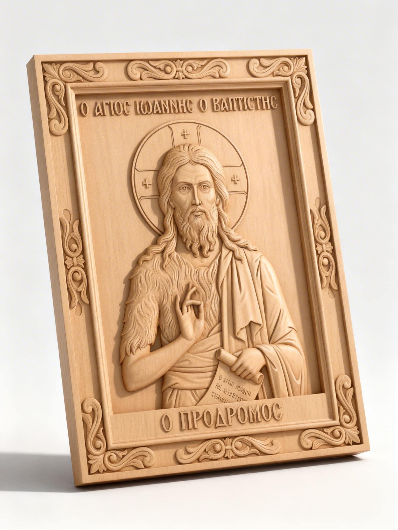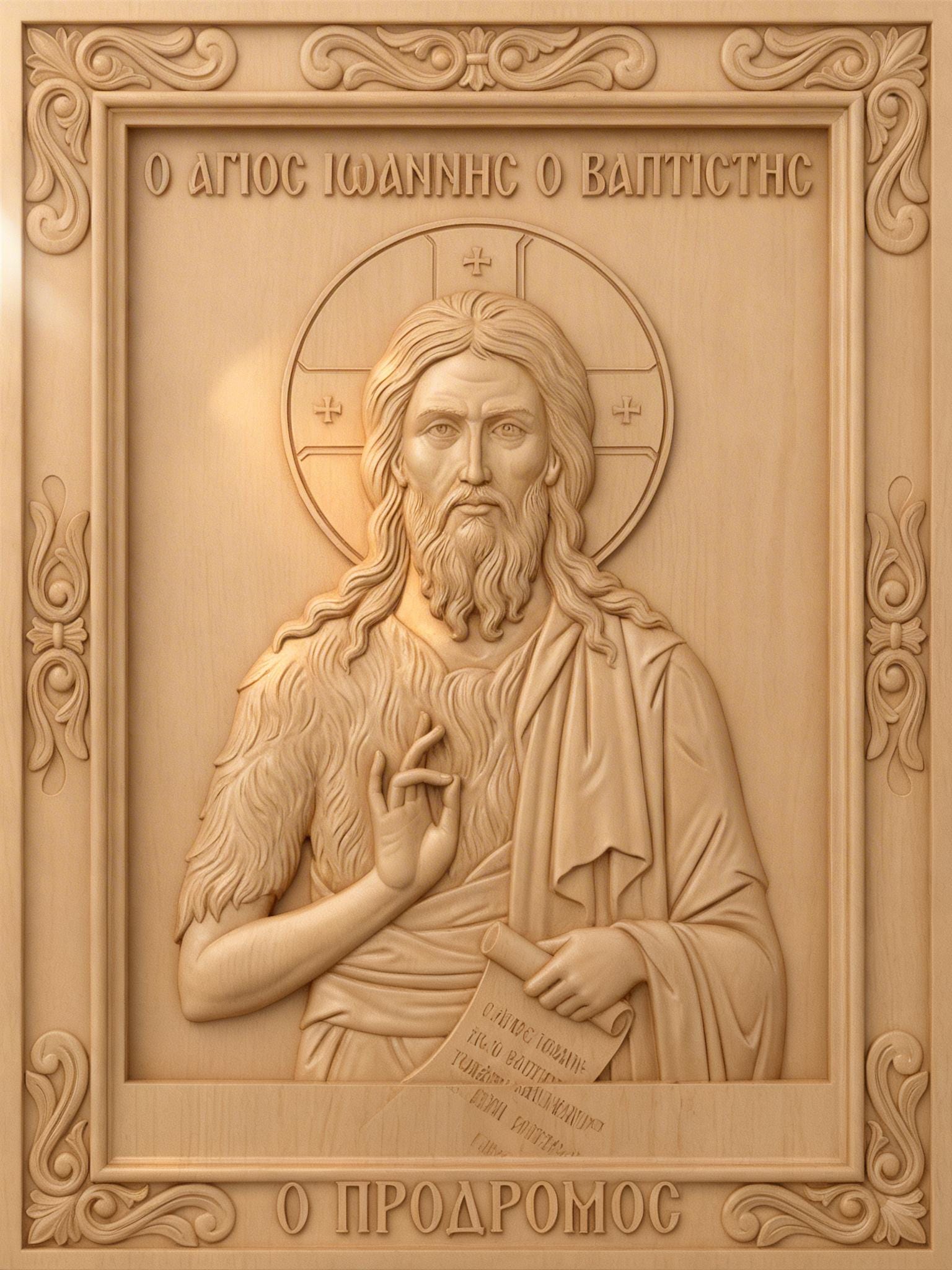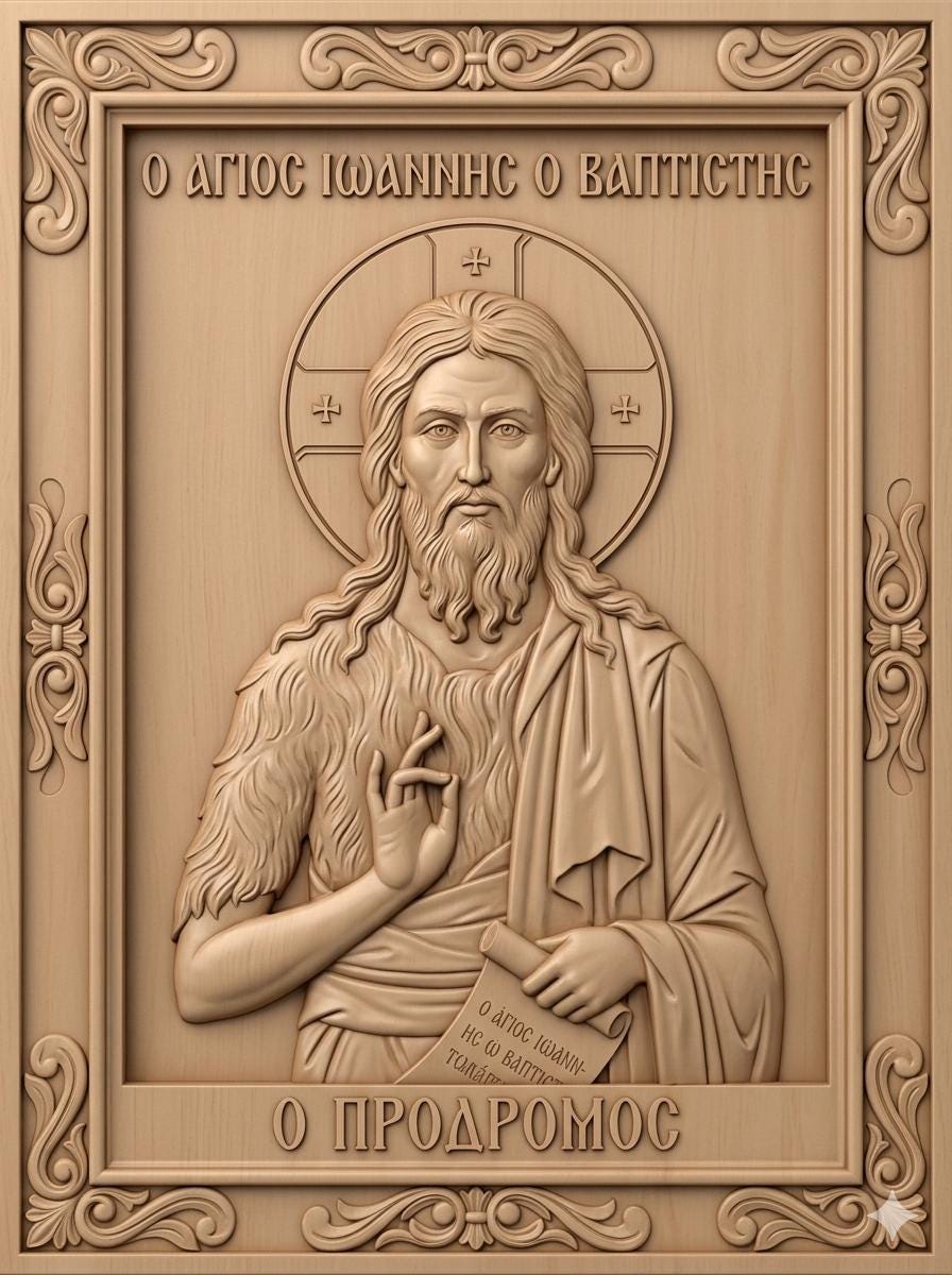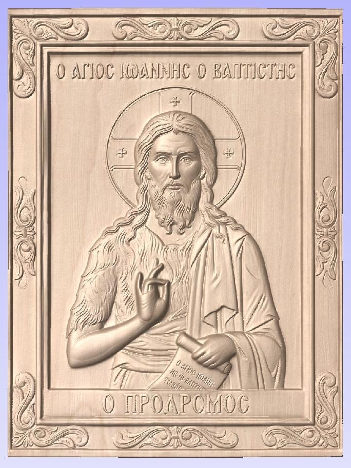 High-quality STL file featuring Saint John the Baptist (Prodromos) in a traditional Orthodox icon style. Designed for precision and depth, this 3D relief model is perfect for CNC carving, engraving, and 3D printing.