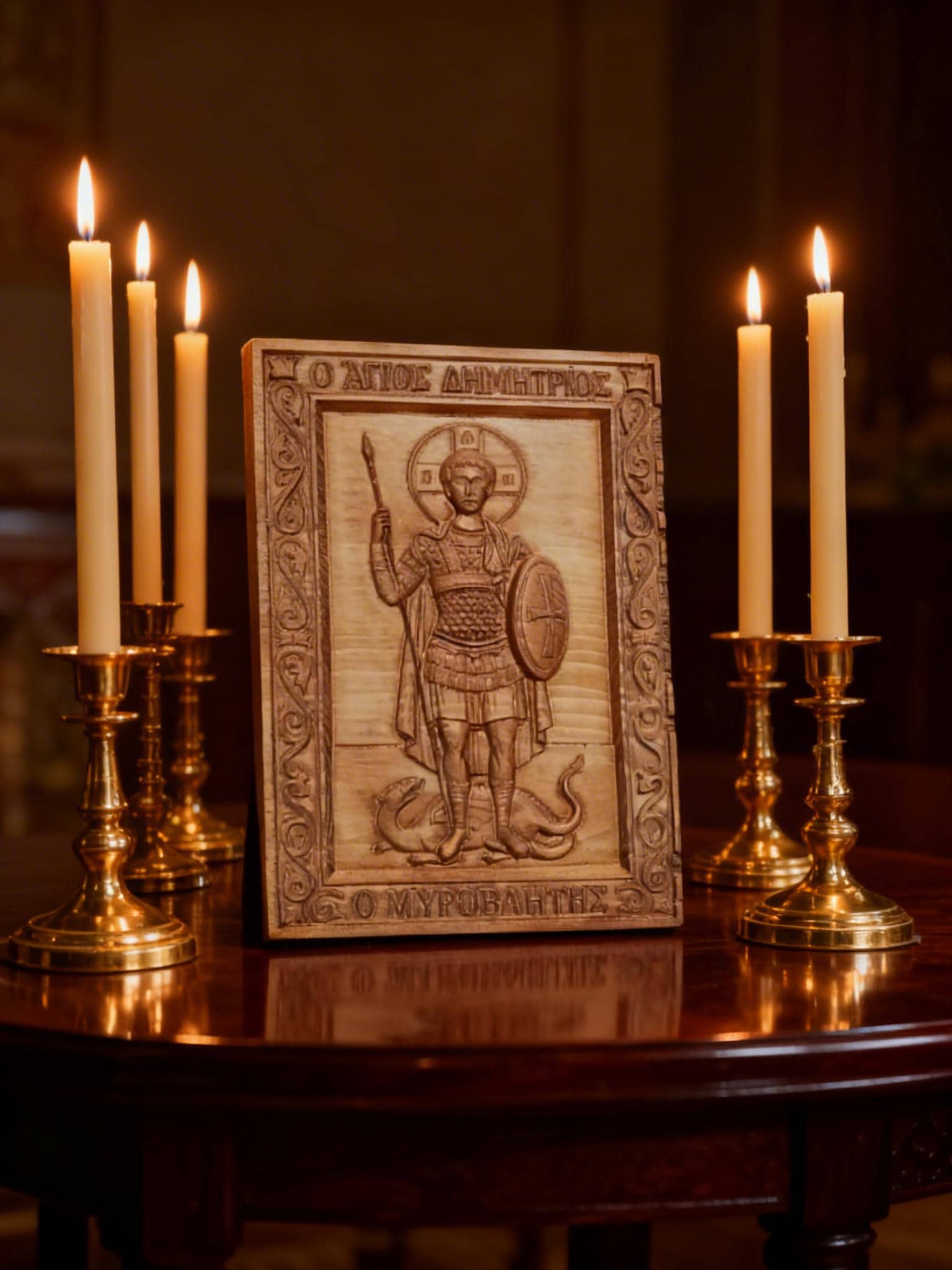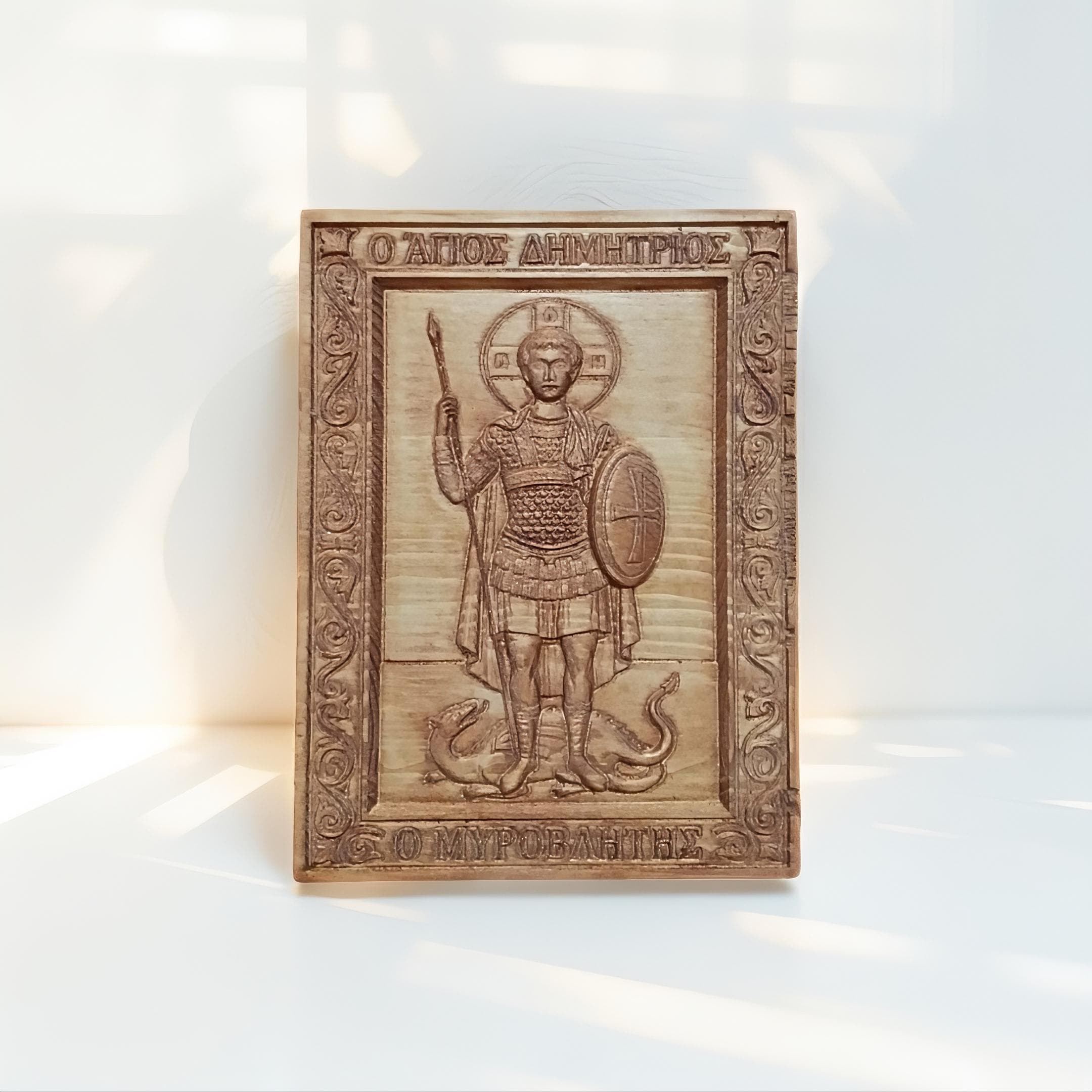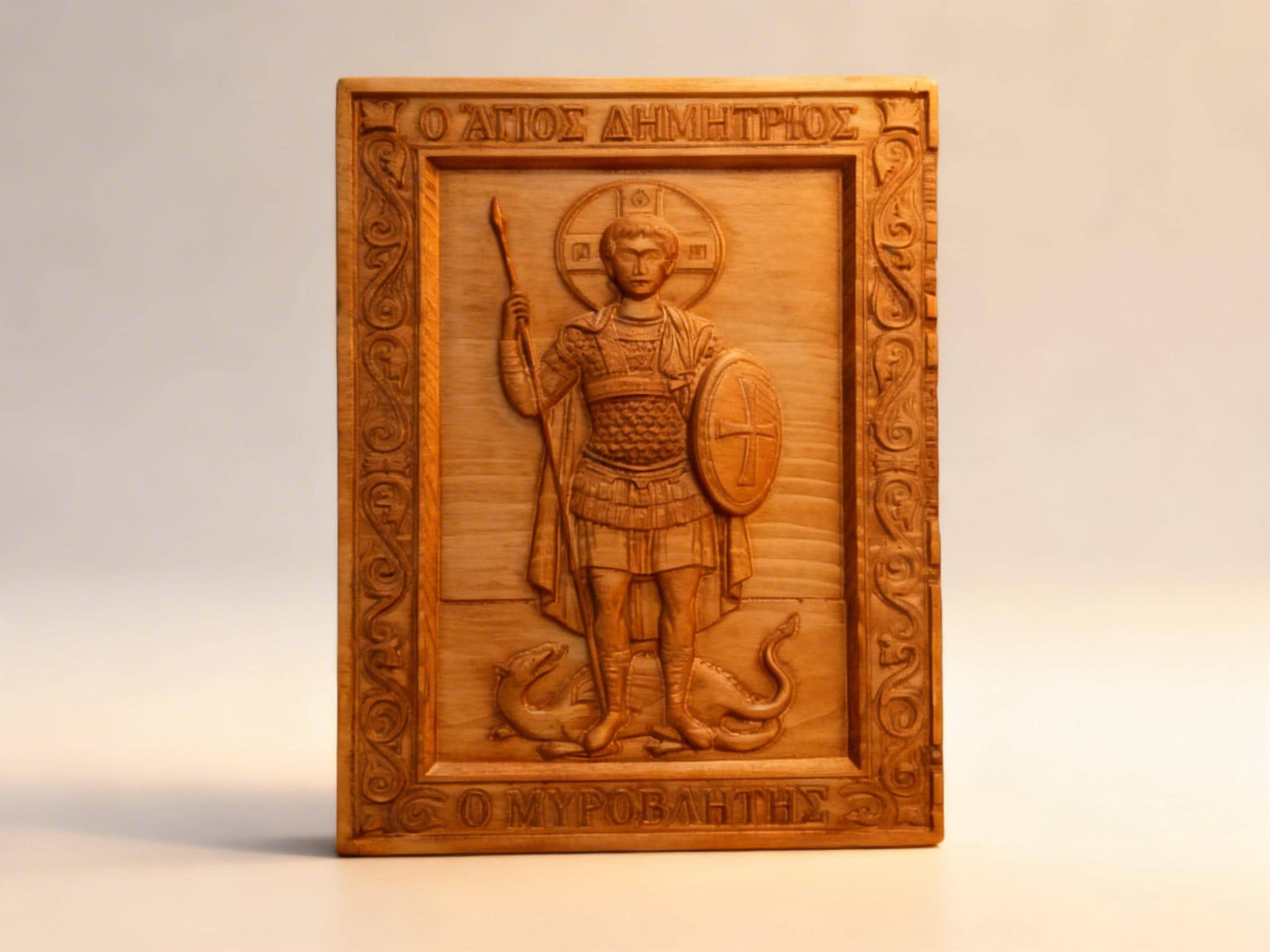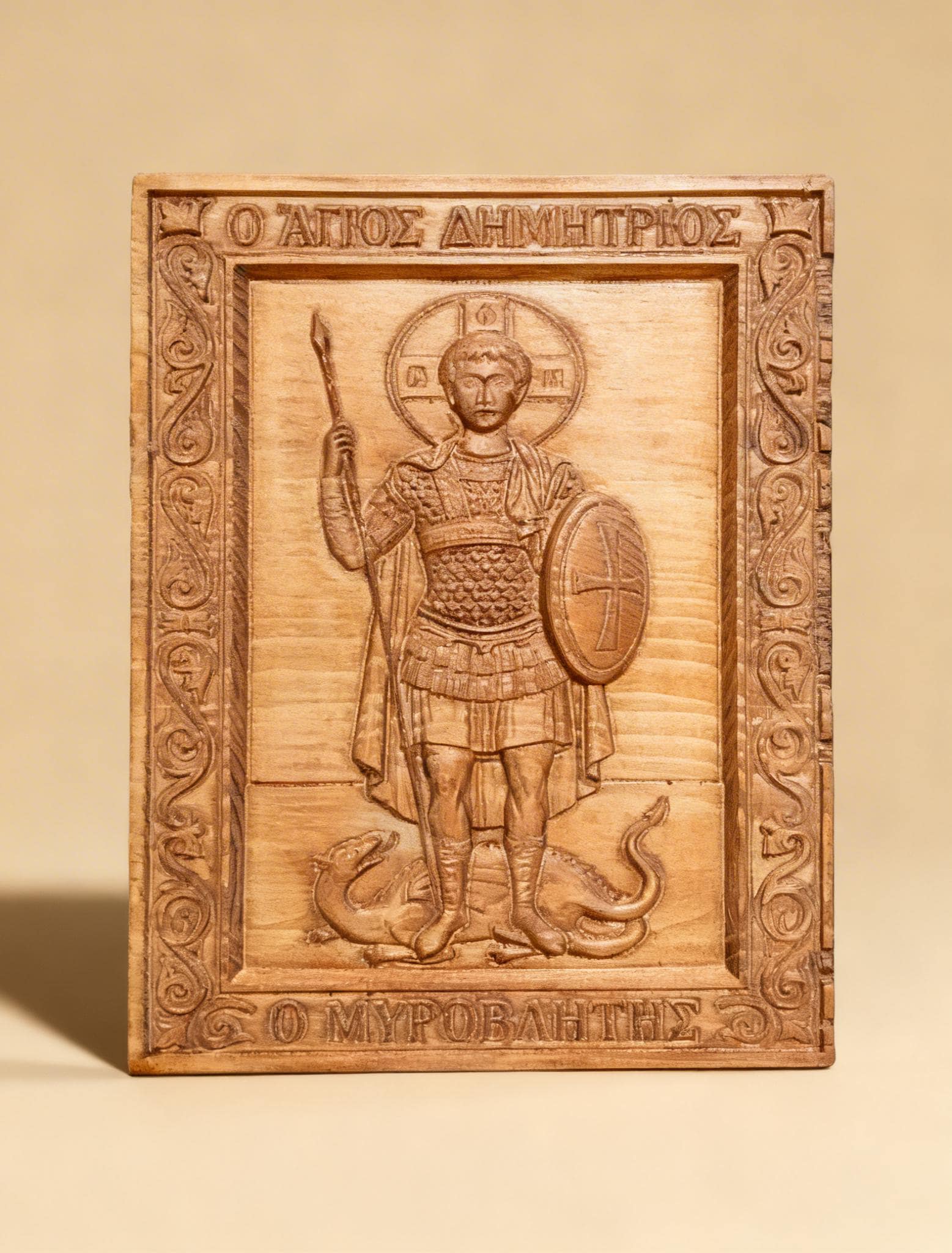 Handmade wood carved icon of Saint Demetrios (Saint Demetrius), crafted with precision and respect to Orthodox Christian tradition.