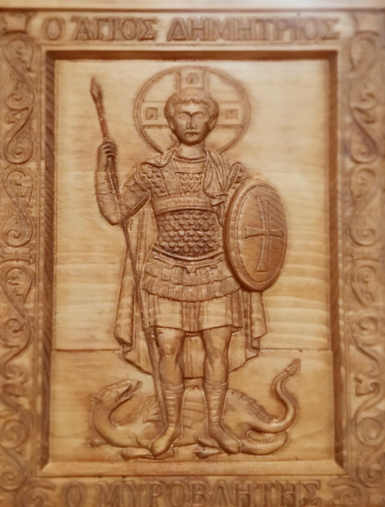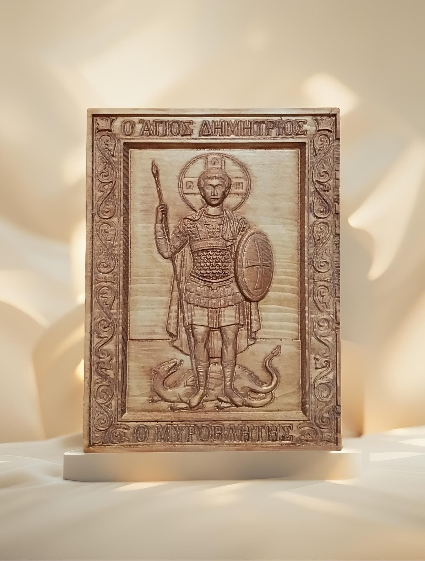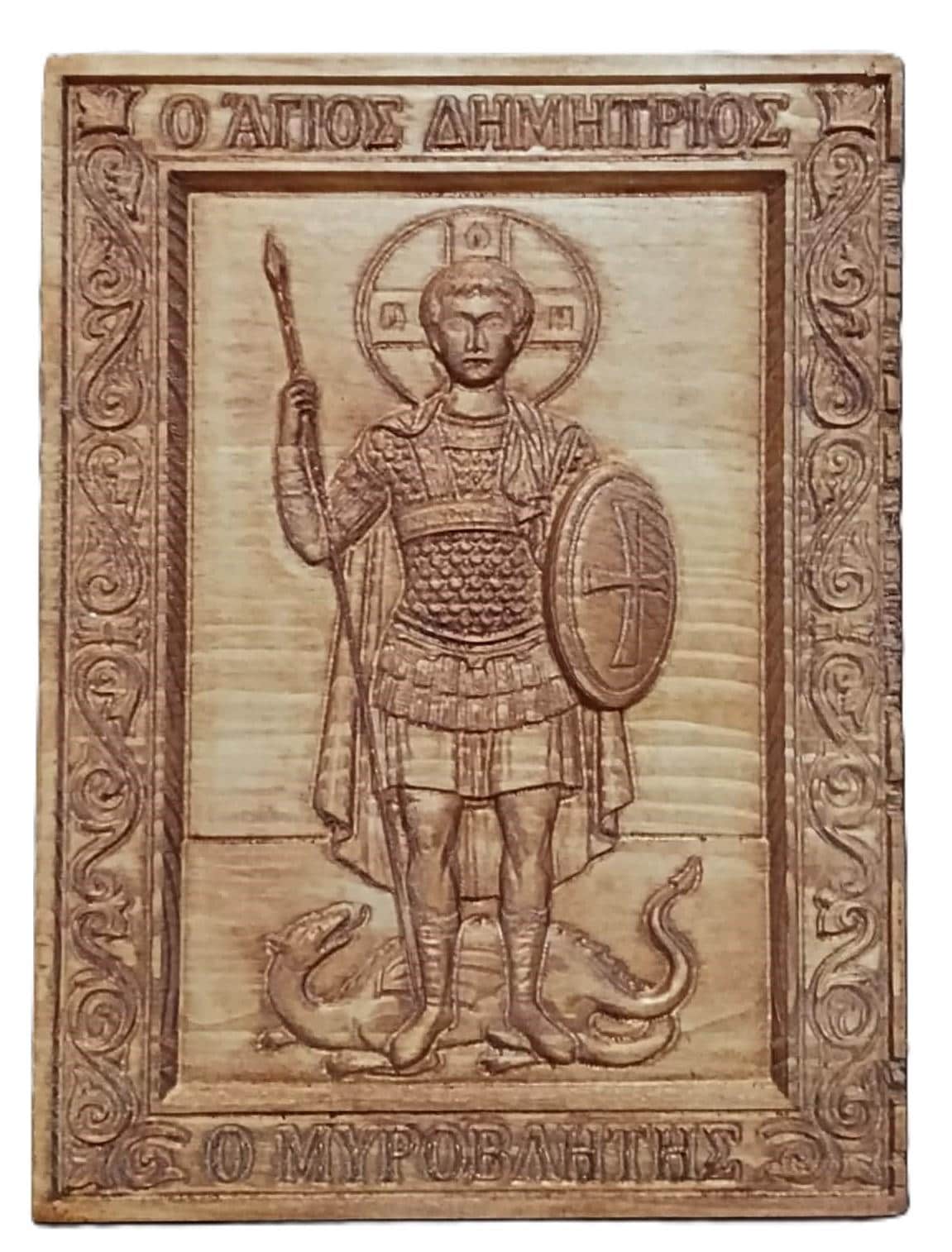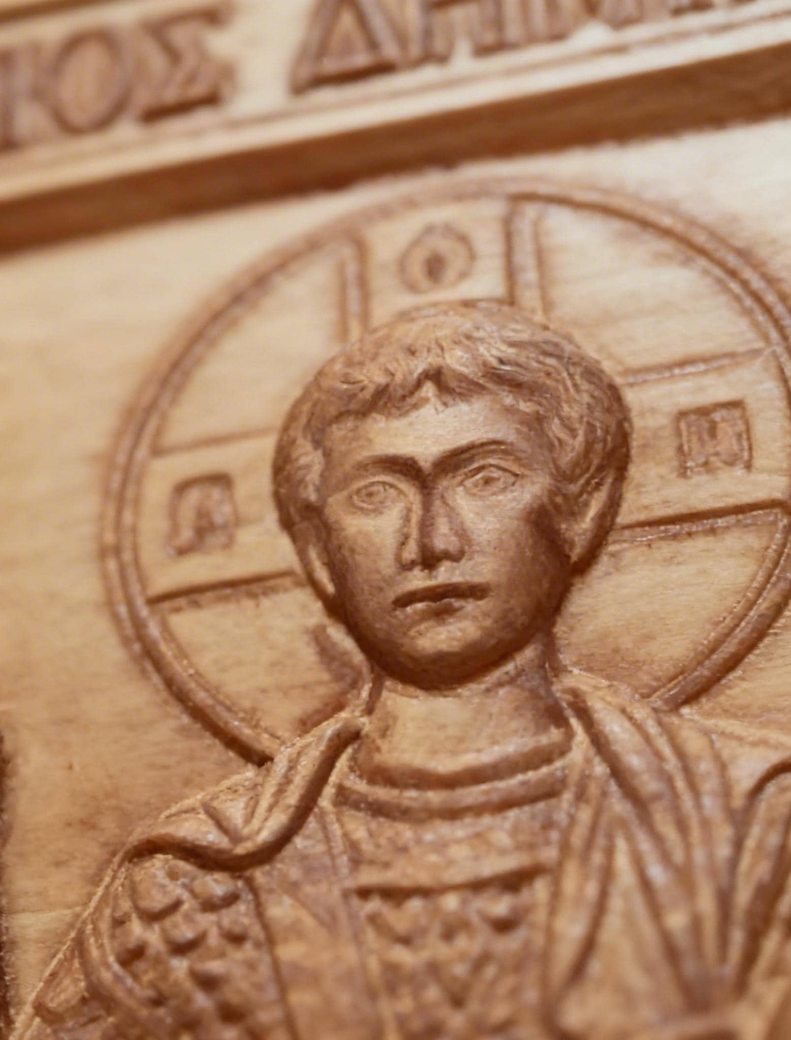 Handmade wood carved icon of Saint Demetrios (Saint Demetrius), crafted with precision and respect to Orthodox Christian tradition.
