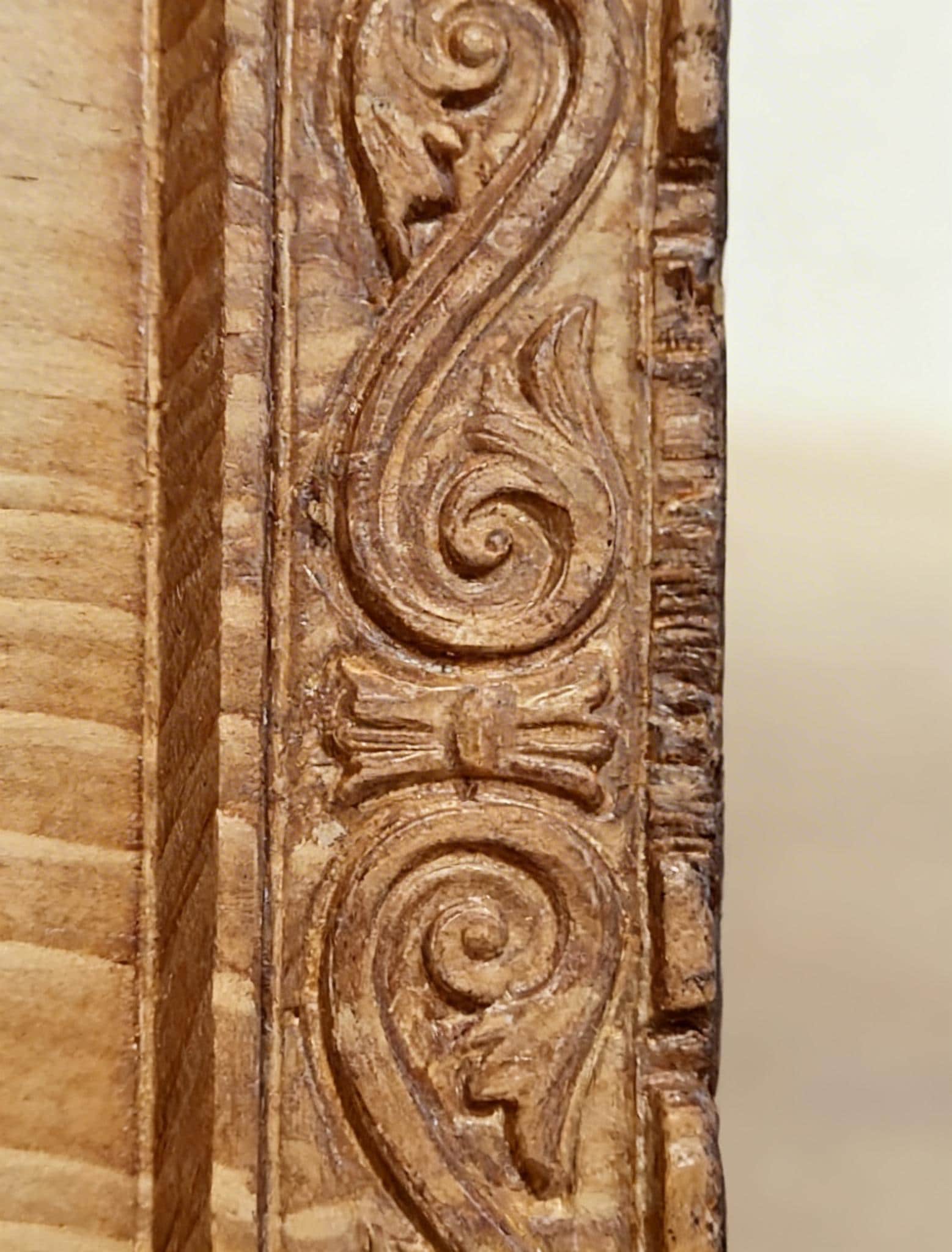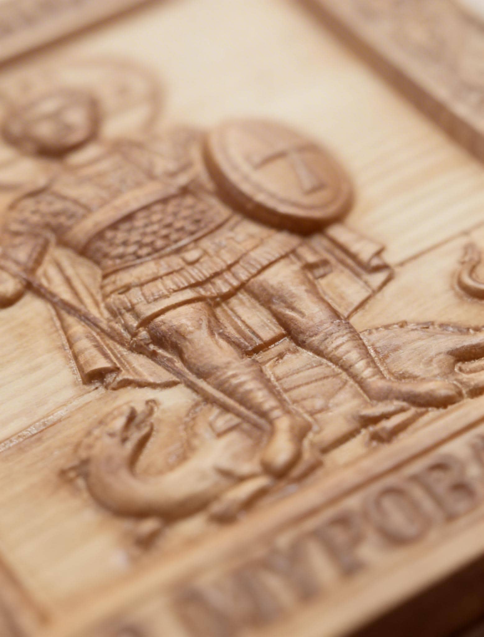 This piece features a detailed relief carving of the Saint as a warrior, symbolizing strength, faith, and protection.